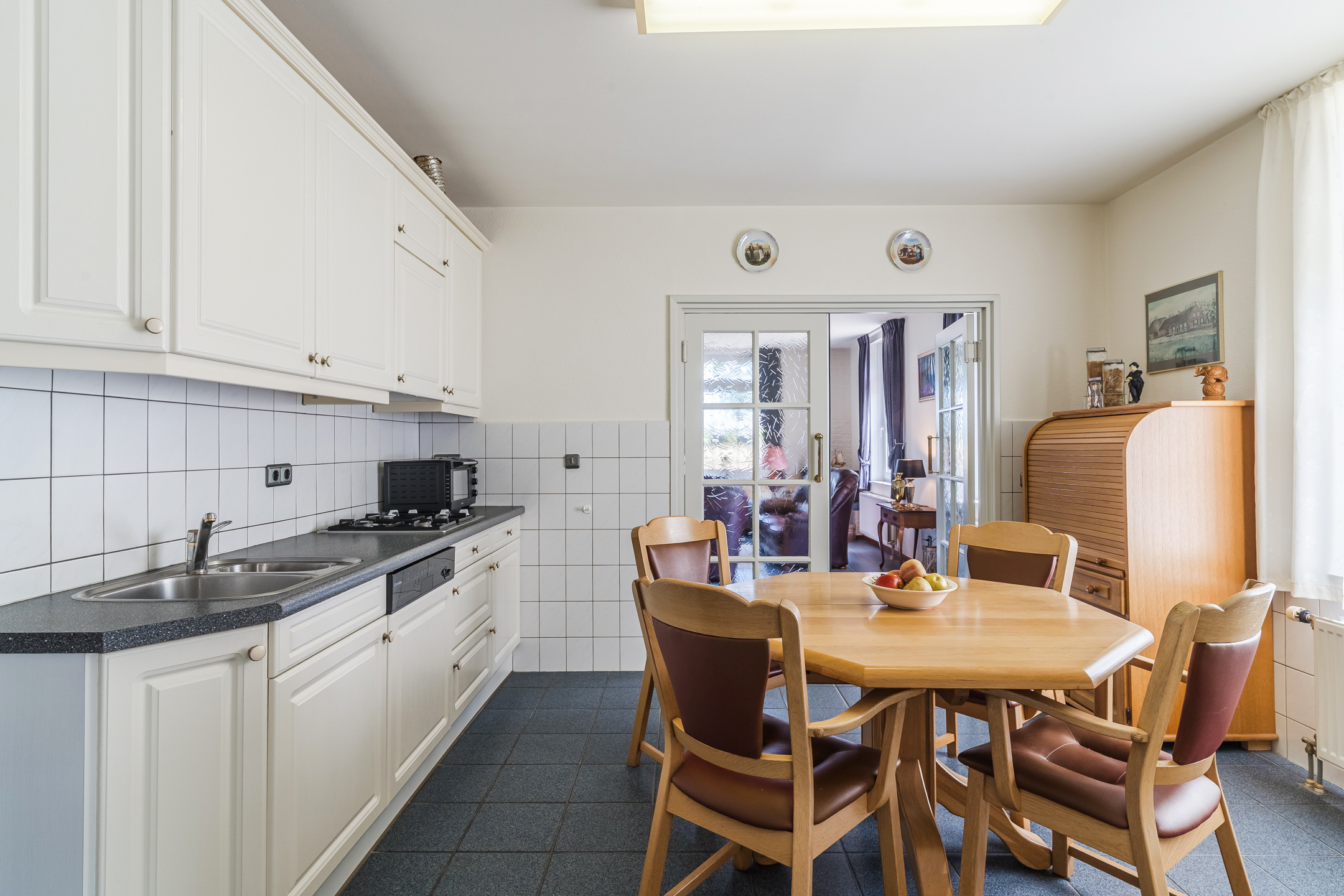 Approx. 15.5 m², tiled flooring with underfloor heating, partly tiled walls, plastered ceiling, and two parallel kitchen units equipped with a 4-burner gas hob, extractor hood, 1.5 sink, refrigerator, combination microwave, dishwasher, and deep pantry under the stairs.