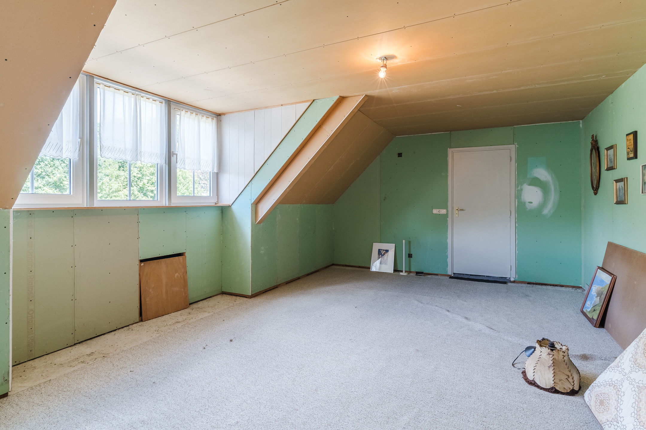 Approx. 34.5 m², carpet flooring, plastered walls and ceiling, with dormer window. Access to 3 bedrooms, storage room and unfinished bathroom.
