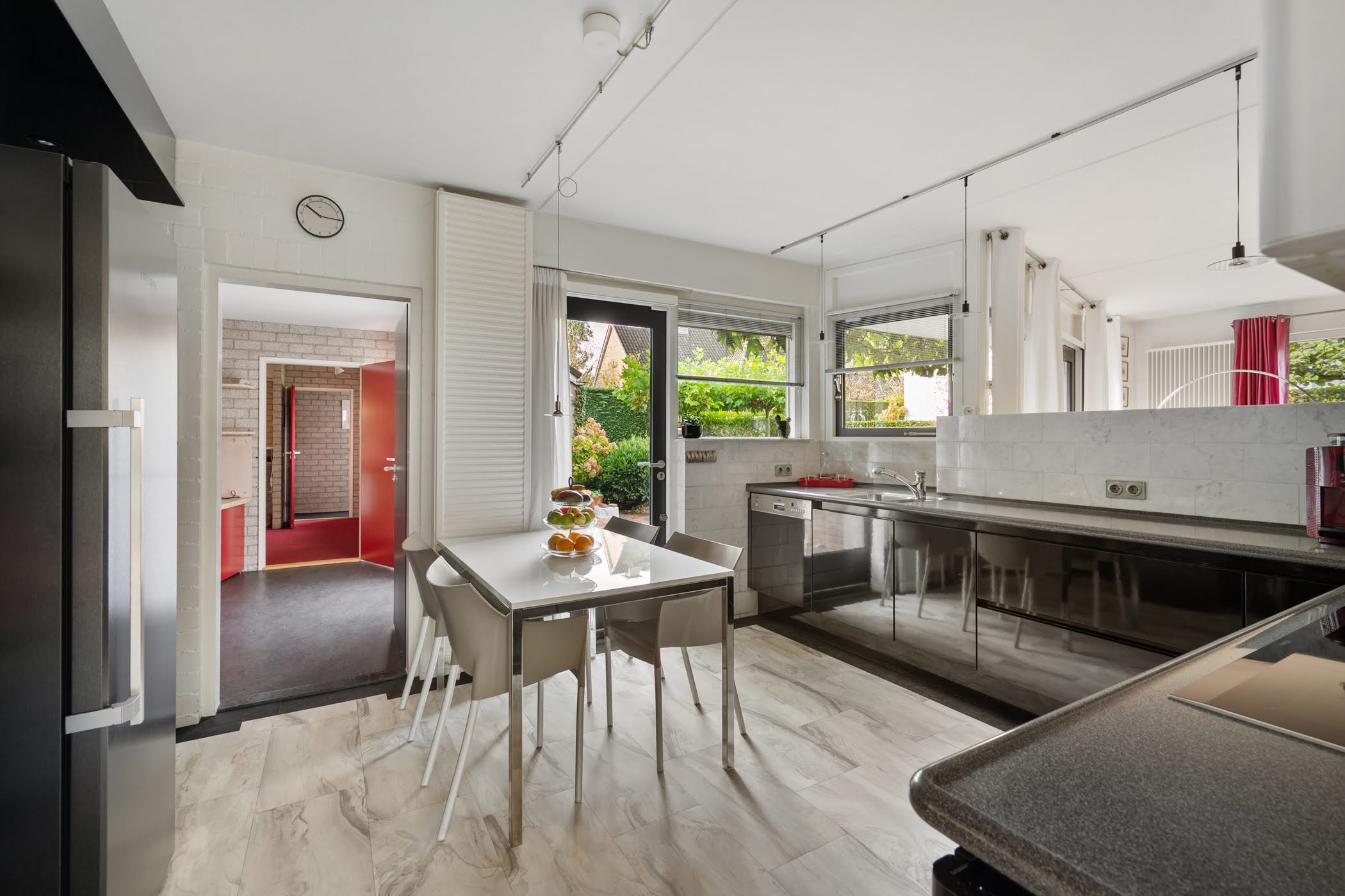 The kitchen is centrally located and equipped with a double sink with mixer tap, dishwasher, extractor hood, and combi oven. The kitchen also provides access to the multifunctional space and the spacious garage.