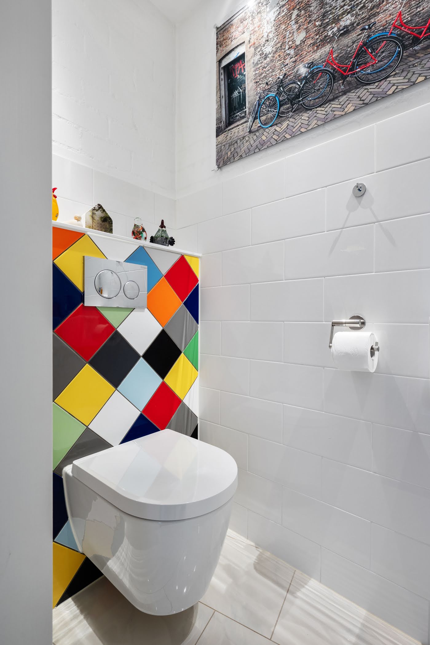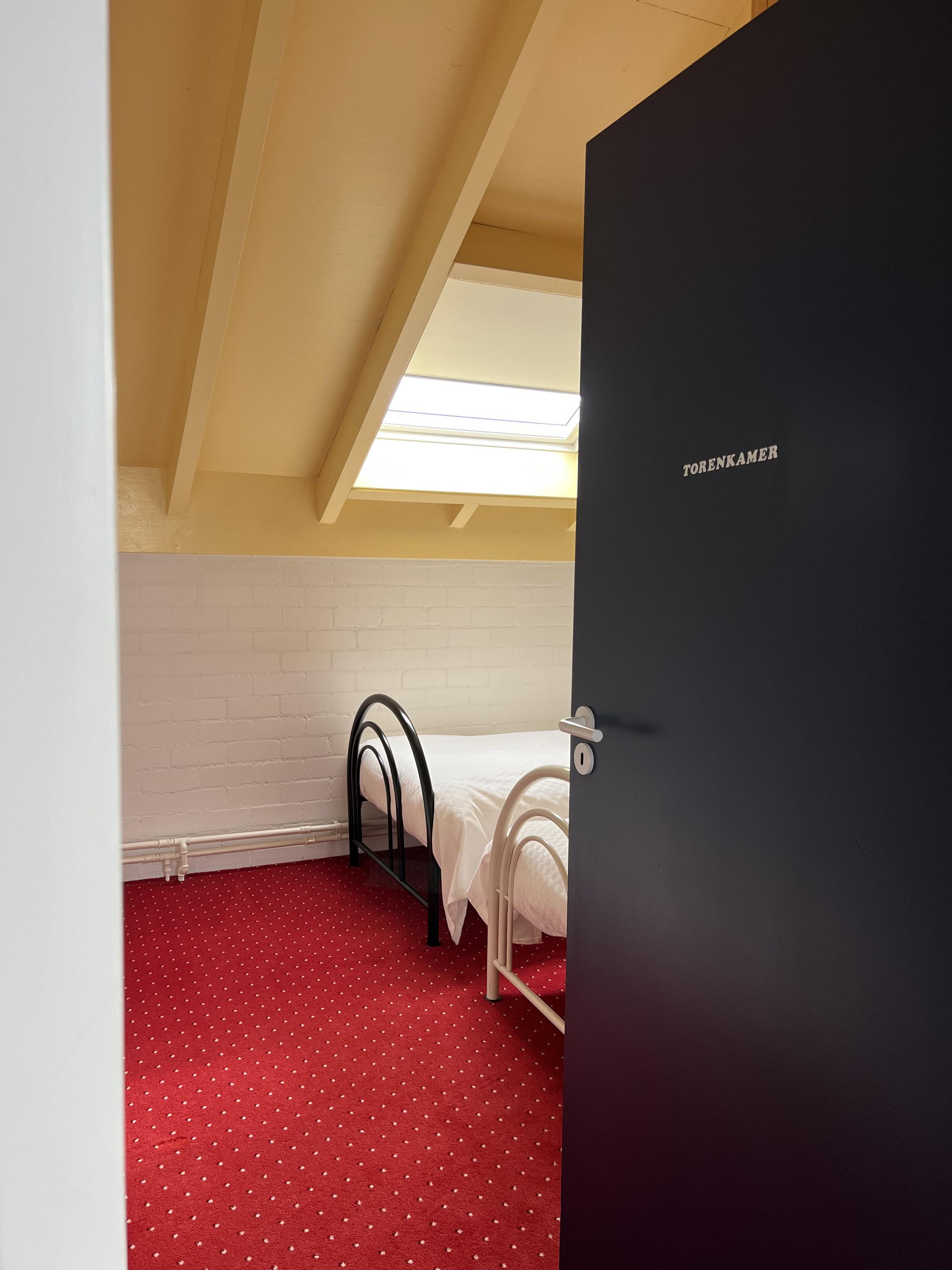 On the landing, there is a separate toilet and a second bathroom with shower, washbasin, shelf, and mirror.