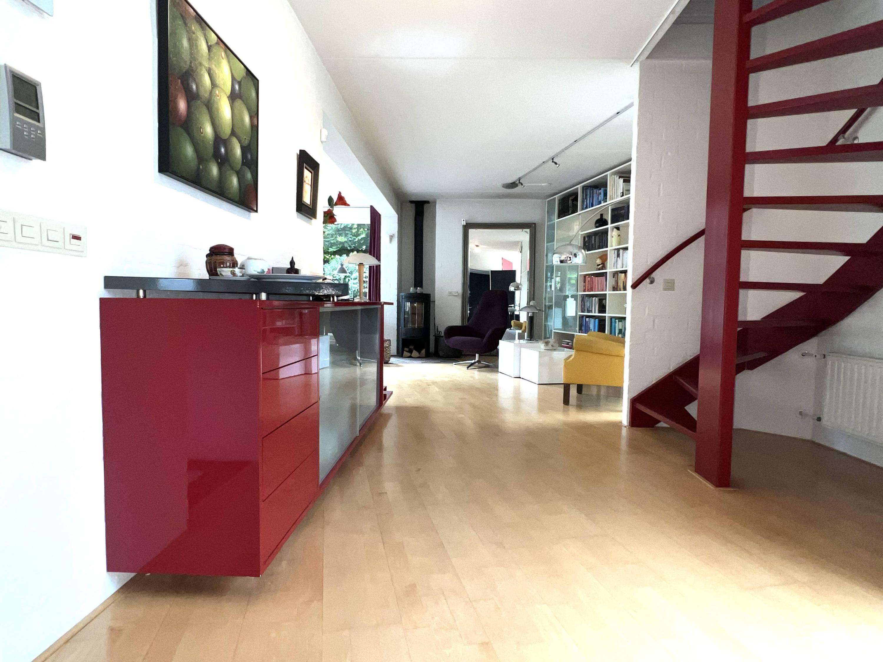 A very spacious villa (330 m²) designed by an architect with a truly unique character. With 6 bedrooms, 2 bathrooms, and an indoor multifunctional space (64–76 m²) with its own entrance. Quietly located, accessible from a child-friendly, low-traffic square. You can park your car in your own generous parking space.