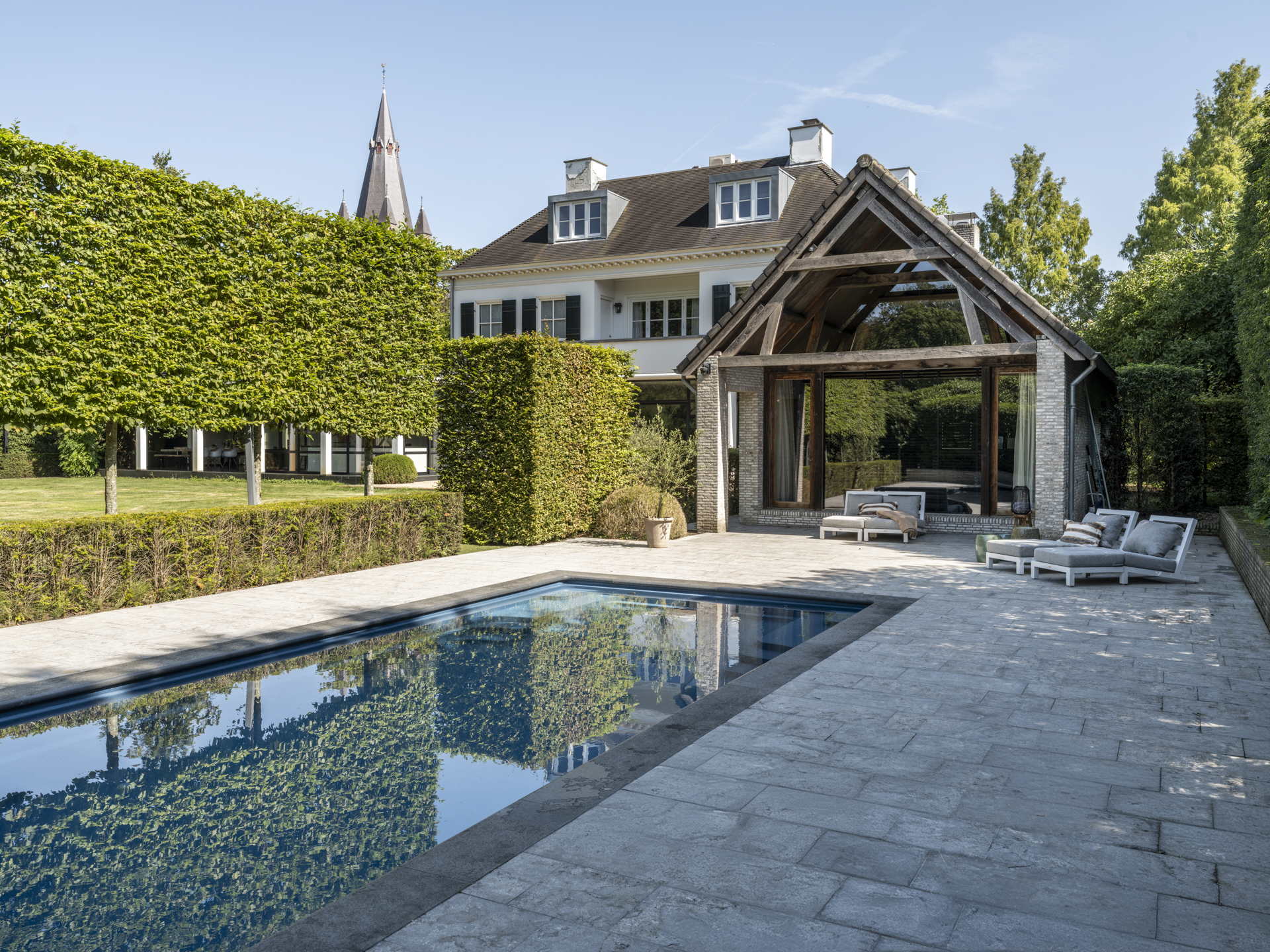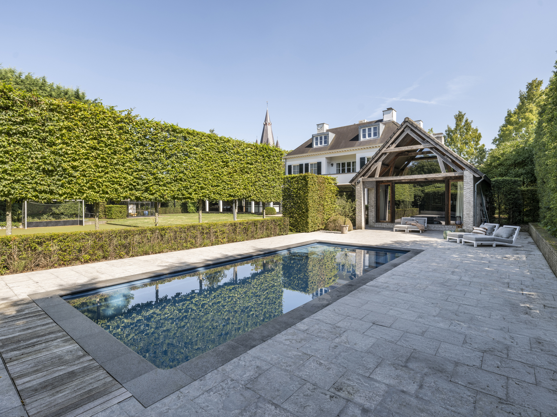 The swimming pool is slightly hidden from view by a hedge. From the kitchen, you can access the spacious covered terrace, where you feel transported to the south of France. Sheltered from rain or hot sun, you enjoy a wonderful view over the beautiful garden, where children can play on the synthetic grass hockey field. A drainage system has been installed in the garden.