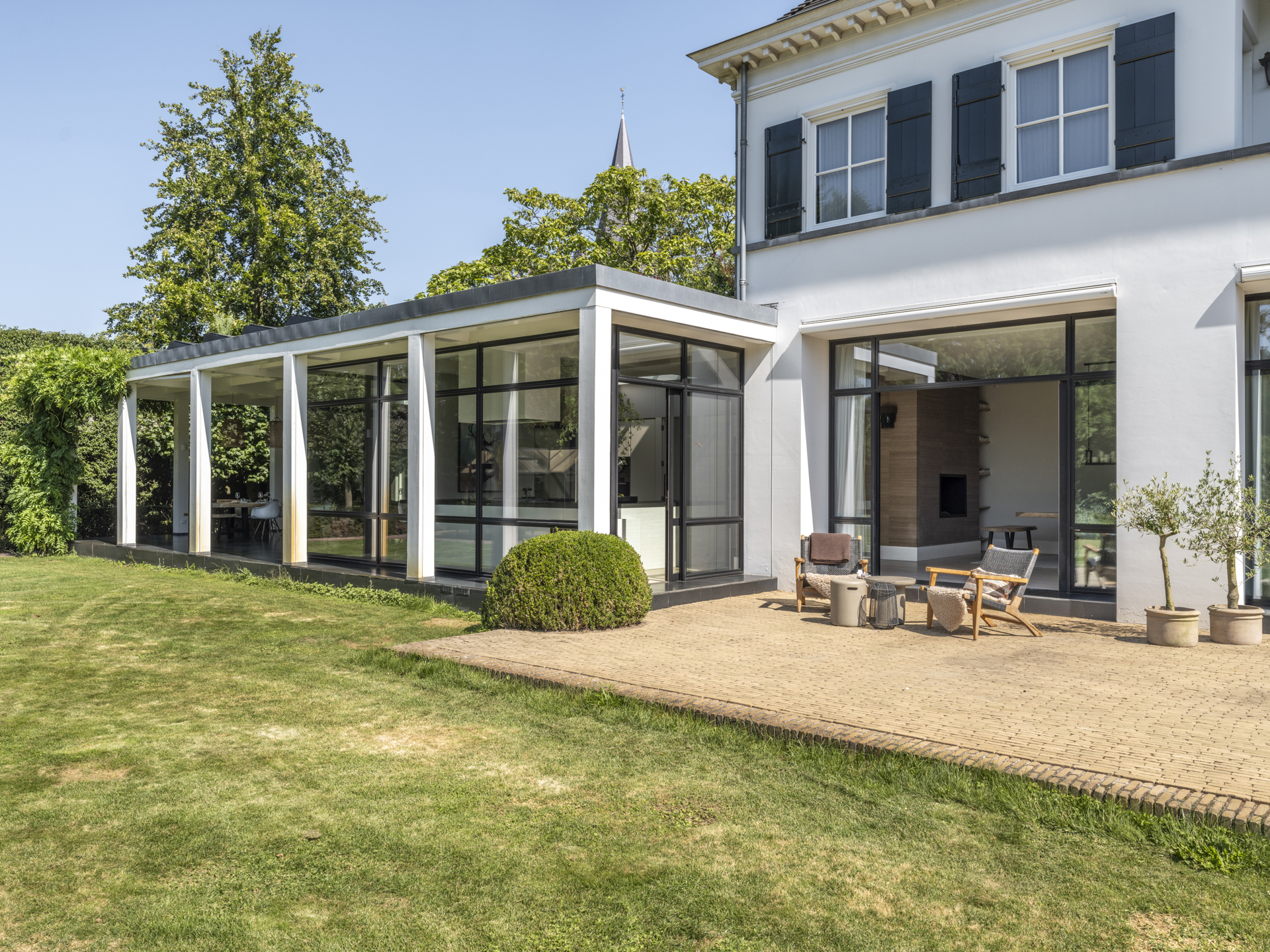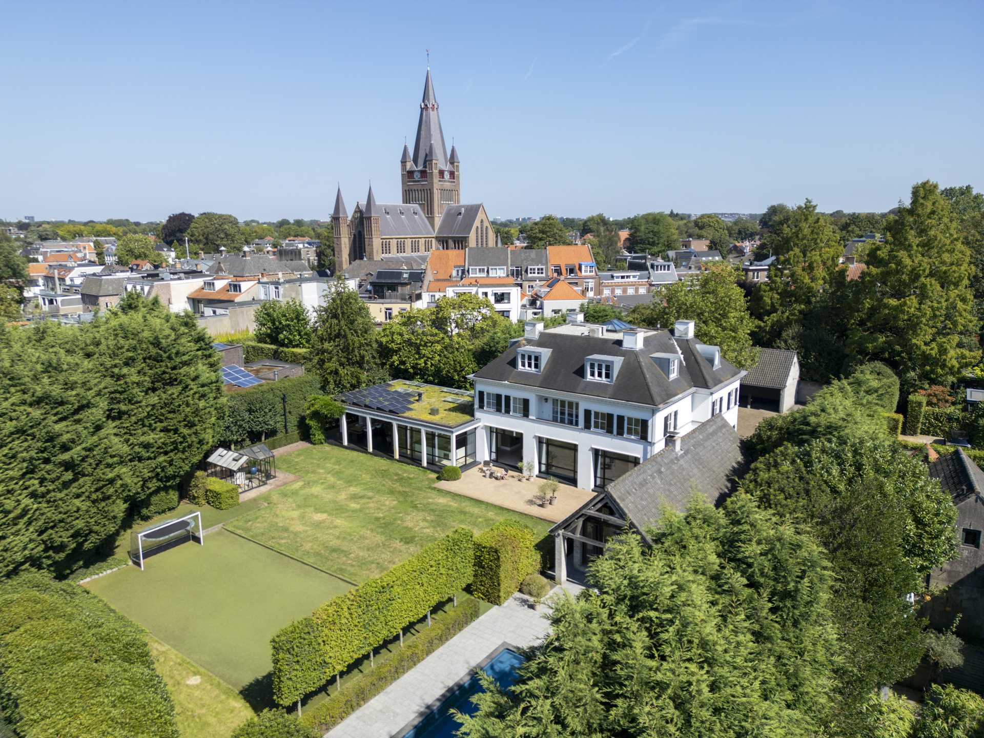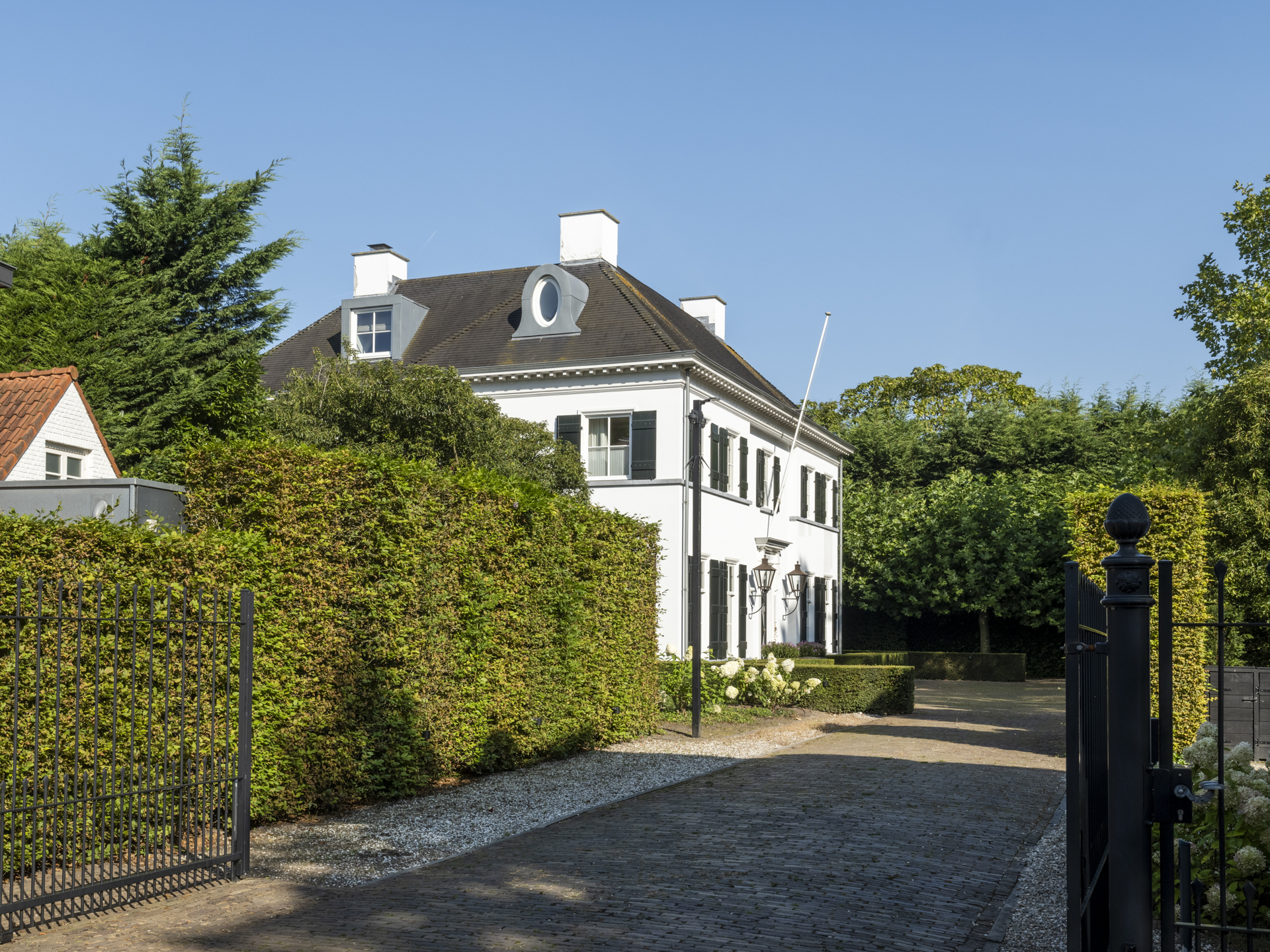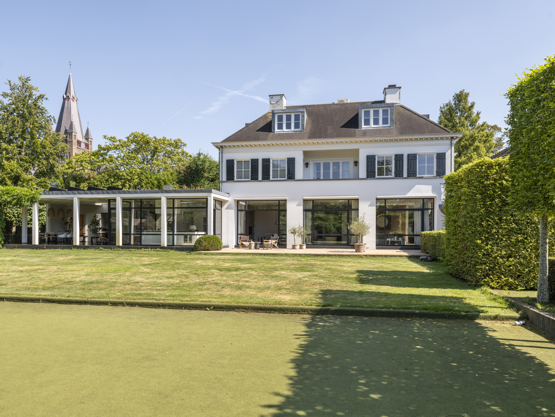 Behind the gate, you will discover the courtyard with plane trees and a wooden shed for 4 cars. The 850 m² large mansion was built in 2011 and showcases a combination of classical and modern architecture, reflecting stately allure and maximum modern living comfort. In the summer, the approximately 3,200 m² secured plot allows you to enjoy the swimming pool, the (covered) terraces, and the spacious lawn, which includes a synthetic grass hockey field for the children. In the winter, the light-filled rooms facing the garden provide a cozy space of peace and comfort, right in the charming Ginneken.