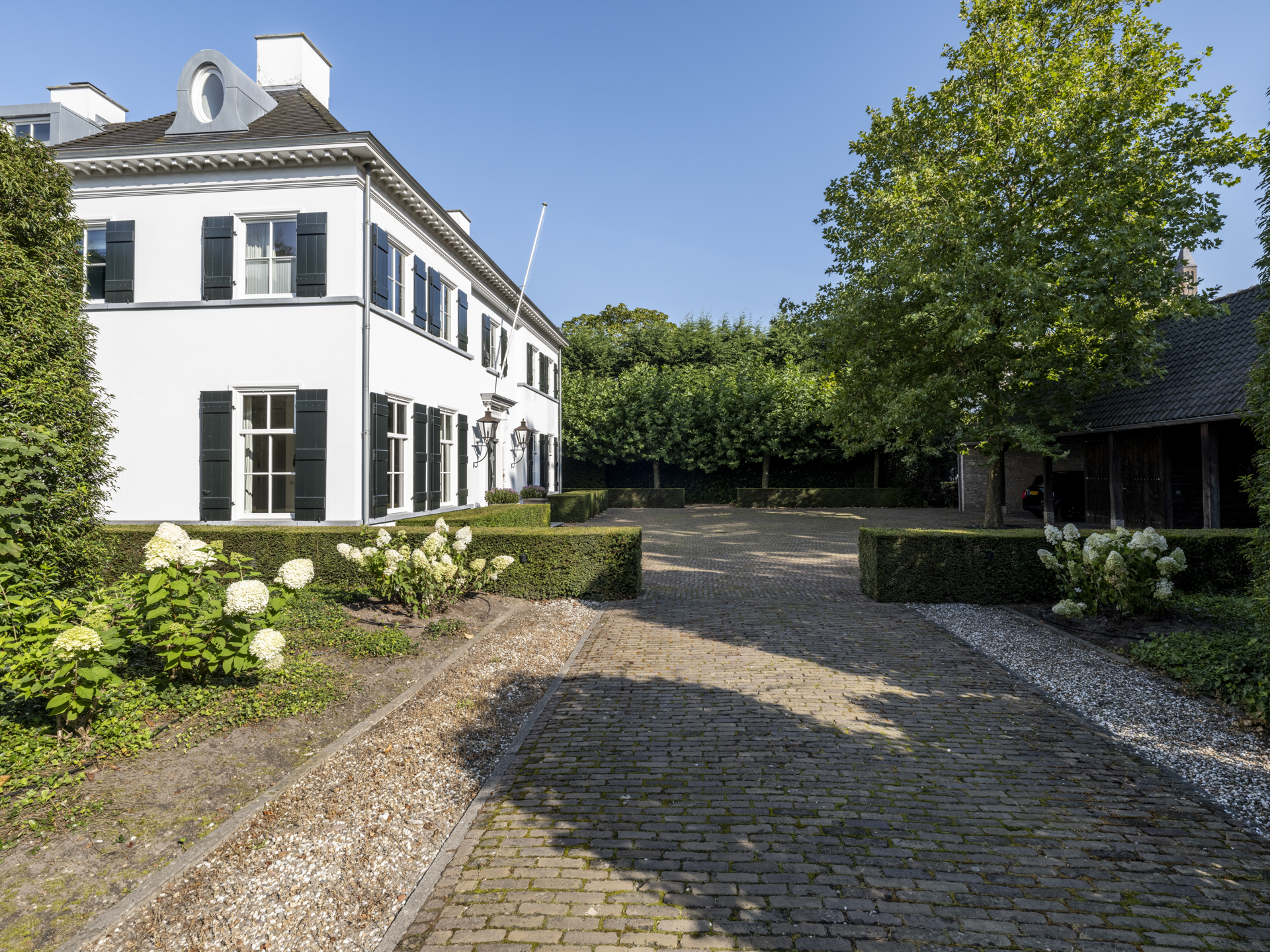 At the front, in the courtyard, you will find the “carriage house” with a beautiful (oak) roof structure, accommodating 4 cars. The front exudes the atmosphere of the charming, cozy Ginneken, while at the back, you can enjoy the peace and greenery of a country villa. Sitting on the terrace and in the garden, you see nothing but greenery and beautiful skies; no surrounding buildings.