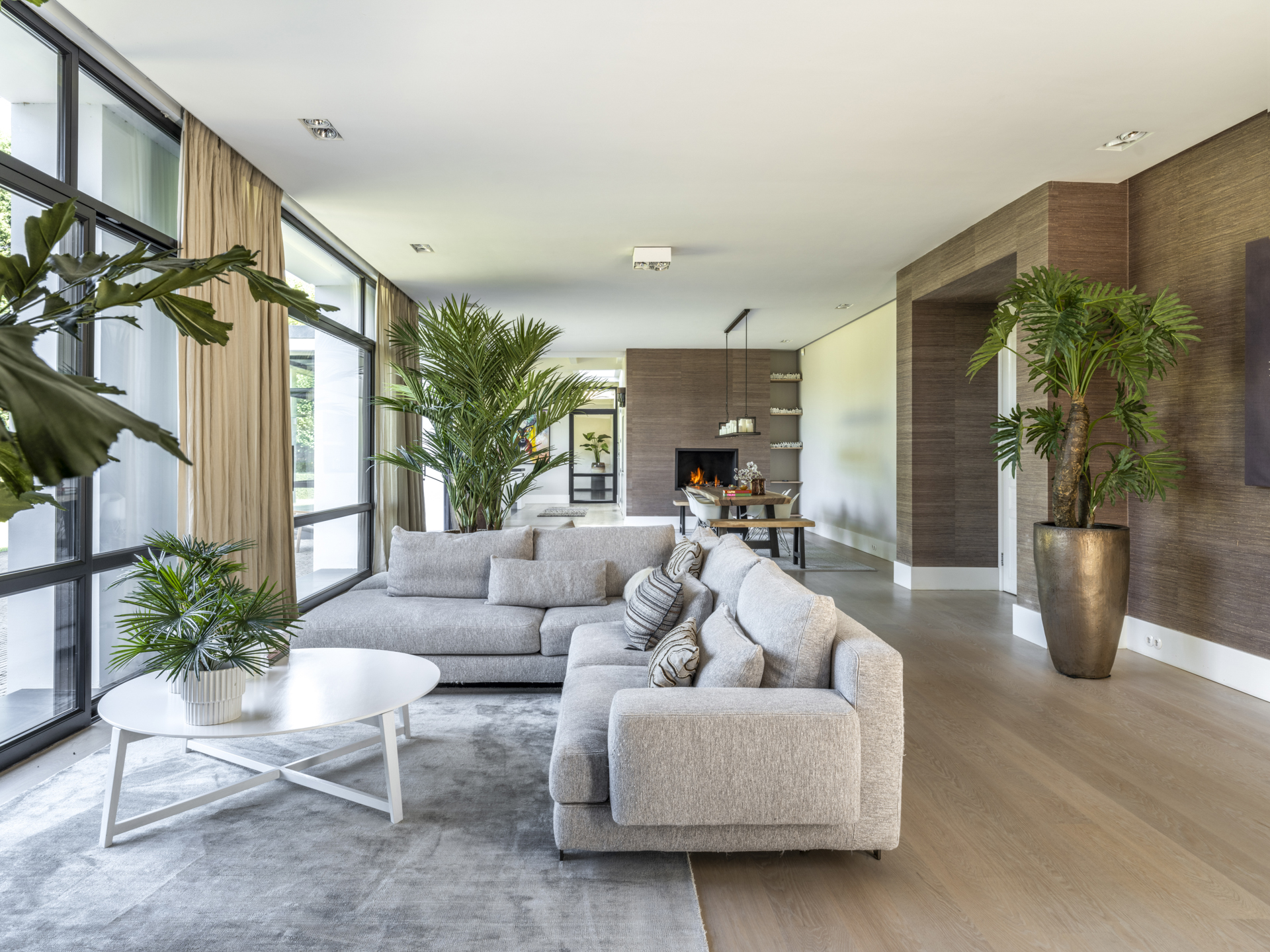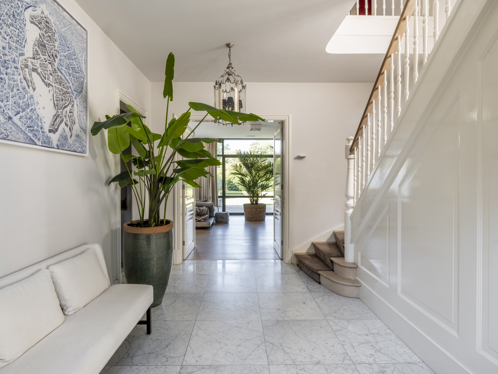 From the classic entrance, you can access the practical mudroom with a side entrance and the living and dining room. This bright and open living space connects two side wings and features beautiful light and a lovely view of the entire garden. Activity and warmth are centered around the kitchen (with an adjacent spacious and practical utility room) and the covered terrace. At the front, adjacent to the living area, you will find a separate TV/work room overlooking the courtyard.