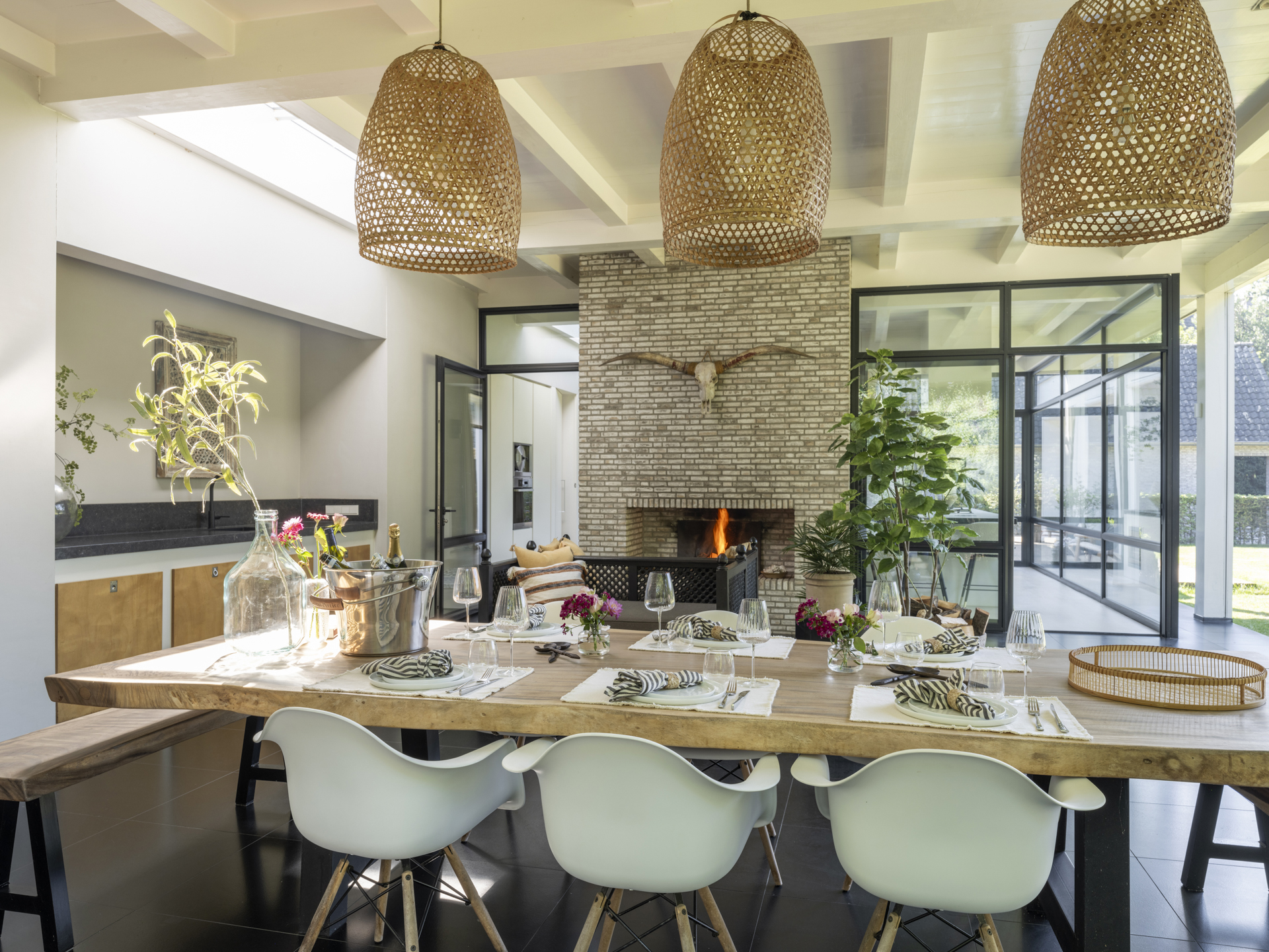 Adjacent to the kitchen is the generous, fully covered terrace, the veranda. This veranda, like the kitchen, is equipped with screens and is effectively an extension of the living area, featuring a cozy open fireplace. Next to the veranda is the (outdoor) bathroom with a toilet and shower.