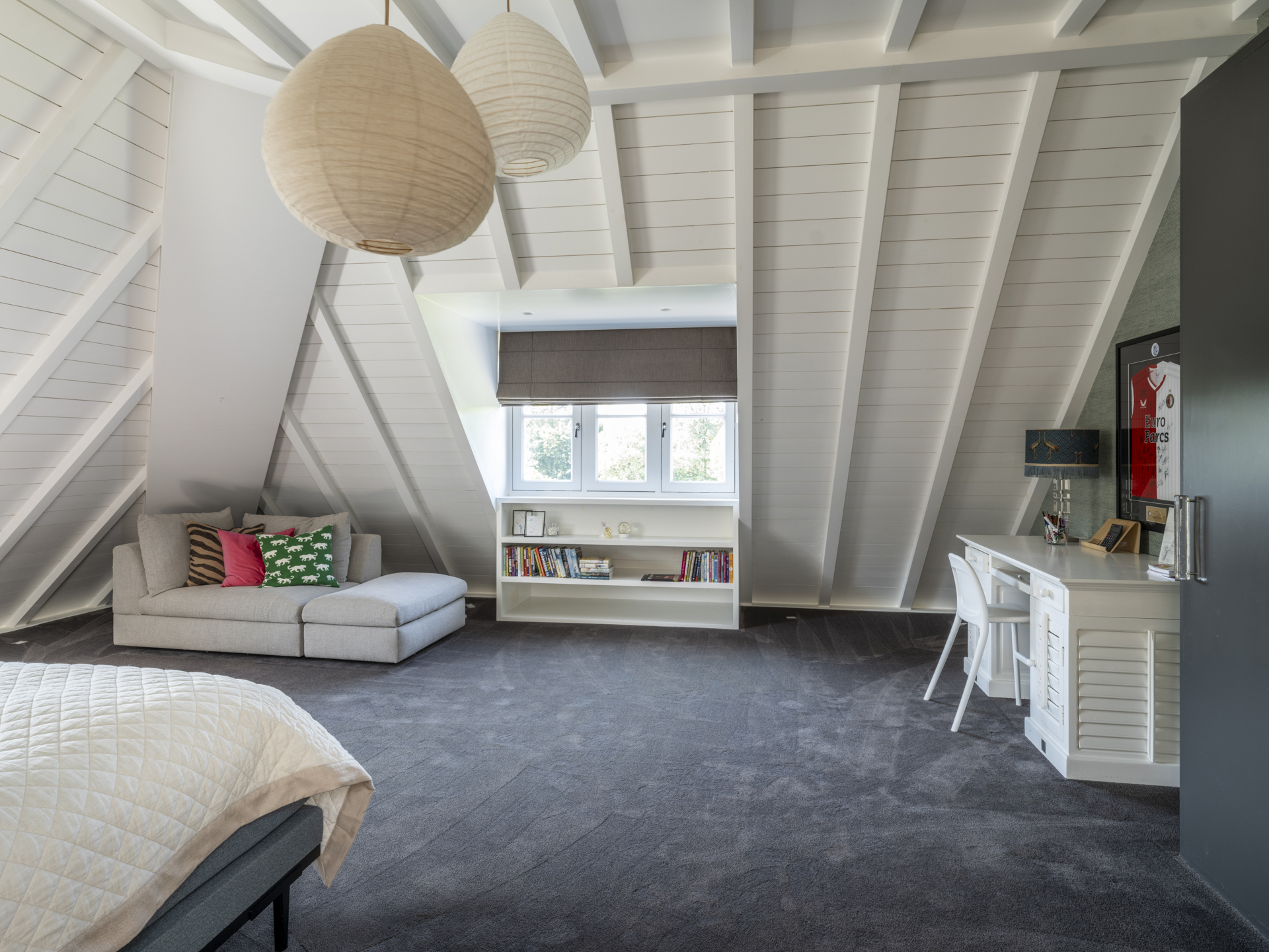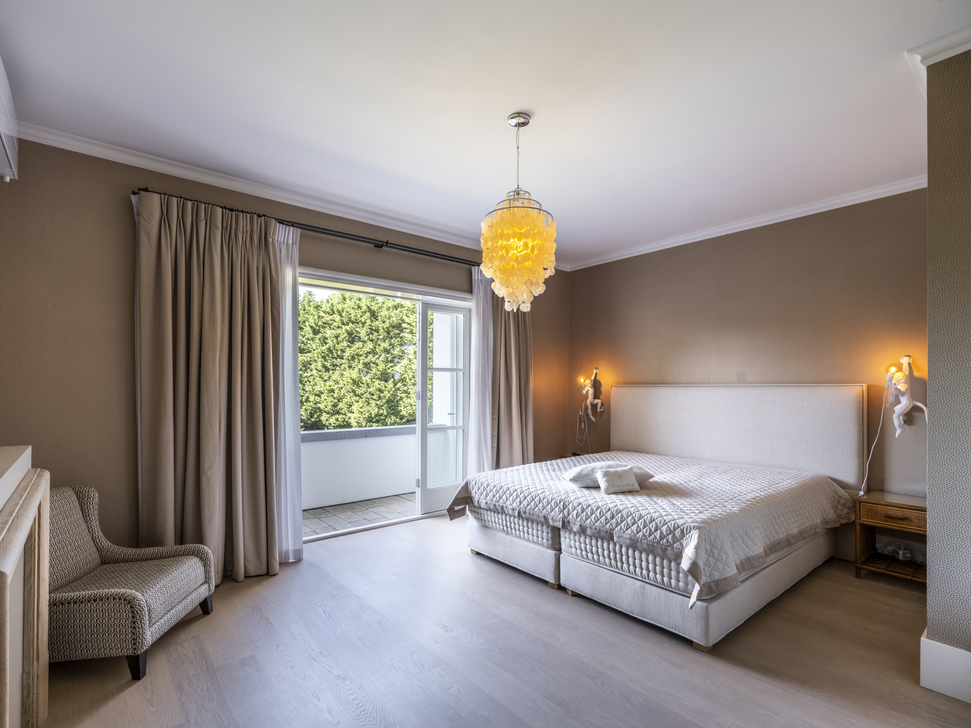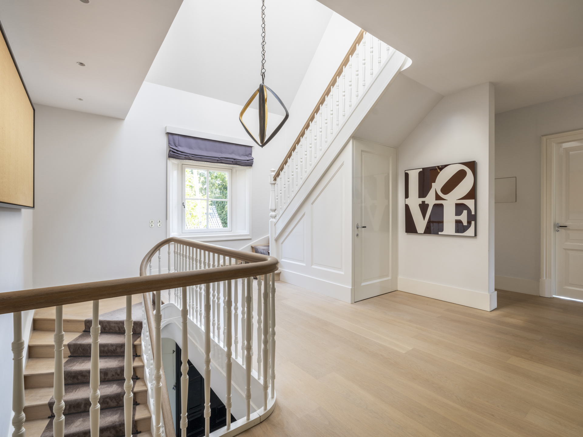 Via a wide staircase and spacious landing, you can reach the master bedroom (with balcony and view of the garden). The adjacent dressing room is openly connected to the master bathroom.