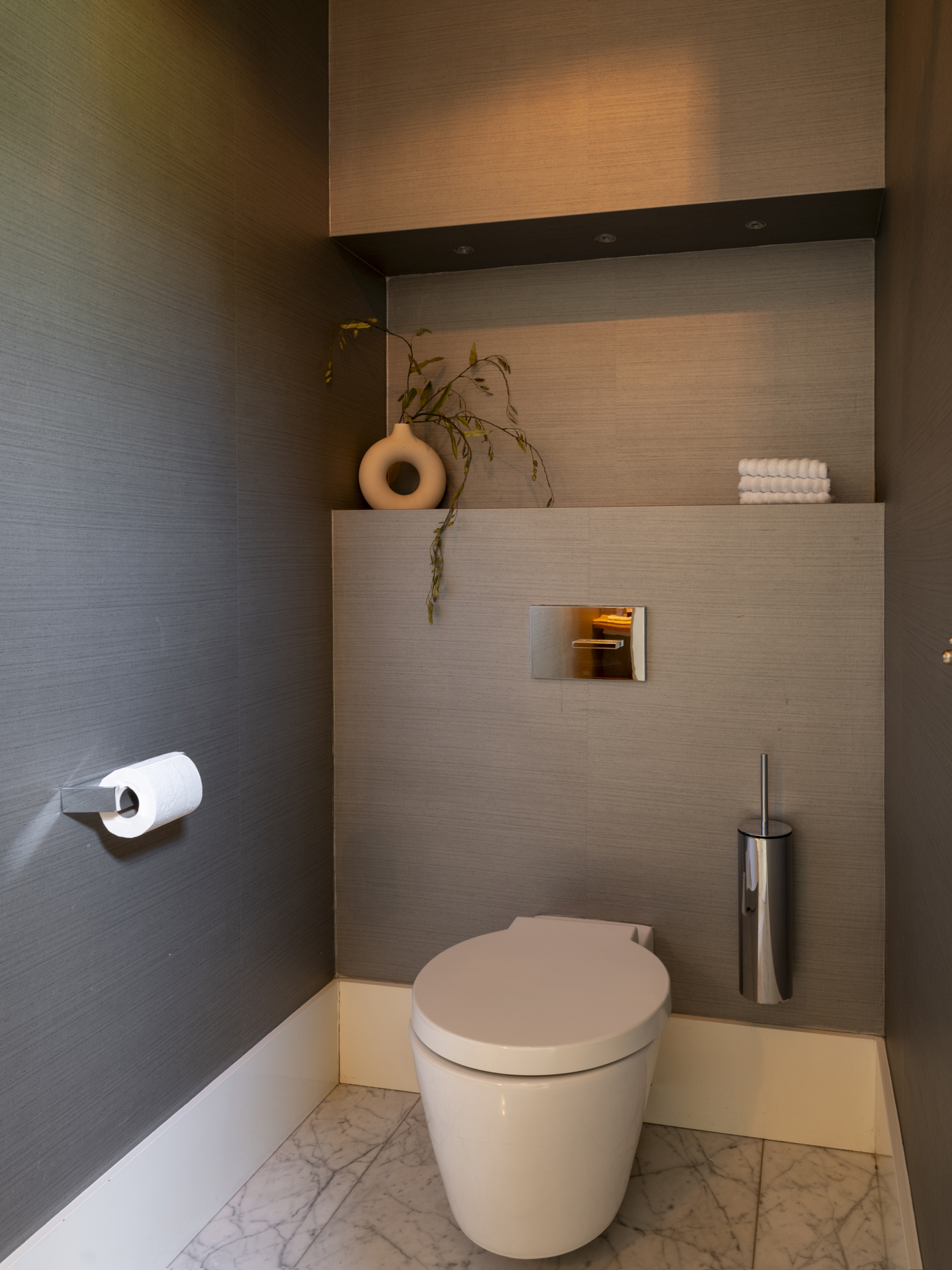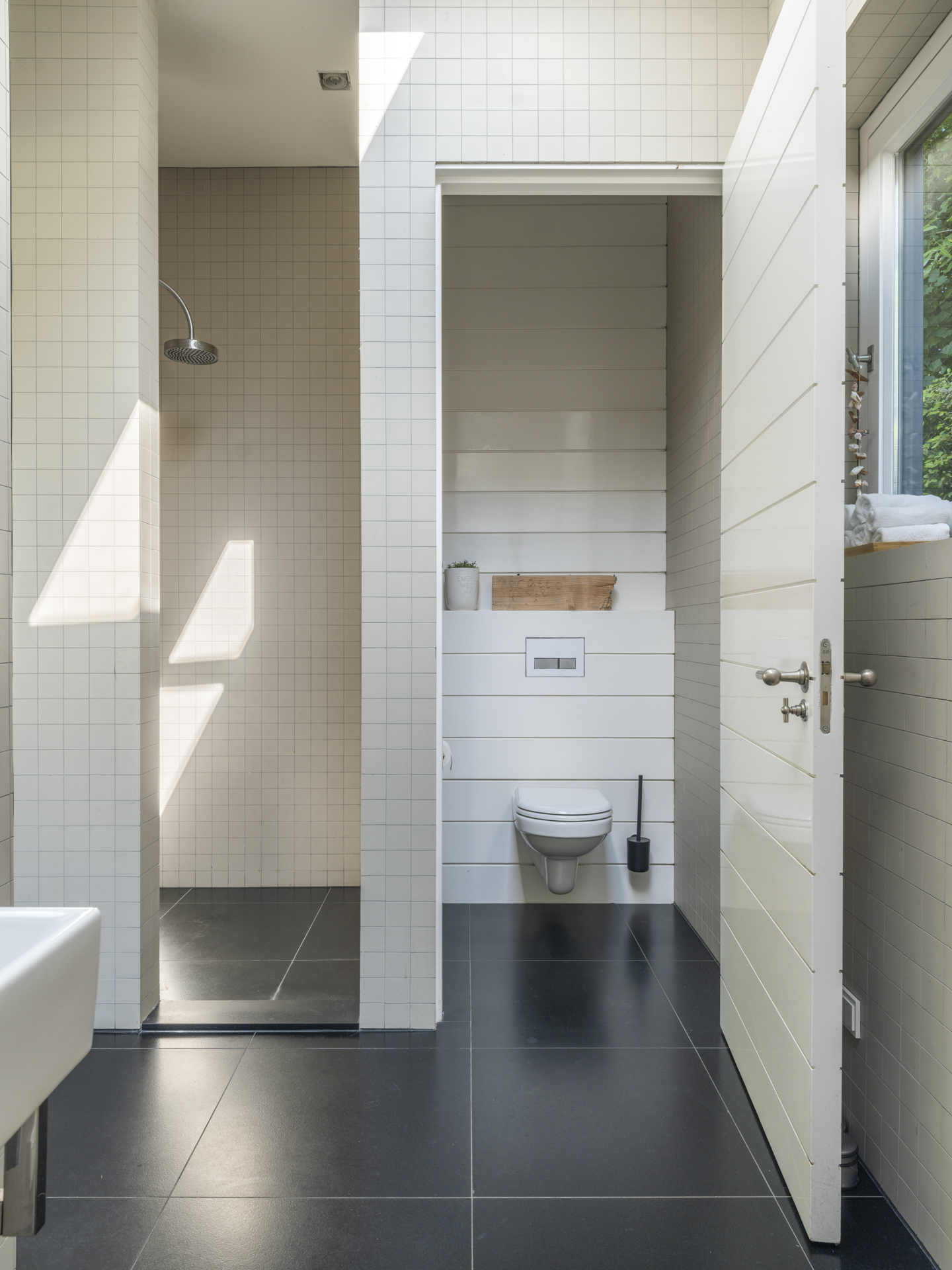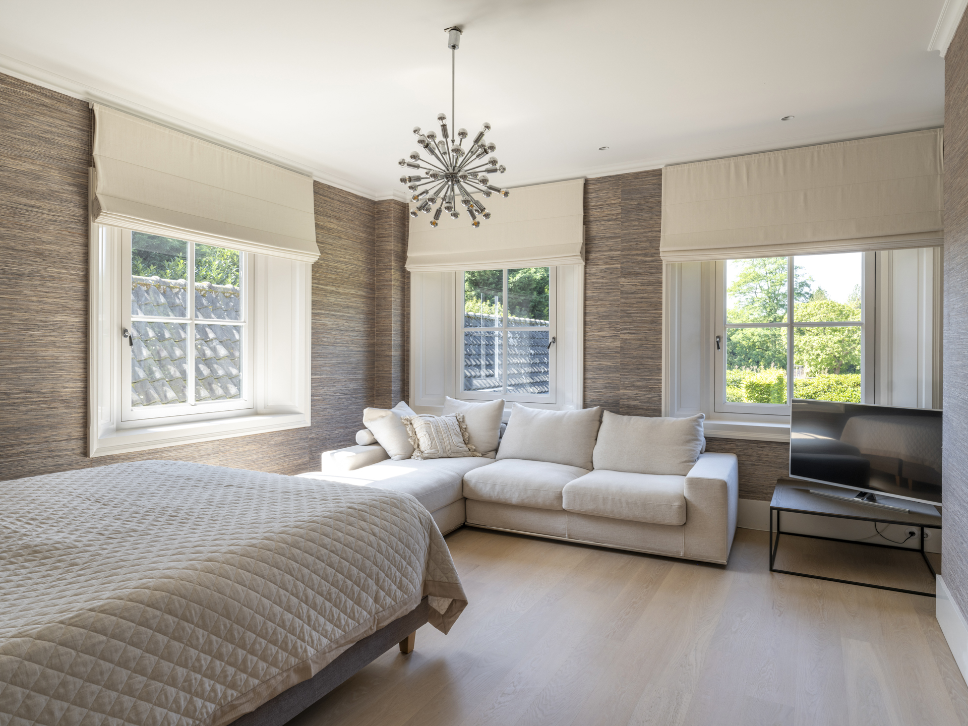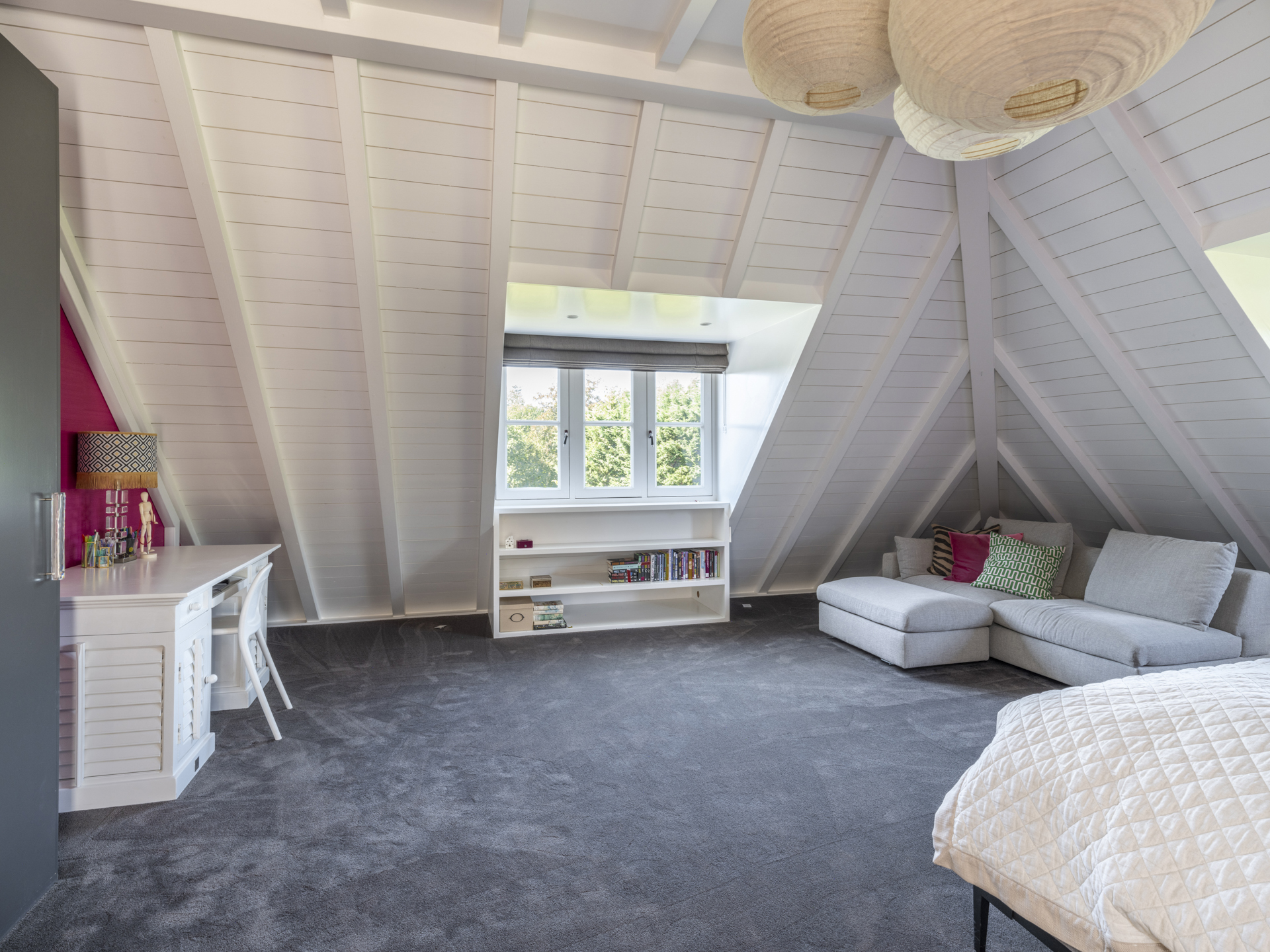 Via a wide staircase and spacious landing, you can reach the master bedroom (with balcony and view of the garden). The adjacent dressing room is openly connected to the master bathroom.