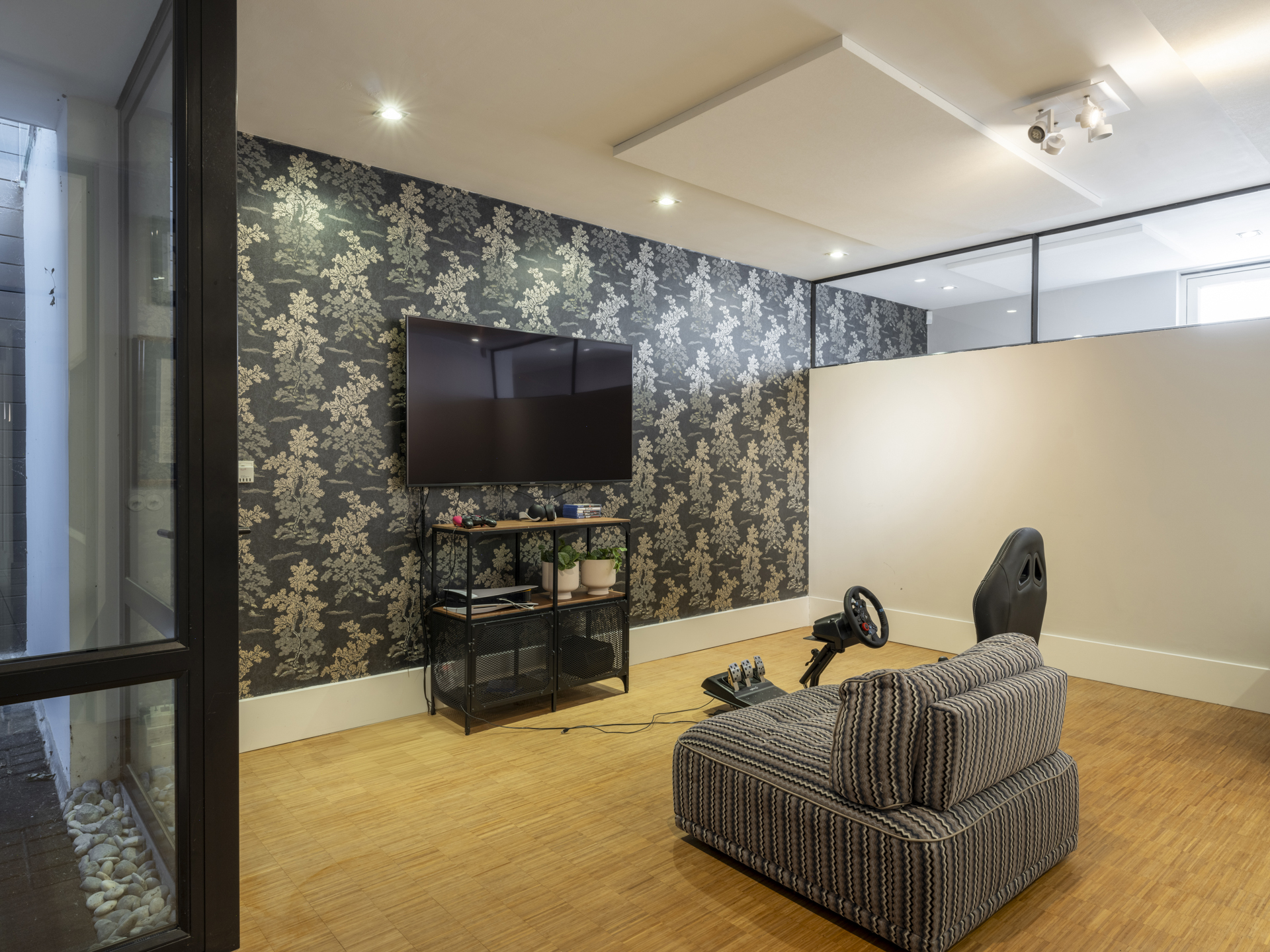 This basement, divided into two parts, can be accessed via the central hall or the study in the side wing. Here, you can work out in the fitness room, do laundry in the laundry/linen room, and watch movies or game in the TV room. This section also includes the technical room.