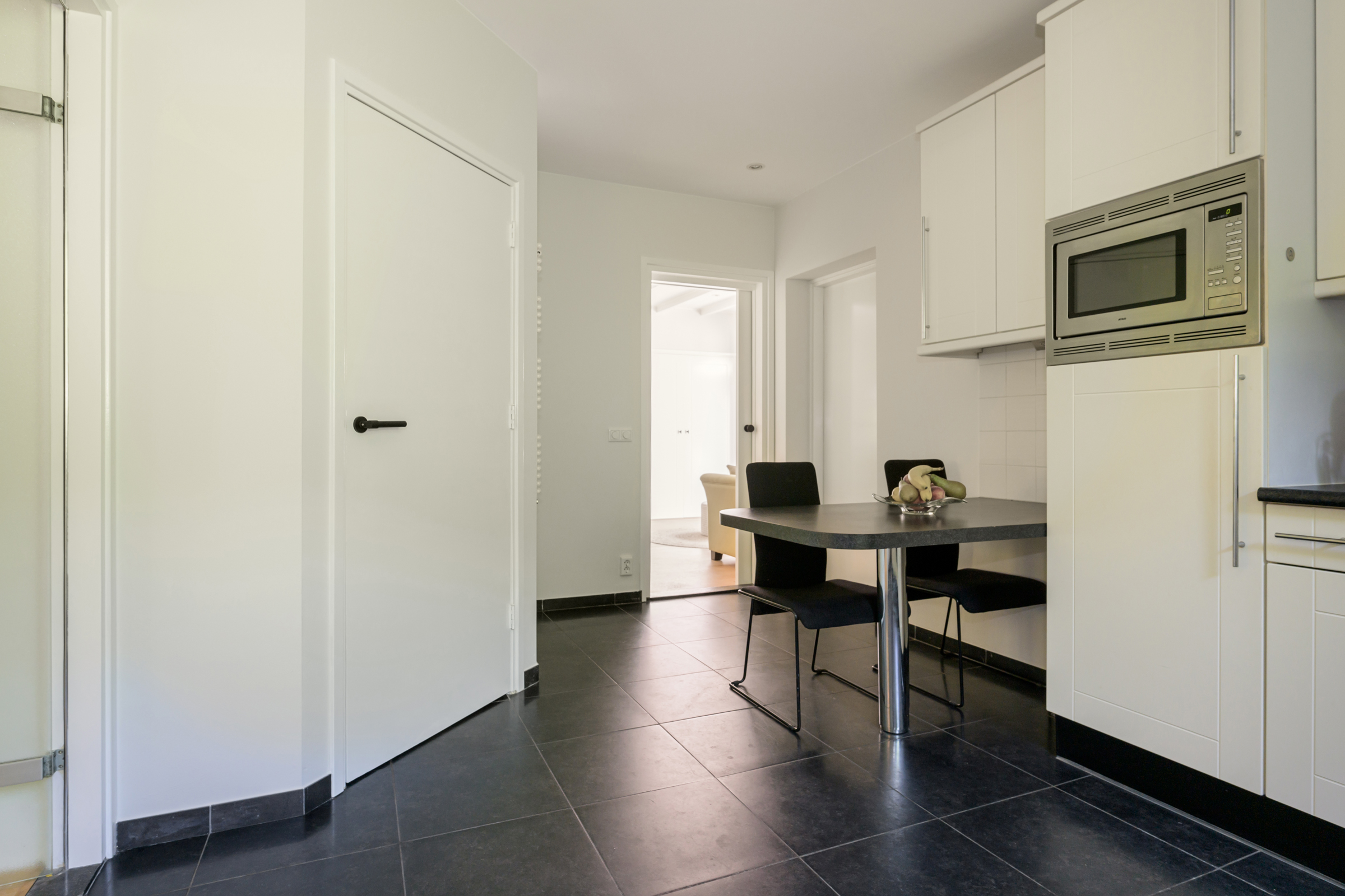 Utility room with (anthracite) tiled floor. Here you will find the connections for the washing machines, wall cabinets, and extra space for a refrigerator or freezer.