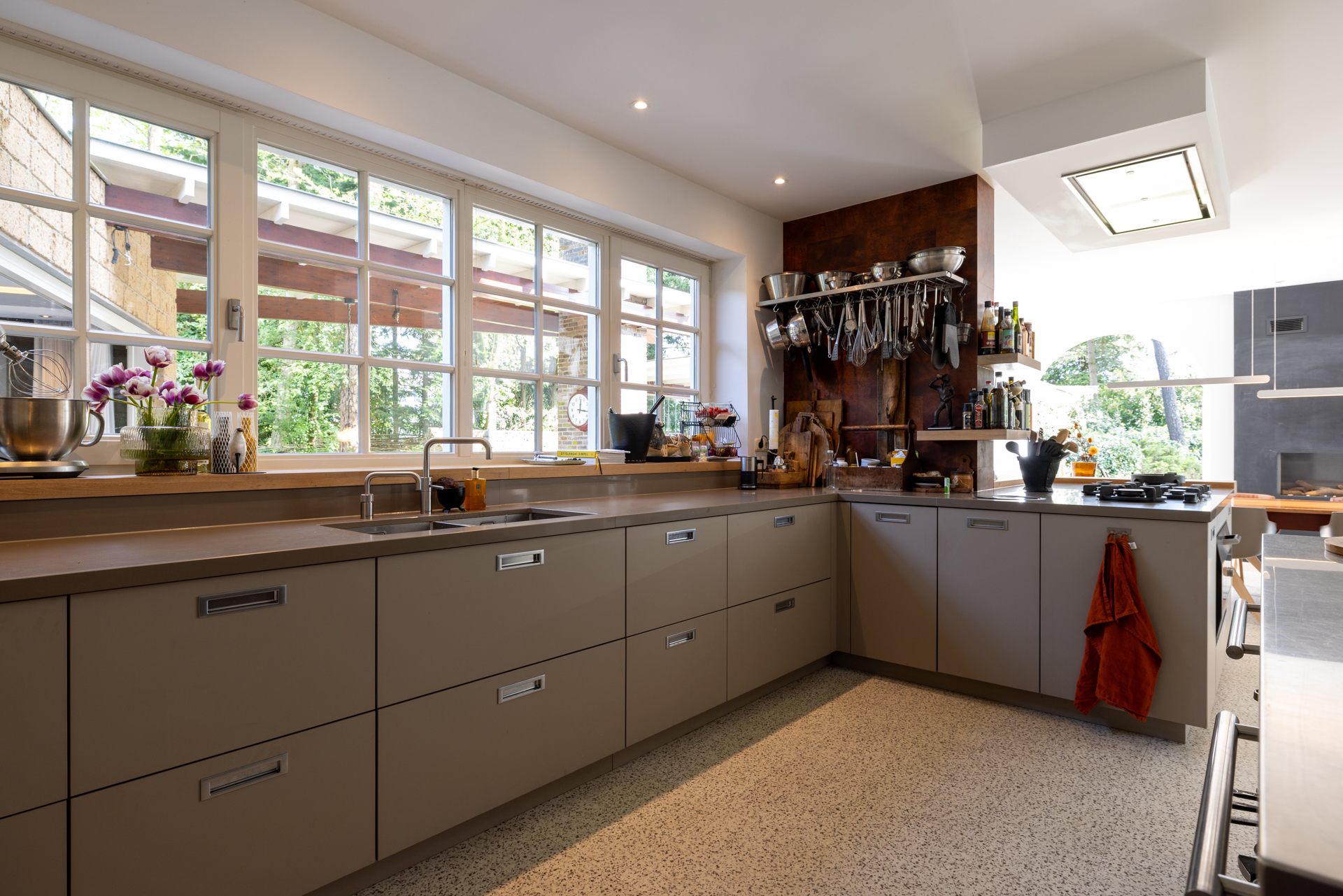 The kitchen has a gas fireplace, spacious dining area and double doors to the garden. This gives a nice connection with the garden and the outdoor kitchen. Here you bring the outside in.