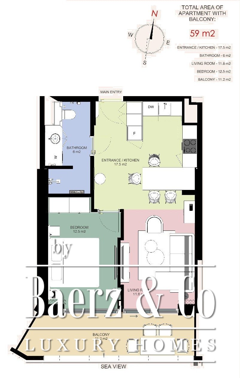 Apartment Budva presents an elevated approach to effortless coastal living, designed for those who seek comfort, tranquility, and panoramic vistas. The apartment offers 59 m² of thoughtfully planned space, featuring an entrance hallway, an open-plan living room with kitchen and dining area, one bedroom, one bathroom, and a private terrace. Residents are greeted by sweeping sea views and majestic mountain scenery, creating a serene atmosphere that defines its appeal.