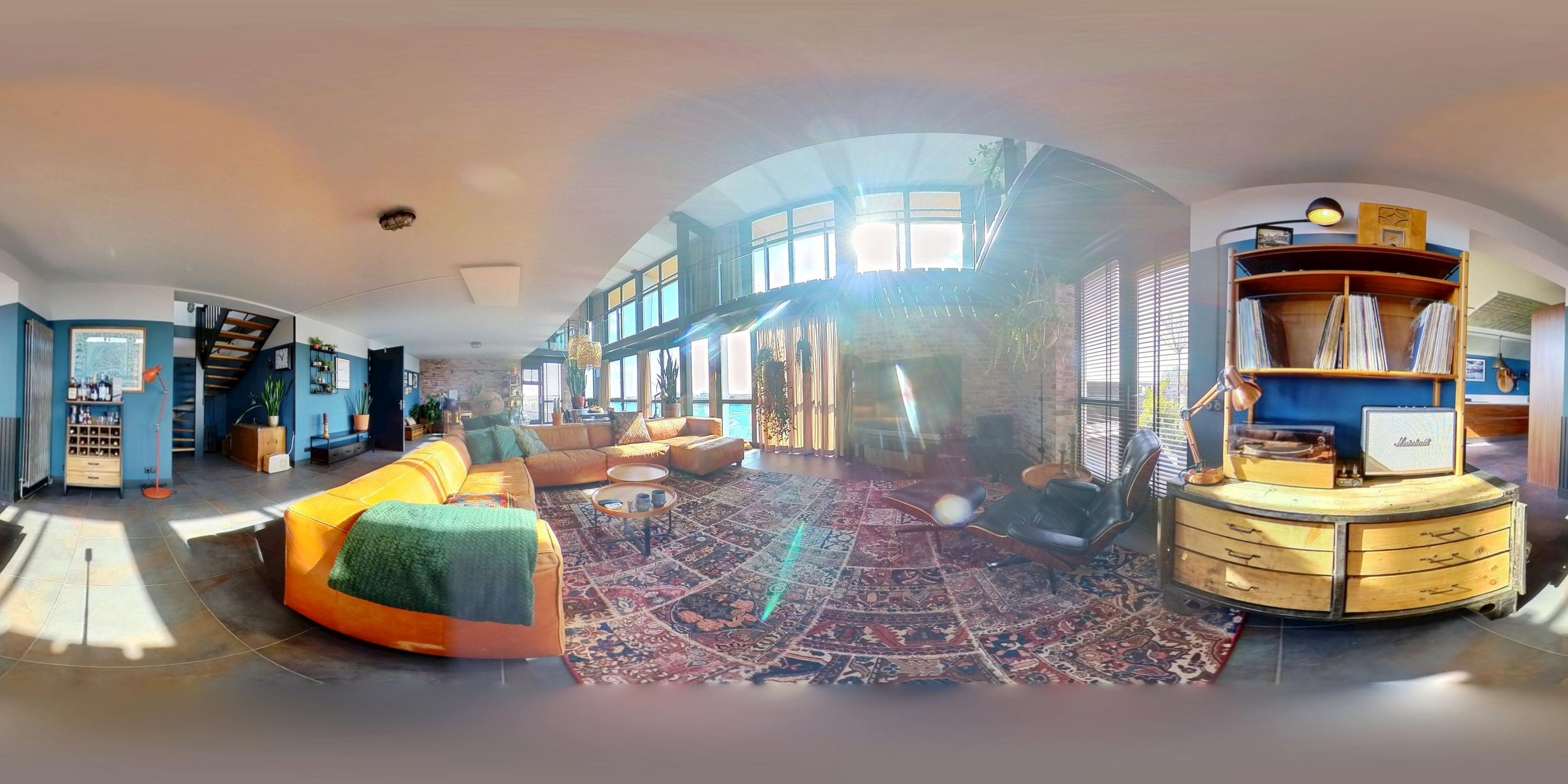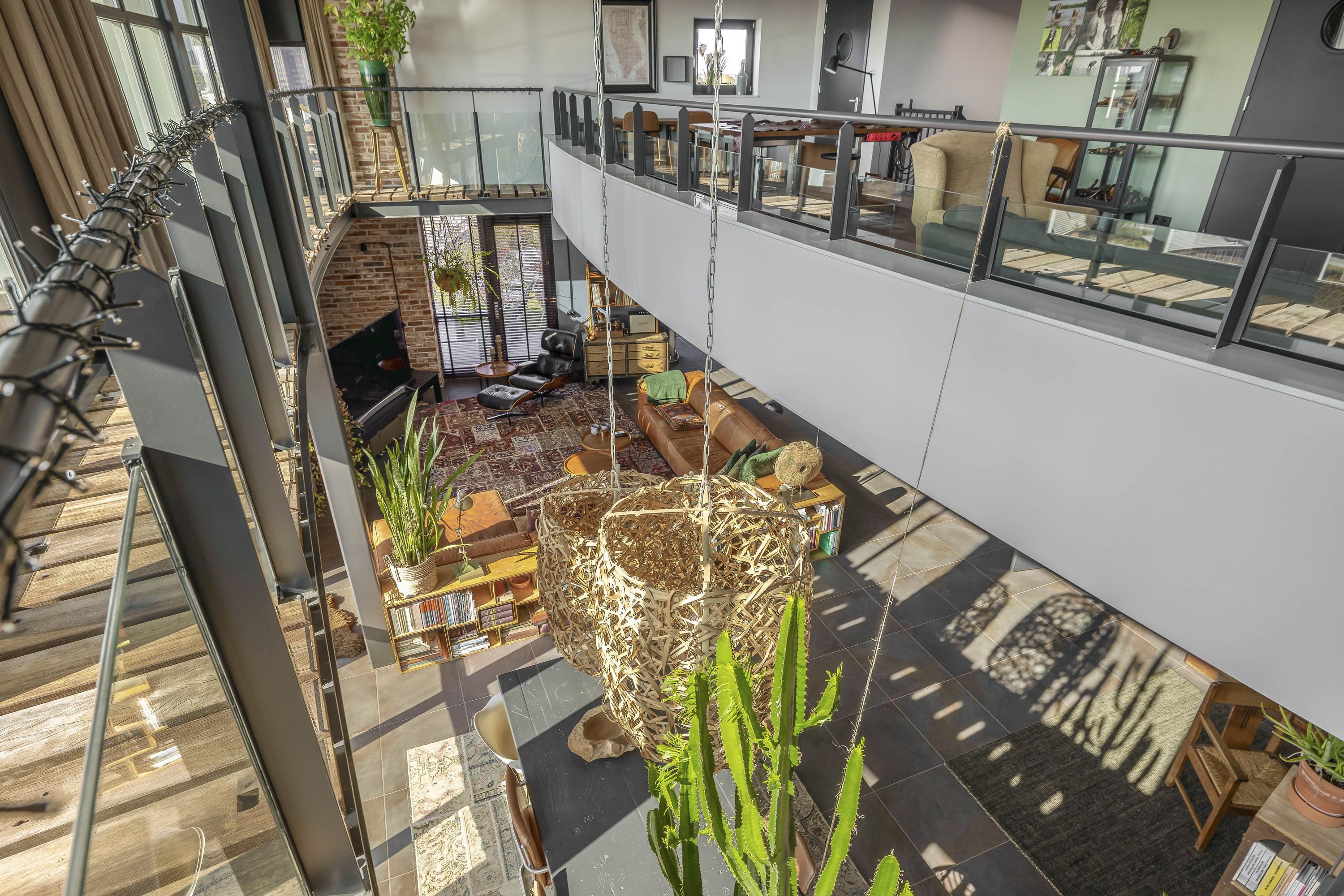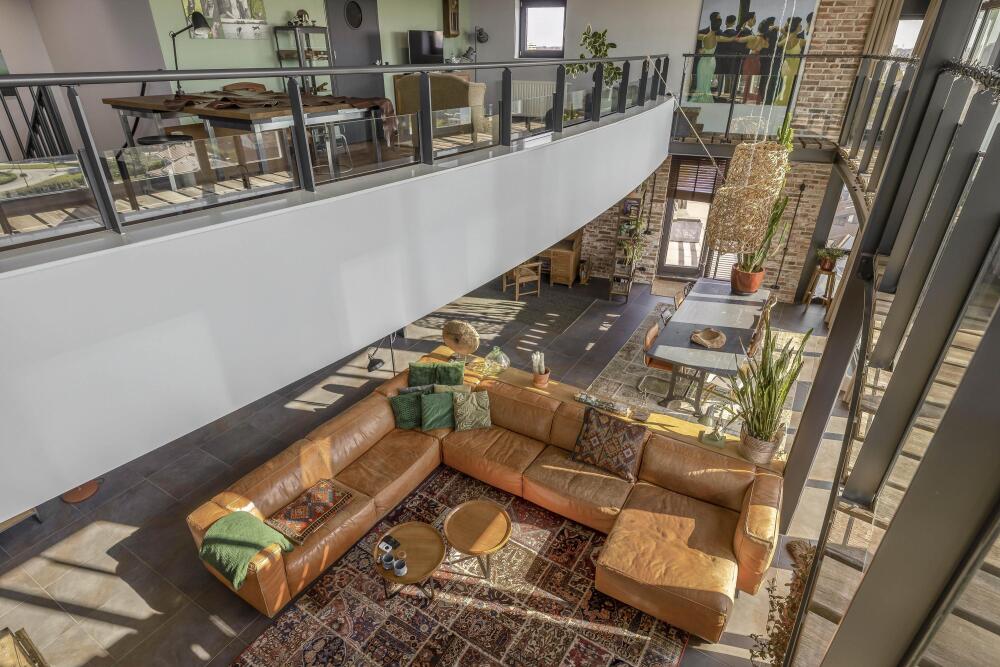 Entrance with wardrobe and guest toilet. The extremely spacious living room (85 m²) boasts incredible natural light thanks to a massive 7-meter-high window and an impressive mezzanine with an industrial-style balustrade. The entire floor is finished with luxurious Italian stone flooring and underfloor heating. On both sides of the living room, you’ll find expansive rooftop terraces, facing southwest and southeast respectively – 98 m² total. Enjoy all-day sun and phenomenal views. The skyline of Rotterdam feels almost within reach.