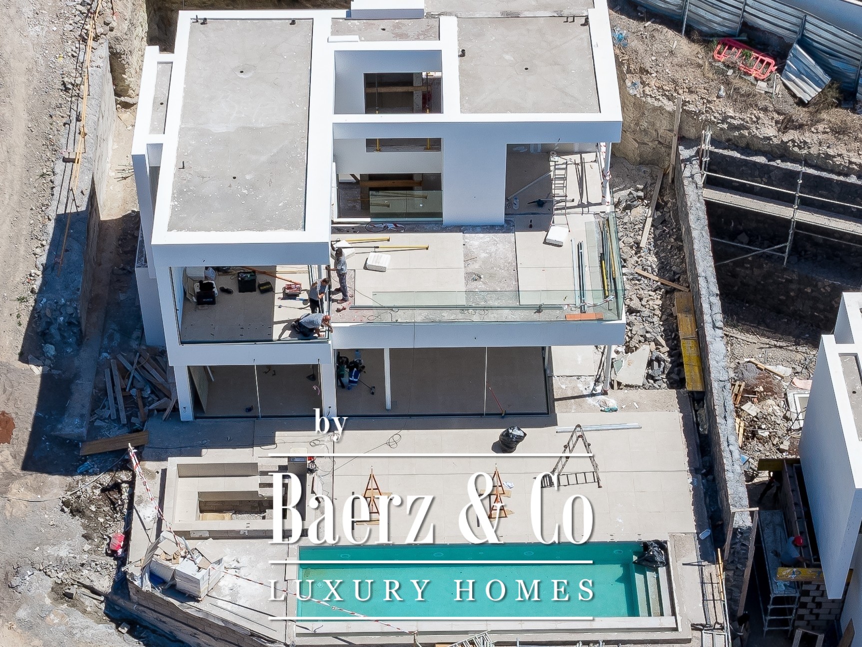 The entrance leads to the upper floor, where you will find the living room, the open kitchen with cooking island, two of the bedrooms and a guest toilet. The floor-to-ceiling sliding glass doors allow plenty of natural light into the villa. A patio serves as a convenient outdoor dining area, although there is also ample space on the terrace. Directly outside the living room is the terrace with private pool and outdoor shower.