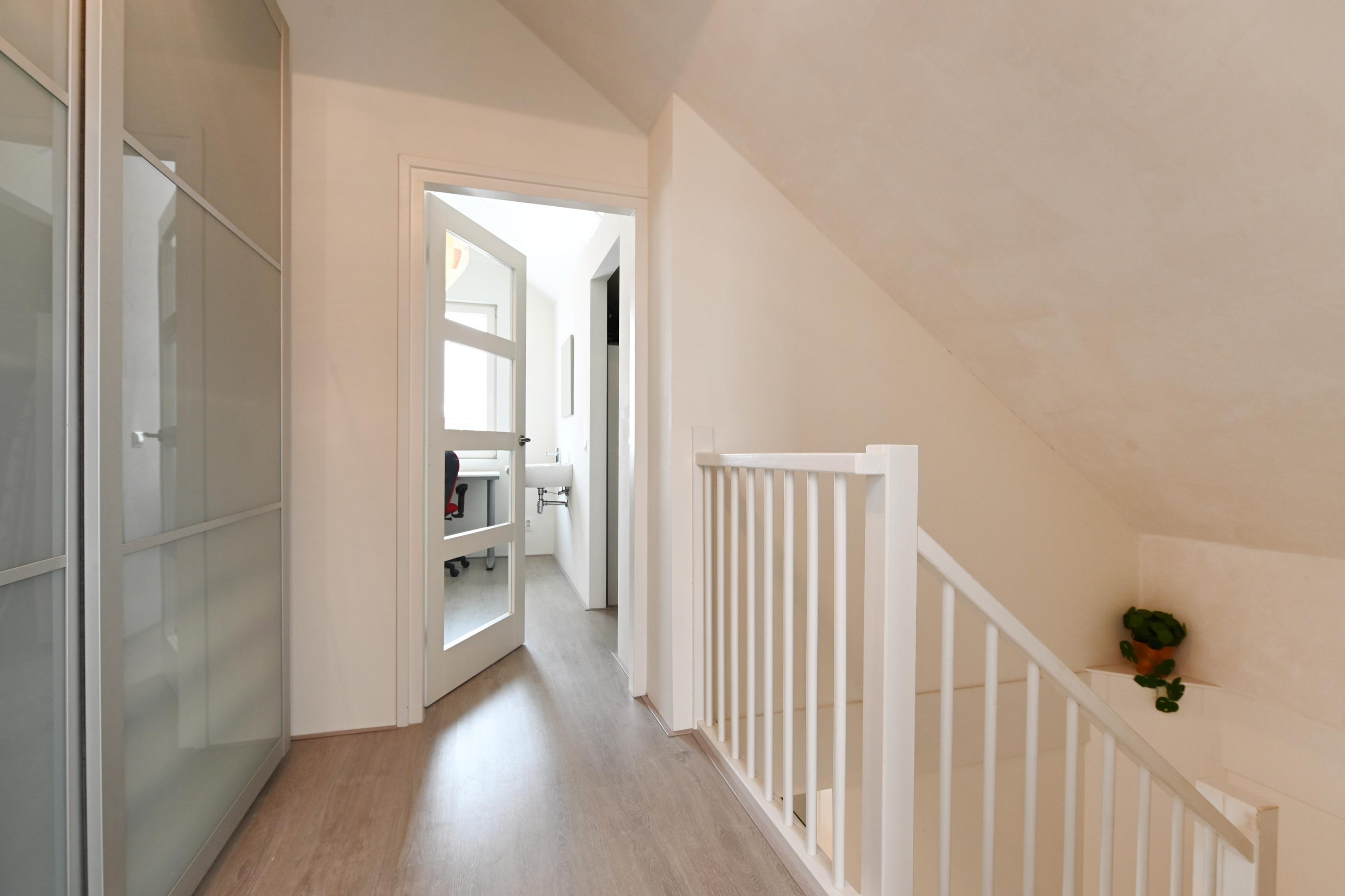 Via het ruime en lichte trappenhuis bereik je de eerste verdieping met een royale overloop die toegang geeft tot drie (van oorsprong vier) slaapkamers.
