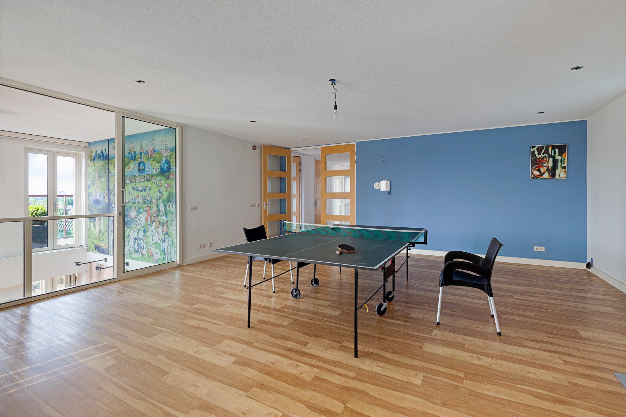 Entrance to the apartment. Spacious hallway providing access to various rooms. Exceptionally large living room with a cozy seating area and a large fireplace/stove. The bright dining area immediately stands out due to the unique ceiling height of no less than 5.50 meters, thanks to the mezzanine! During construction, this height was deliberately created to allow for the installation of a striking chandelier. The dining area provides access to a lovely sunroom on the terrace and to the open kitchen. The kitchen is modern, offers ample cupboard space, and is equipped with luxurious built-in appliances, including a fridge, freezer, microwave, oven, induction cooktop, extractor hood, dishwasher, and Quooker. The master bedroom is located on the northeast side of the apartment and is beautifully furnished with ample built-in wardrobes. From this bedroom, you can access a luxurious and spacious bathroom equipped with a walk-in shower, (whirlpool) bath with star ceiling, sauna, toilet, and a vanity unit – a wonderful space to fully unwind.