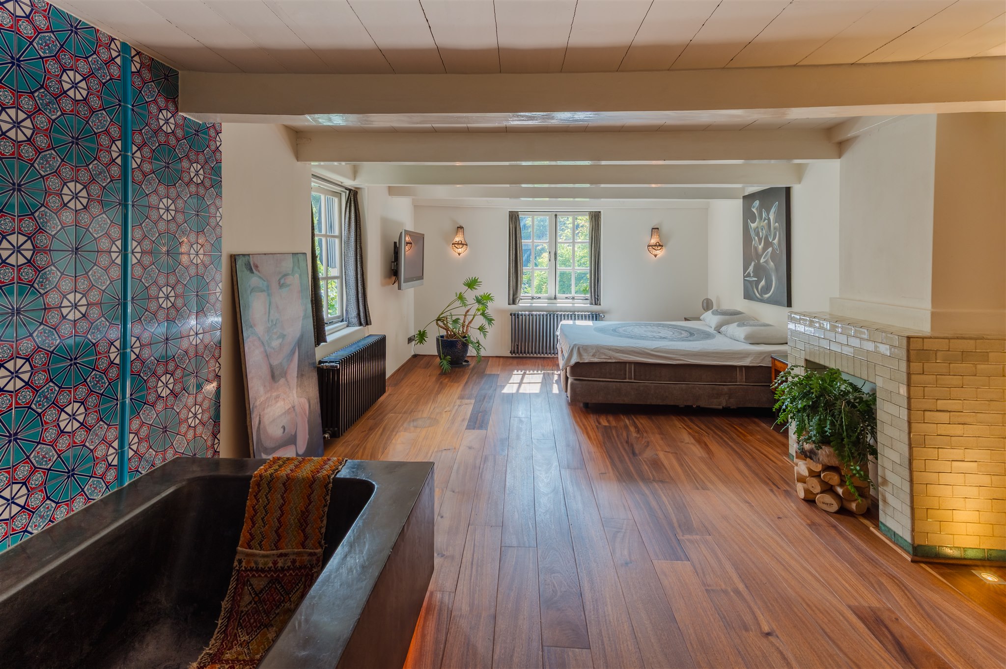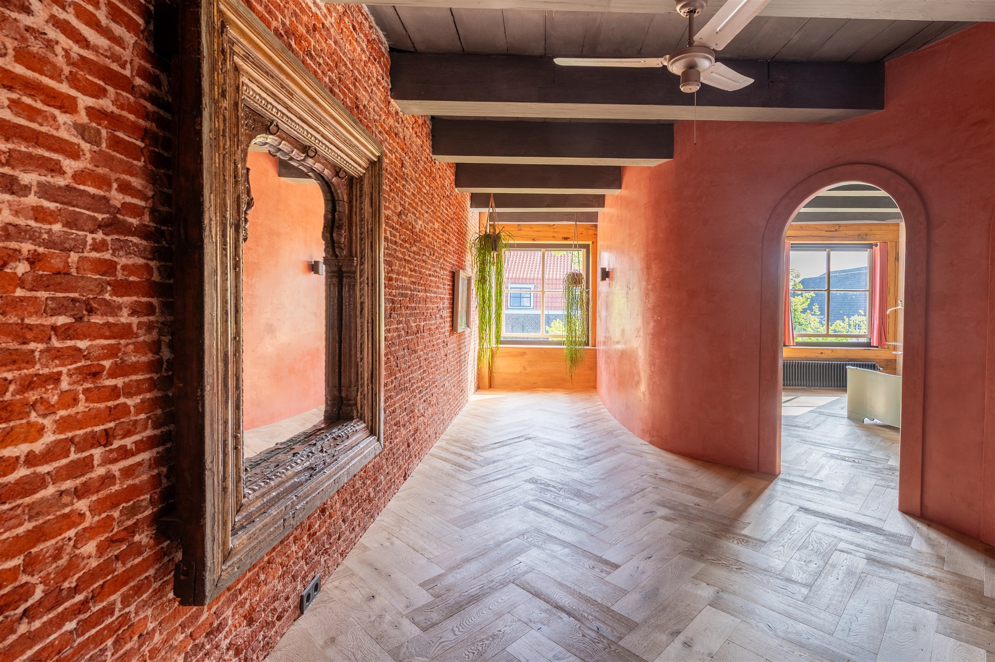At the front: the grand living room with soaring four-metre ceilings, oak flooring, and a splendid view over the canal and the historic Armamentarium.