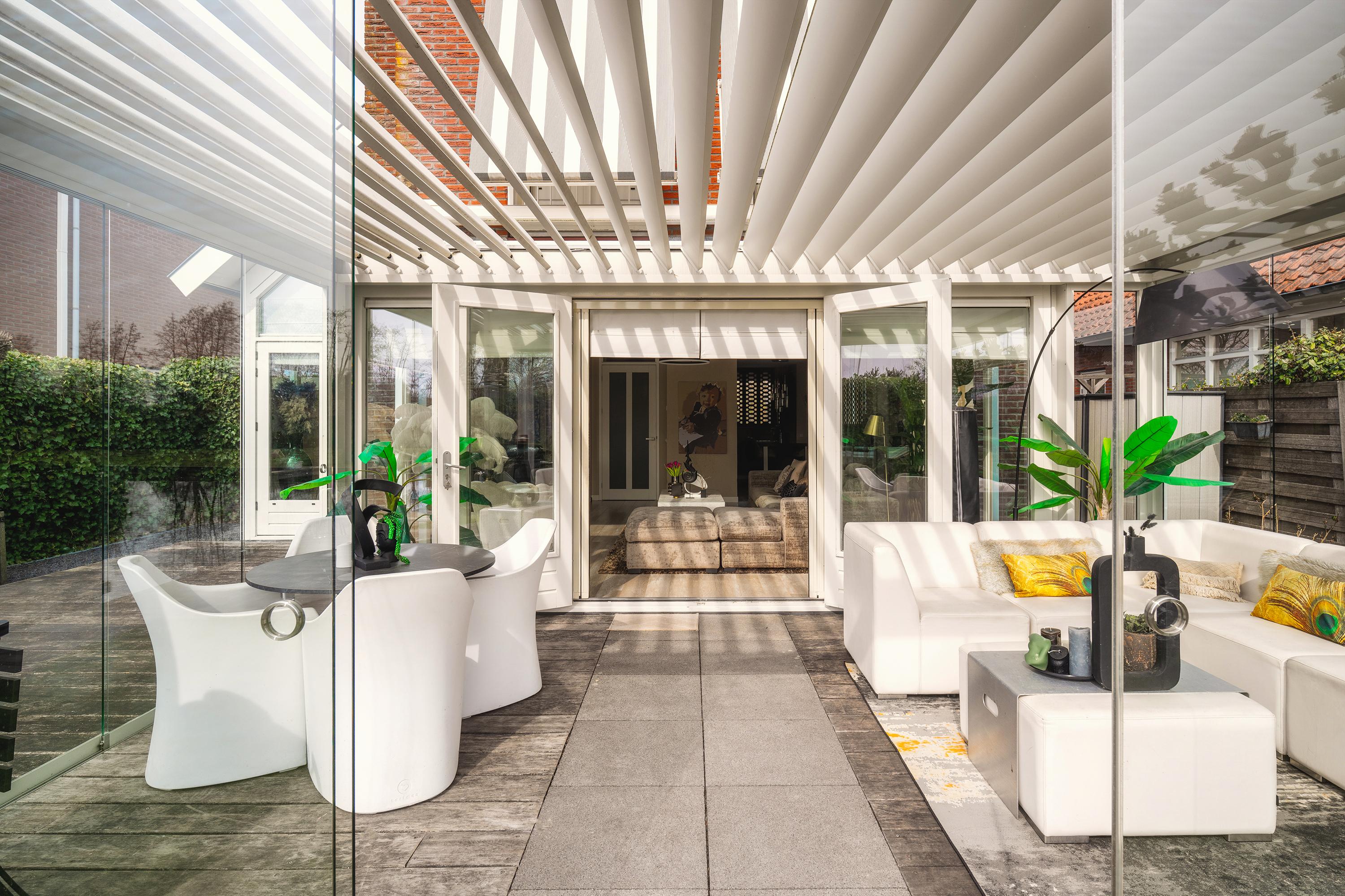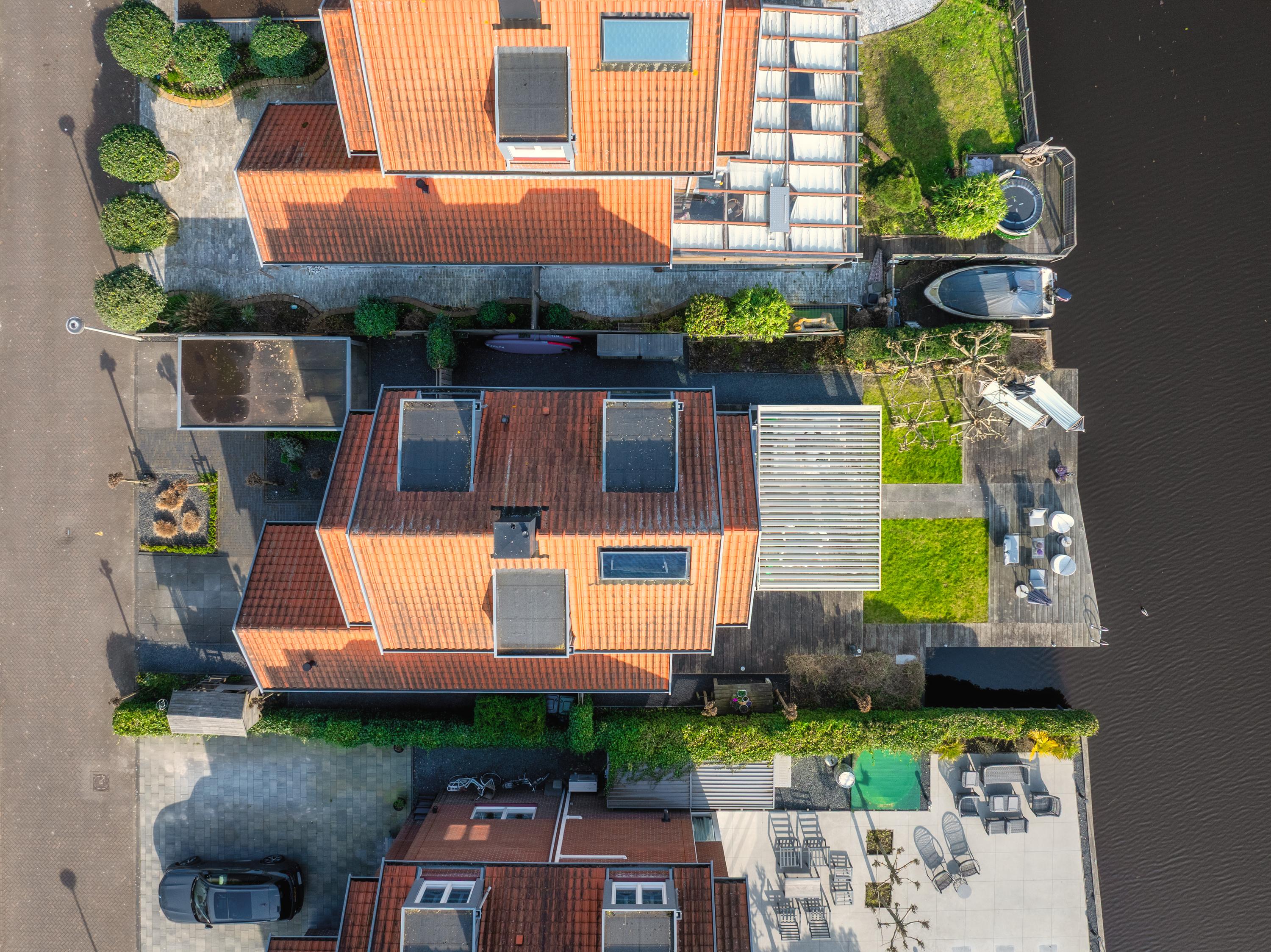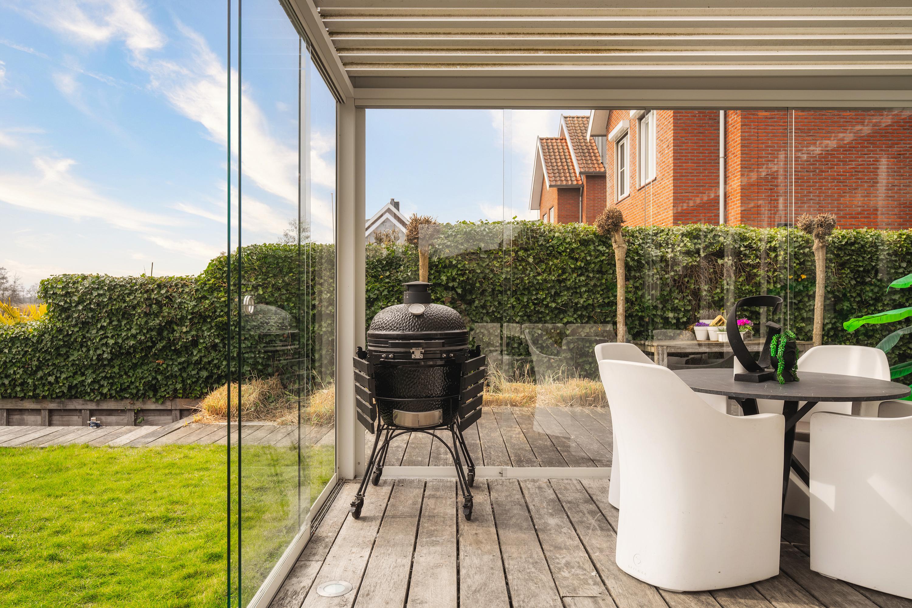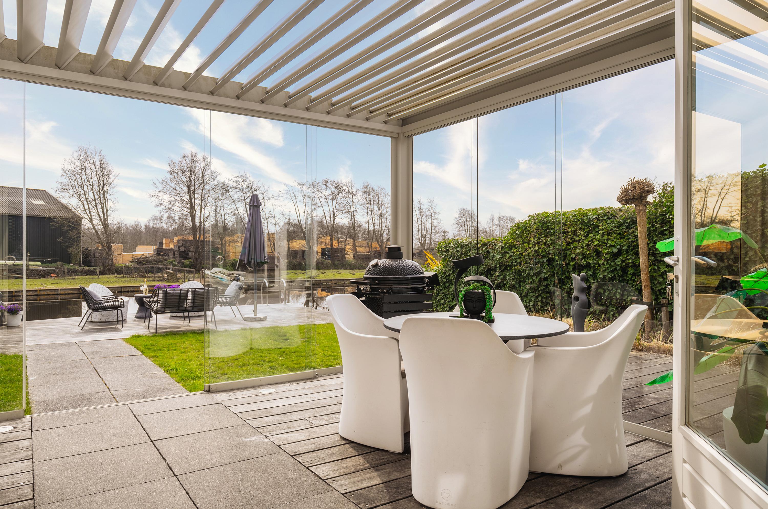 The garden is beautifully landscaped and thoughtfully designed. Located on the water with a private mooring for a sloop and a swimming ladder to enjoy the open water directly. Whether you are lying in the hammock or sitting on the terrace by the water, the view of the water and Het Twiske never gets boring. The garden has drip irrigation for optimal watering and atmospheric lighting with 12V spots. Under the canopy with louvered tilting roof and glass sliding doors (with integrated drainage function), you can enjoy it all year round.