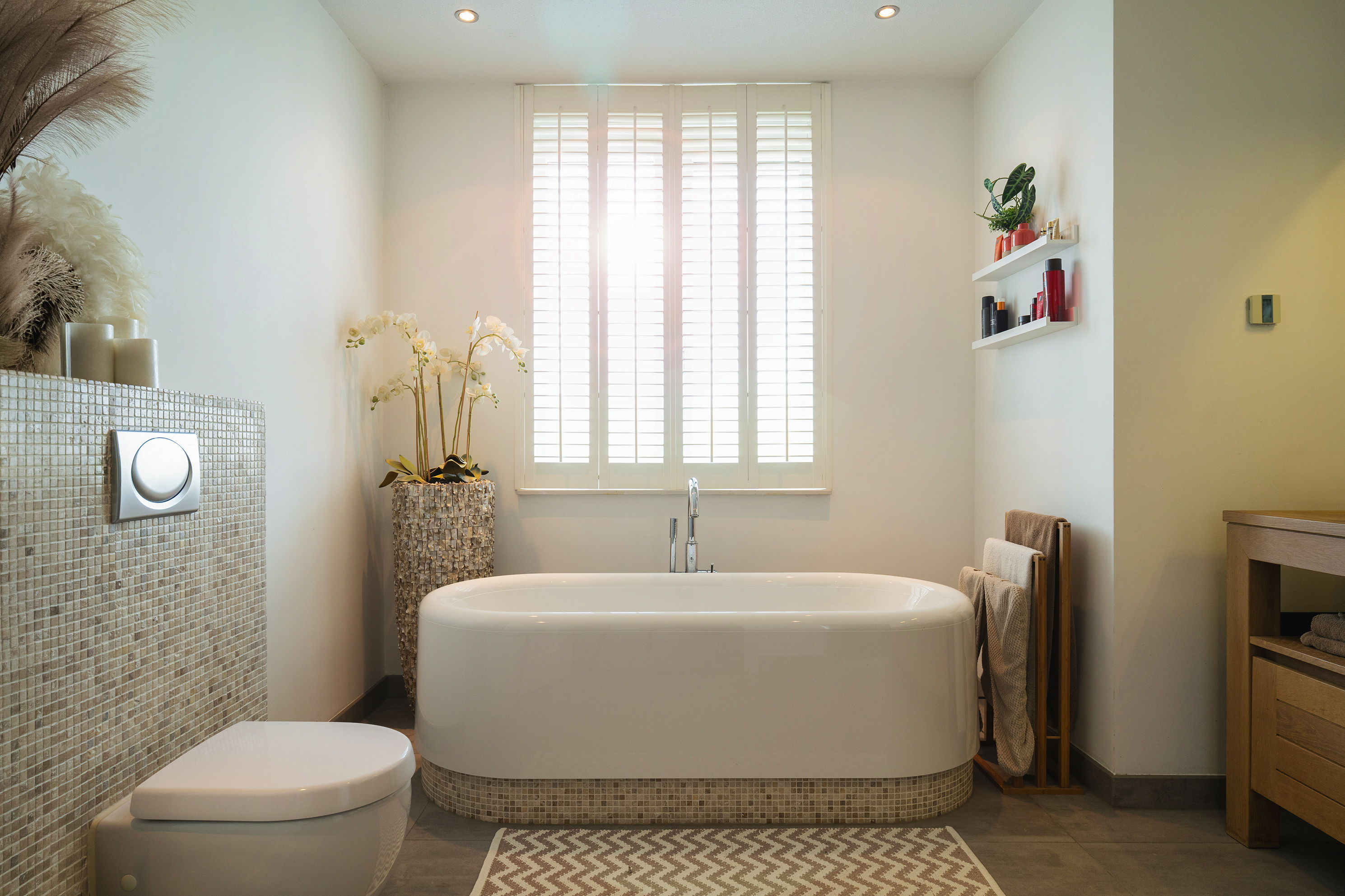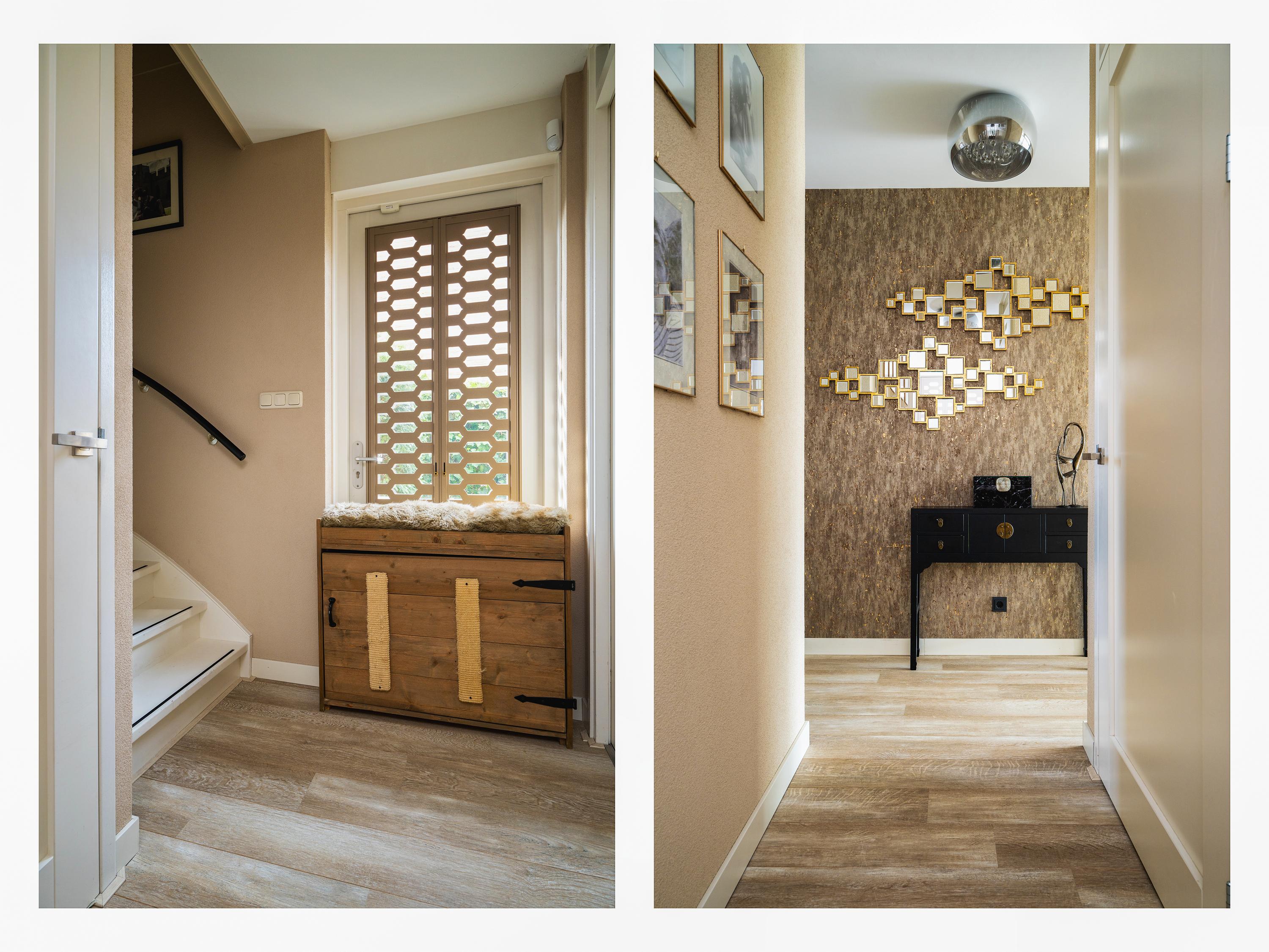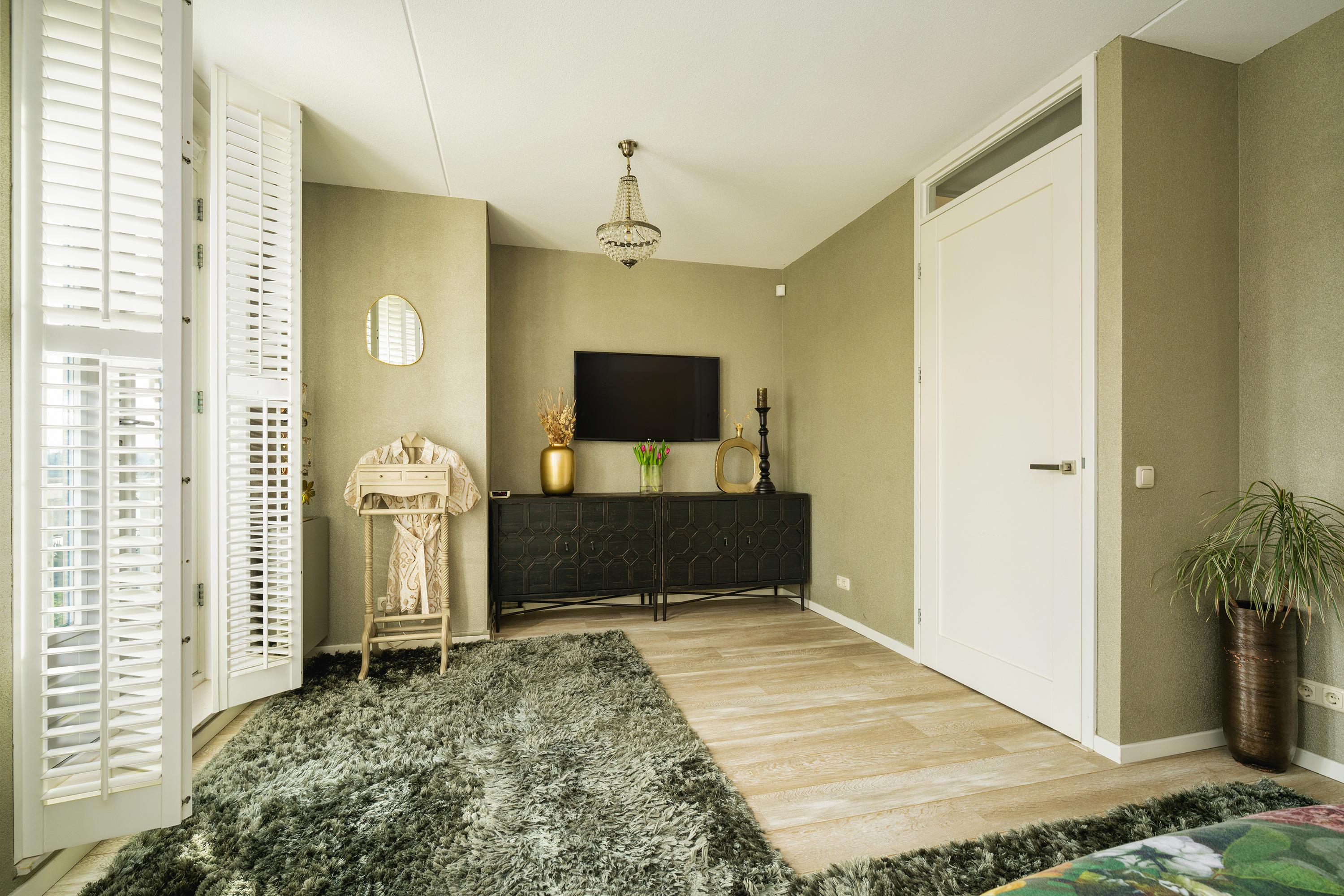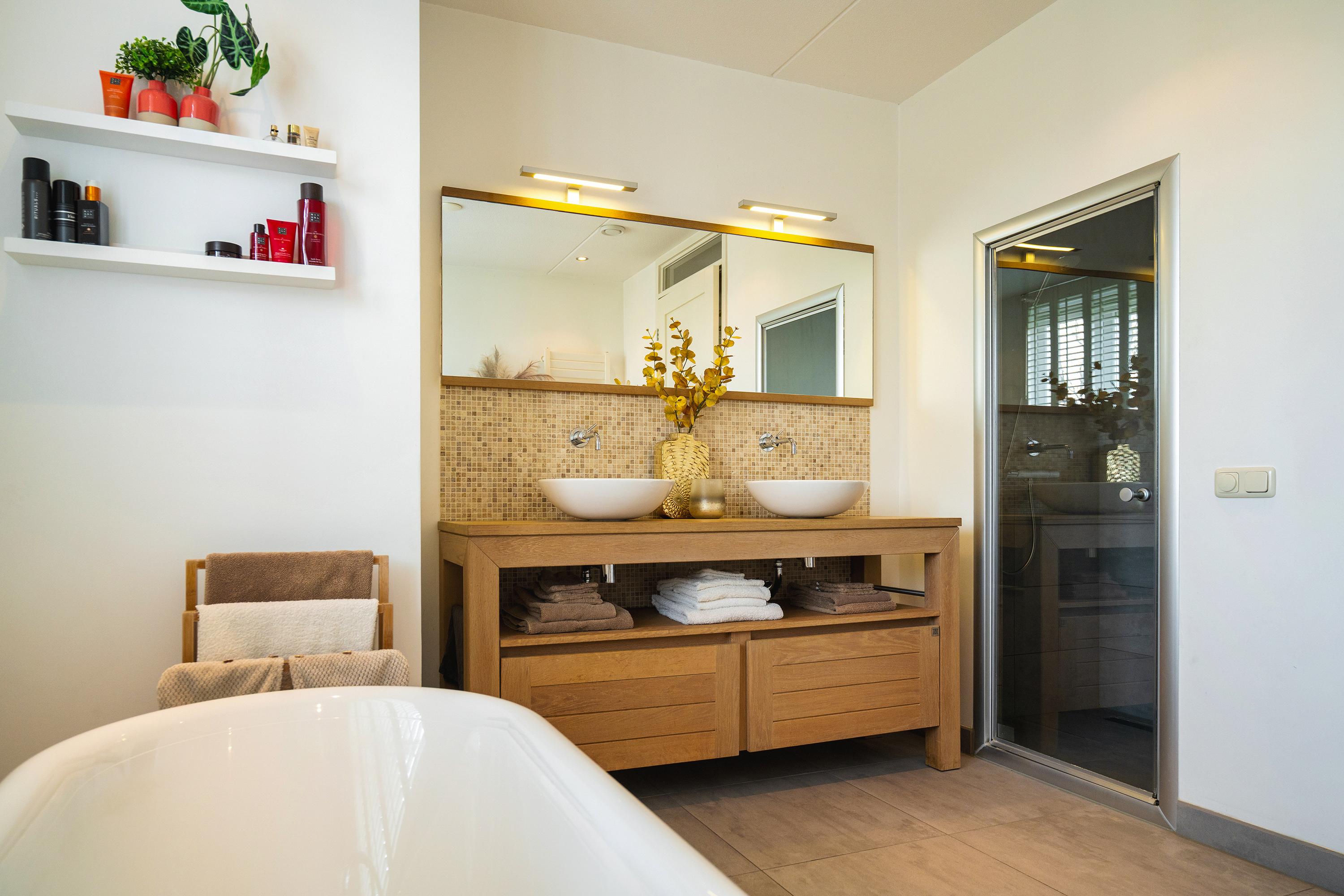 Landing with access to 2 bedrooms, one of which is a very spacious (master) bedroom at the rear with French balconies and a view of the water. The bathroom is luxuriously finished and equipped with a freestanding bathtub, a spacious double shower with steam cabin function, and an oak vanity with double sinks. Opposite the bathroom is a spacious walk-in closet.