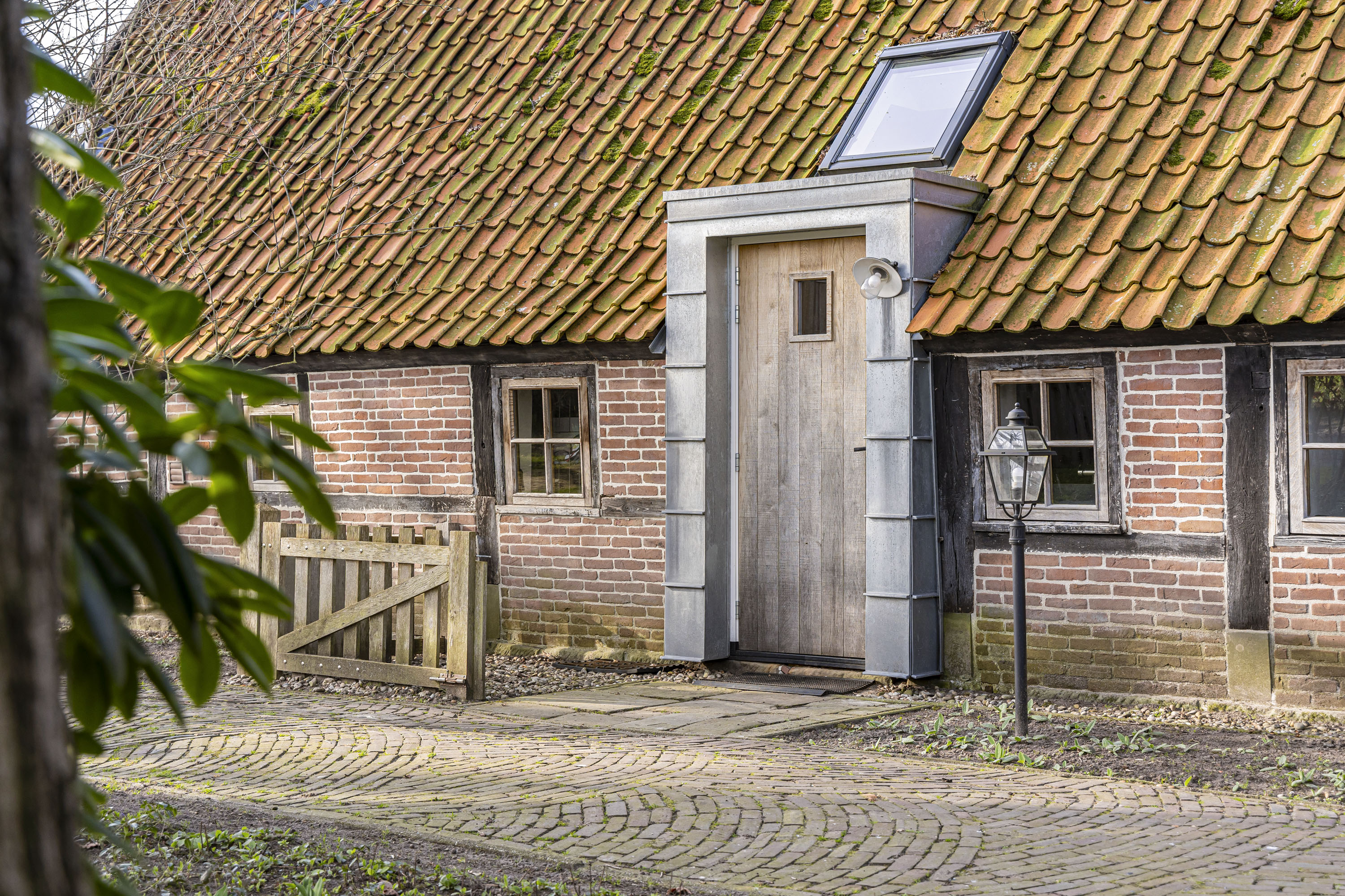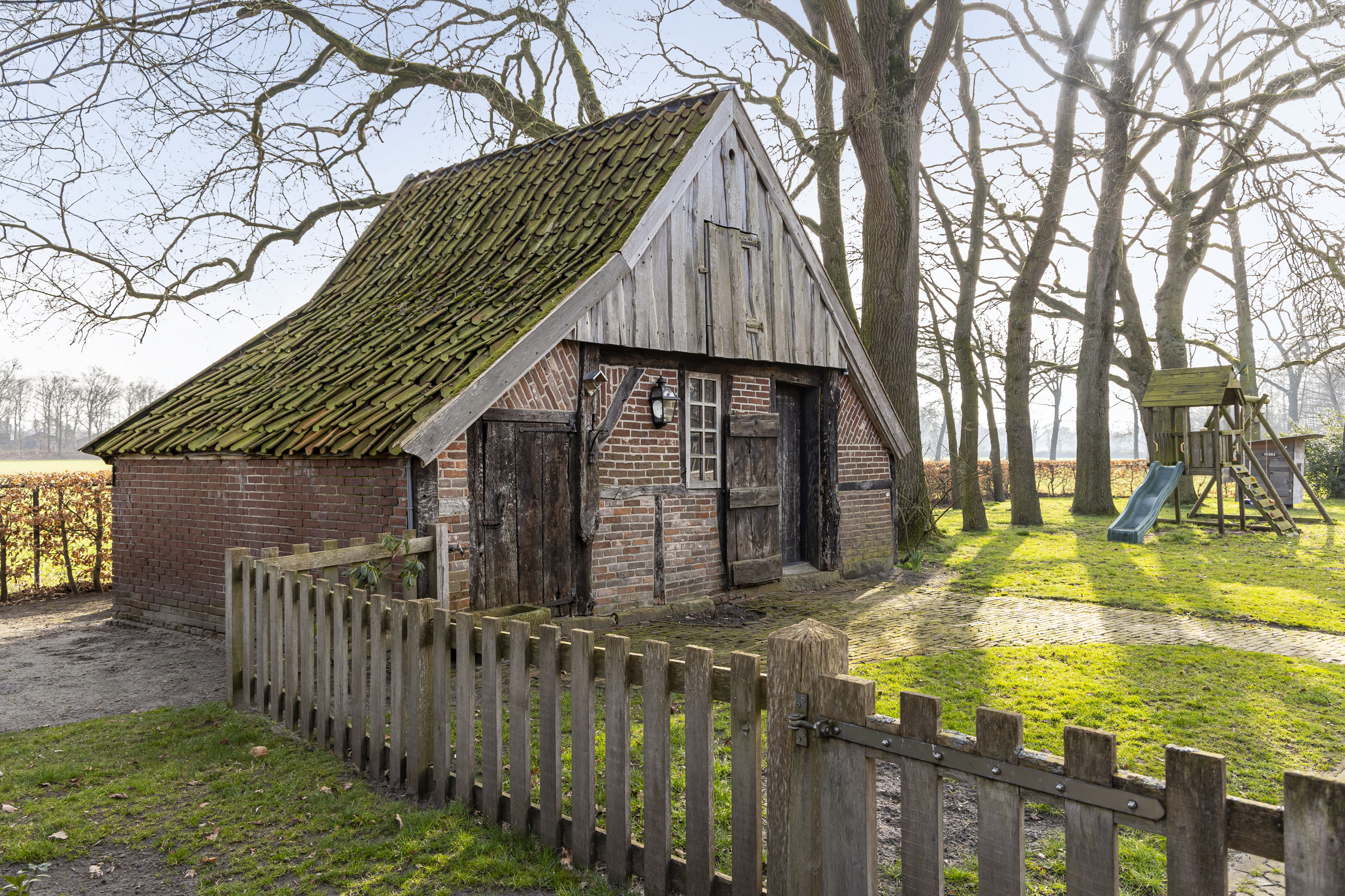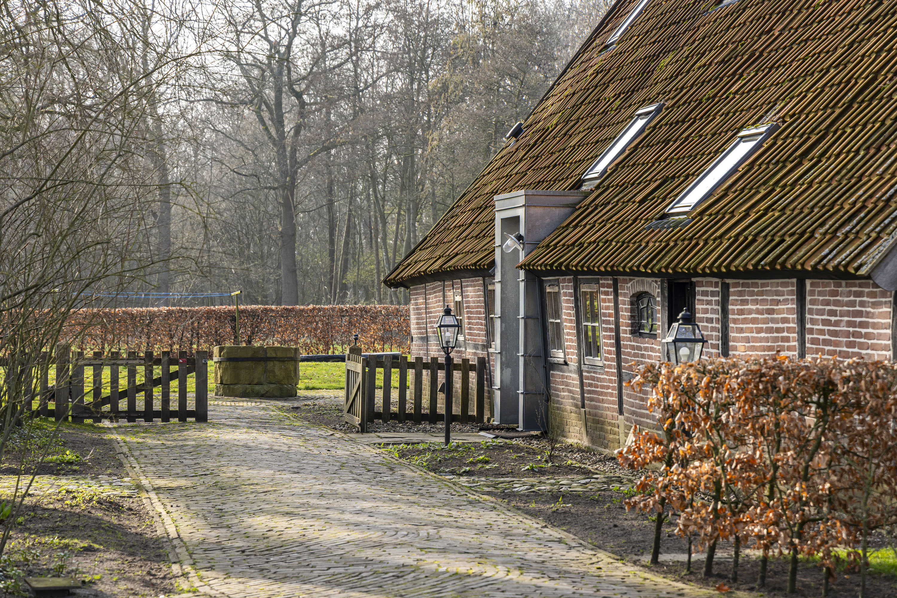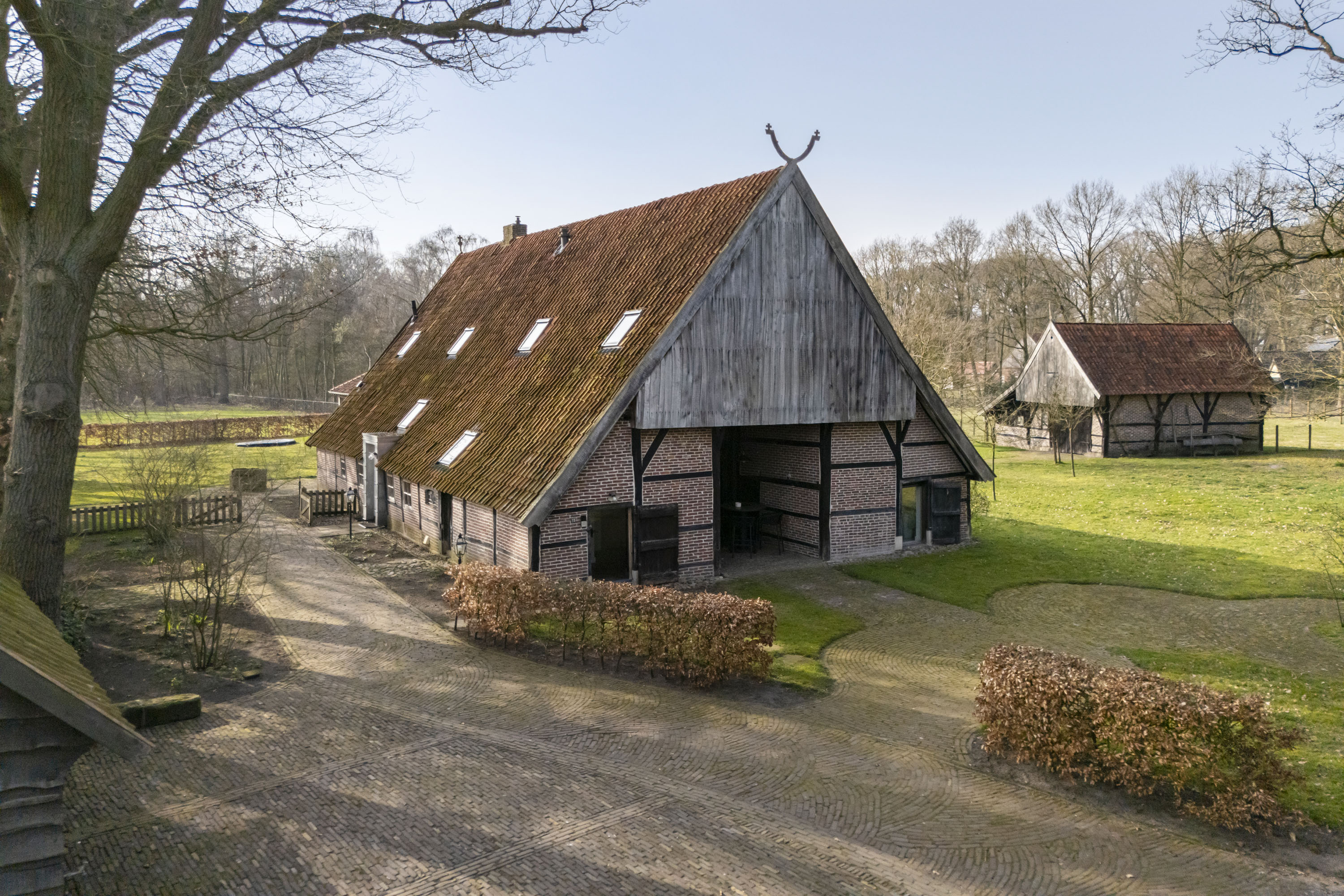 Rural living at its finest in the countryside of Denekamp. This characteristic, monumental and fully renovated farmhouse with several outbuildings is beautifully tucked away in the lush landscape of northeast Twente. The authentic appearance of the Saxon-style farmstead—with its robust half-timbered façades, refined window mullions, nostalgic outbuildings, majestic oak trees and driveways and terraces paved with traditional baked bricks—creates an exceptionally charming and rustic atmosphere.