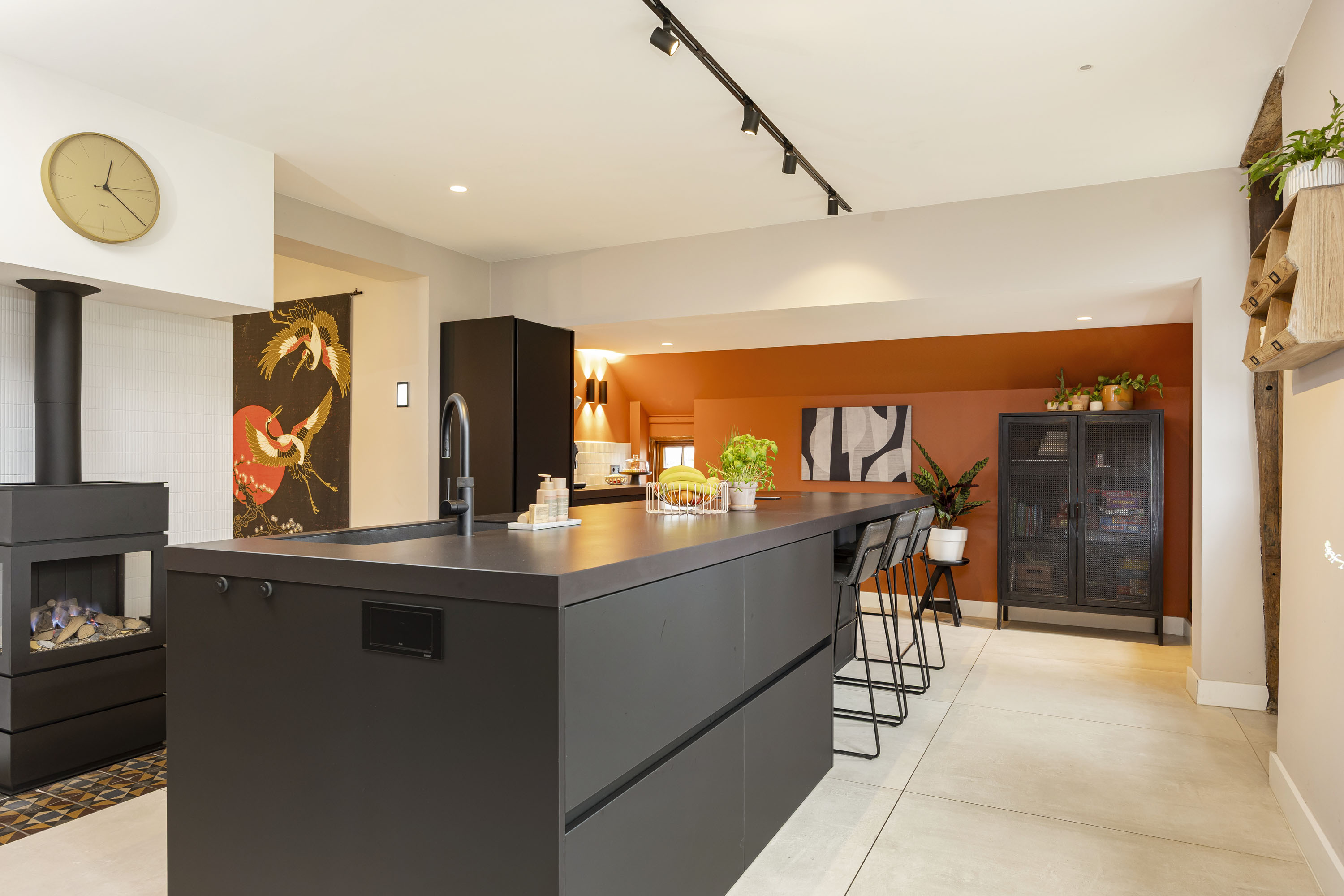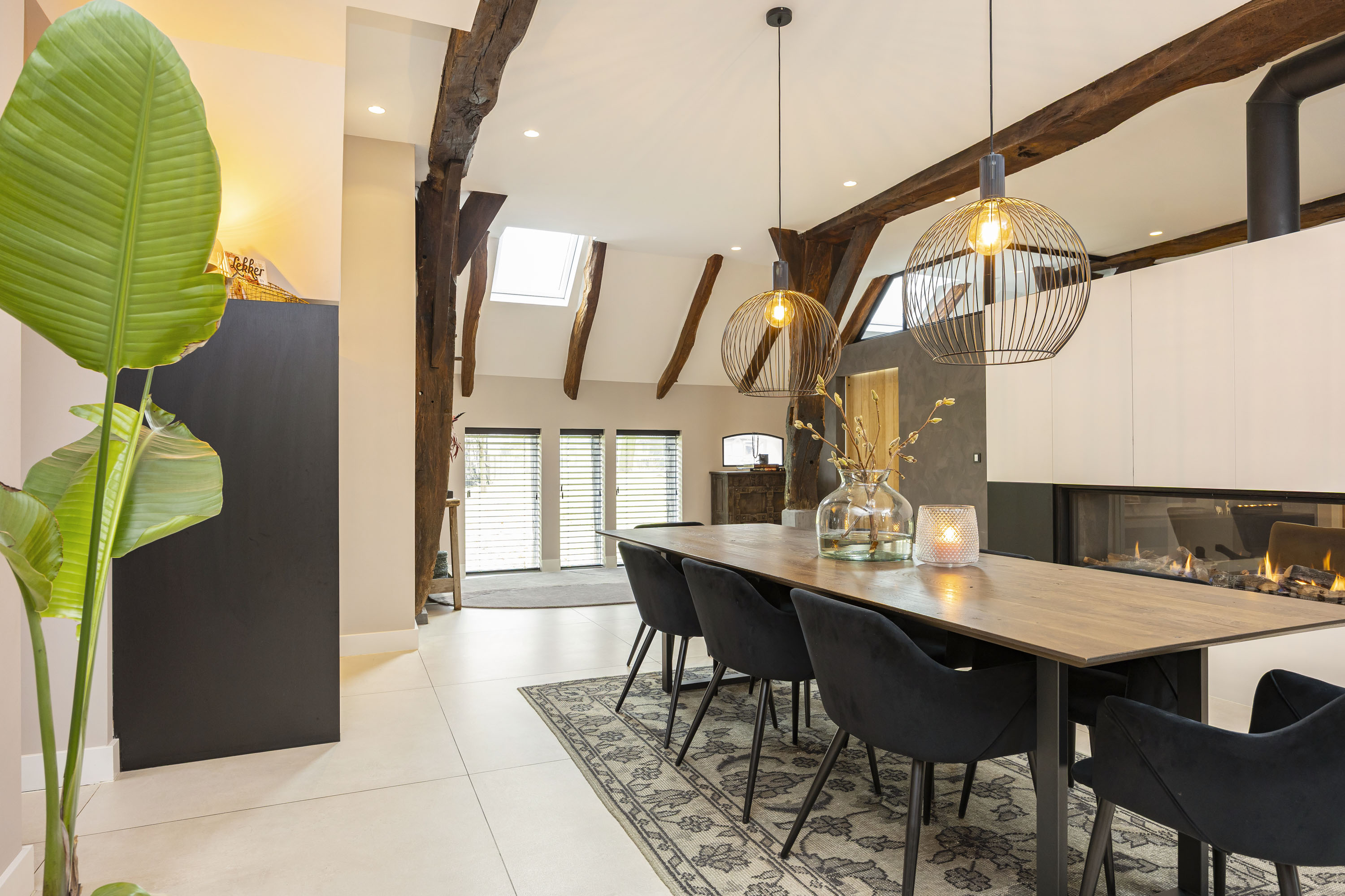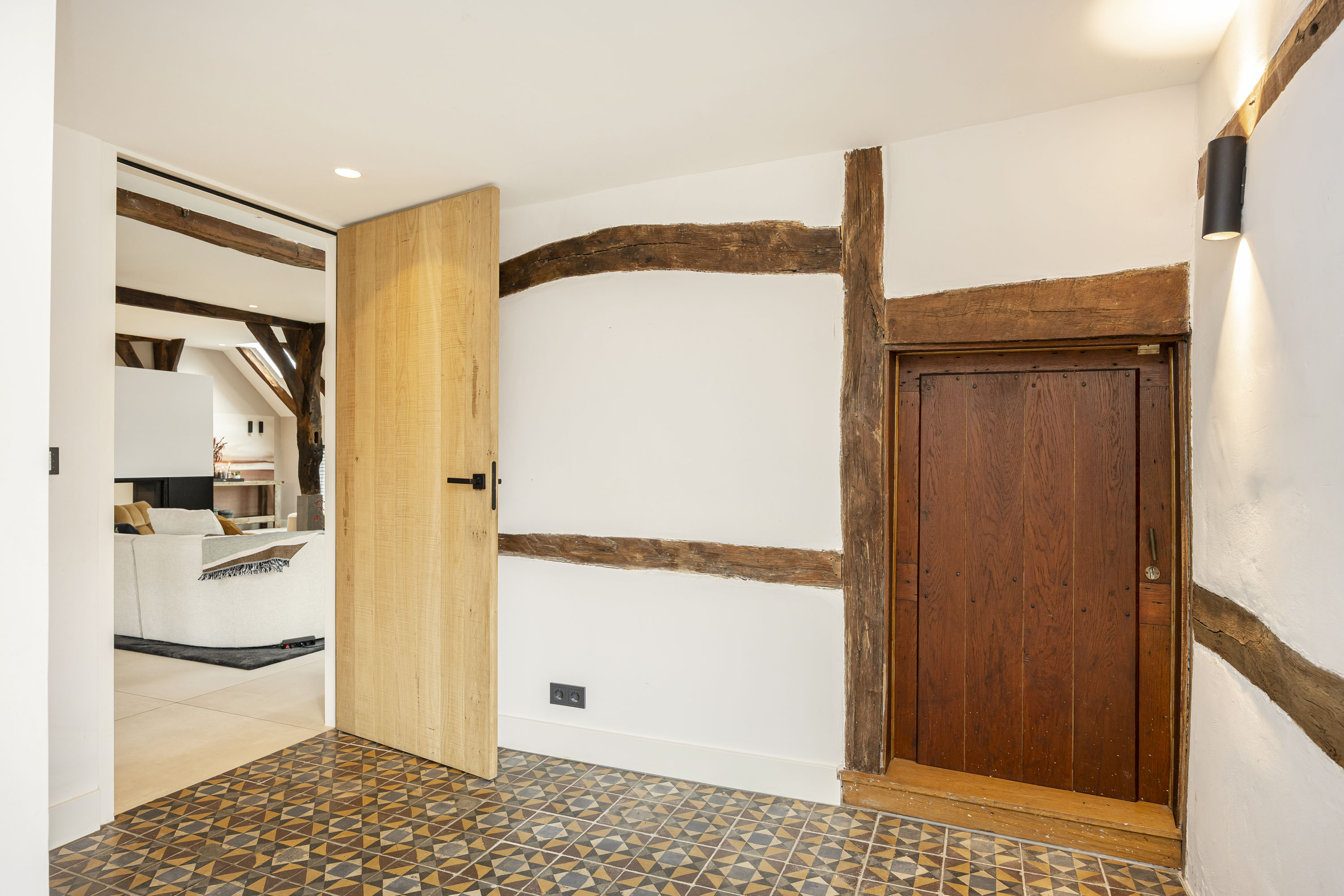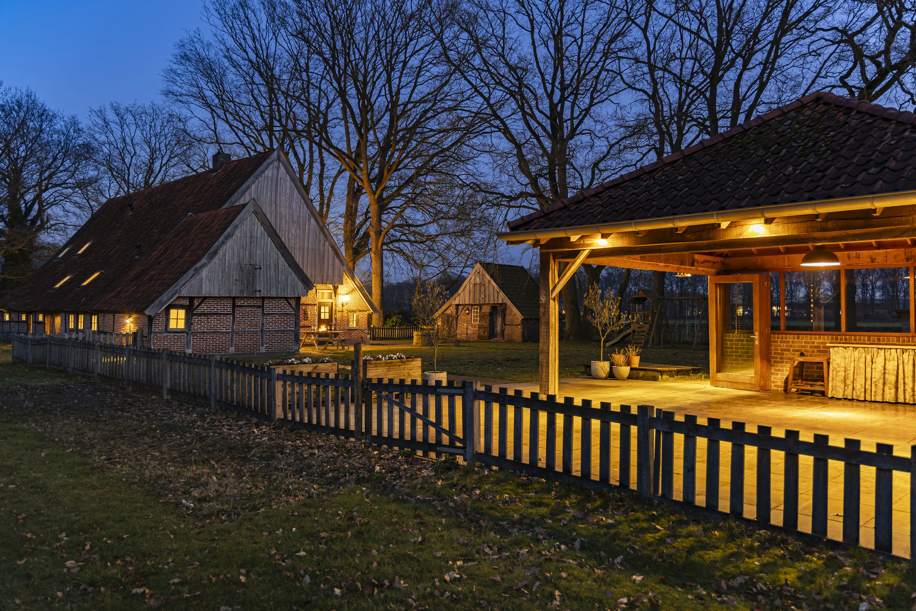 Rural living at its finest in the countryside of Denekamp. This characteristic, monumental and fully renovated farmhouse with several outbuildings is beautifully tucked away in the lush landscape of northeast Twente. The authentic appearance of the Saxon-style farmstead—with its robust half-timbered façades, refined window mullions, nostalgic outbuildings, majestic oak trees and driveways and terraces paved with traditional baked bricks—creates an exceptionally charming and rustic atmosphere.