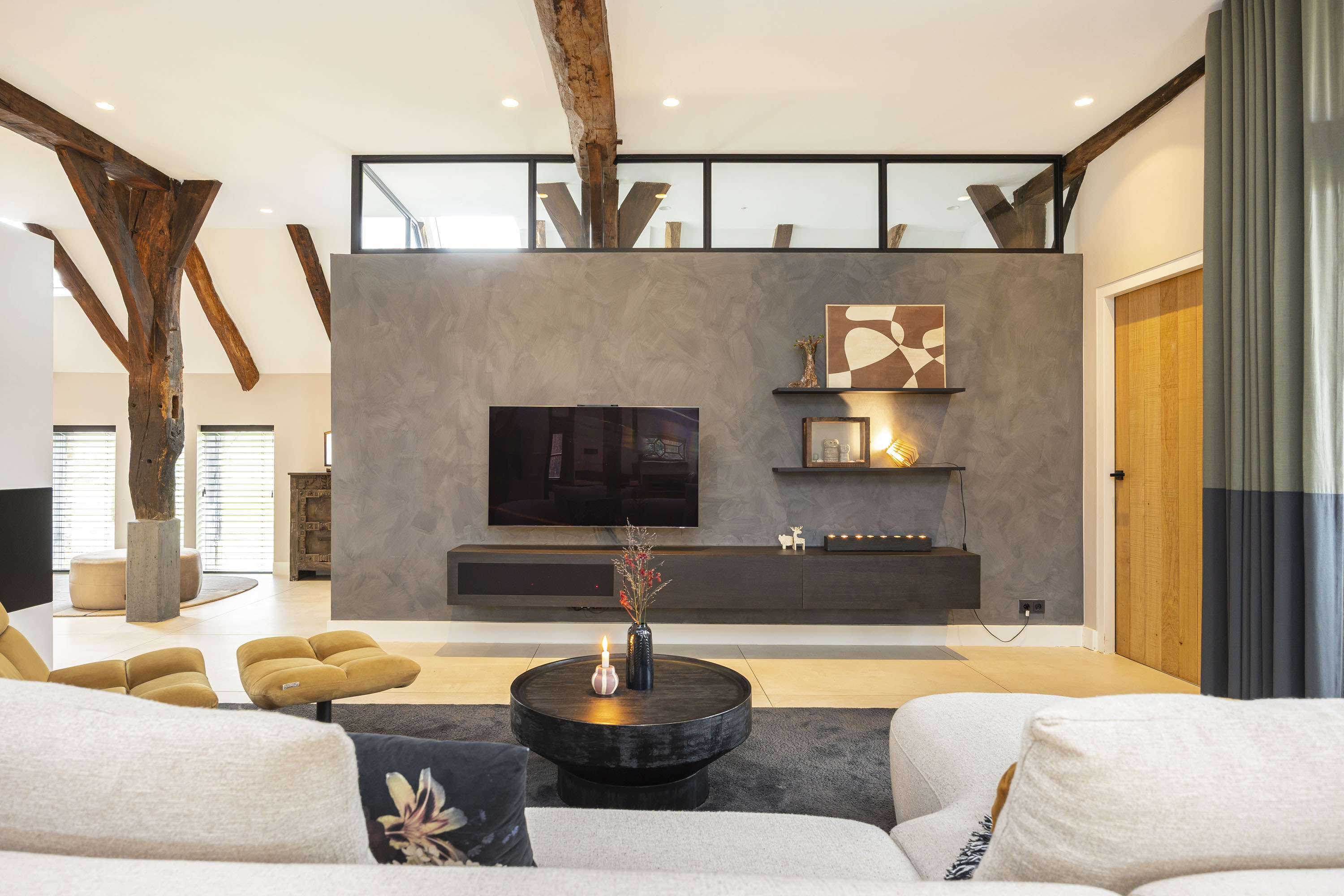 The ground floor includes a spacious modern kitchen, a living room divided into a dining and sitting area by a gas fireplace, a children’s play corner, a fitness room, a utility room, several storage rooms and—last but not least—a beautiful bedroom with a luxurious ensuite bathroom. At the front of the farmhouse, you will find the traditional “onderschoer”, a small covered and intimate terrace.