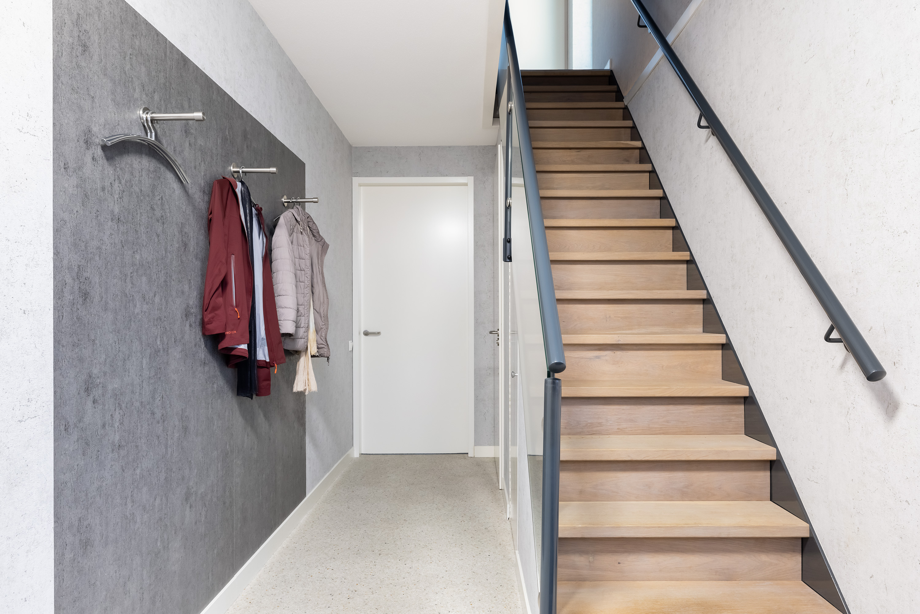Spacious hallway with staircase to the first floor, under-stair storage, toilet, utility meter cabinet (12 circuits, circuit for stove, solar panels, heat pump, 3 RCDs, fiber optic), and access to the living room.
