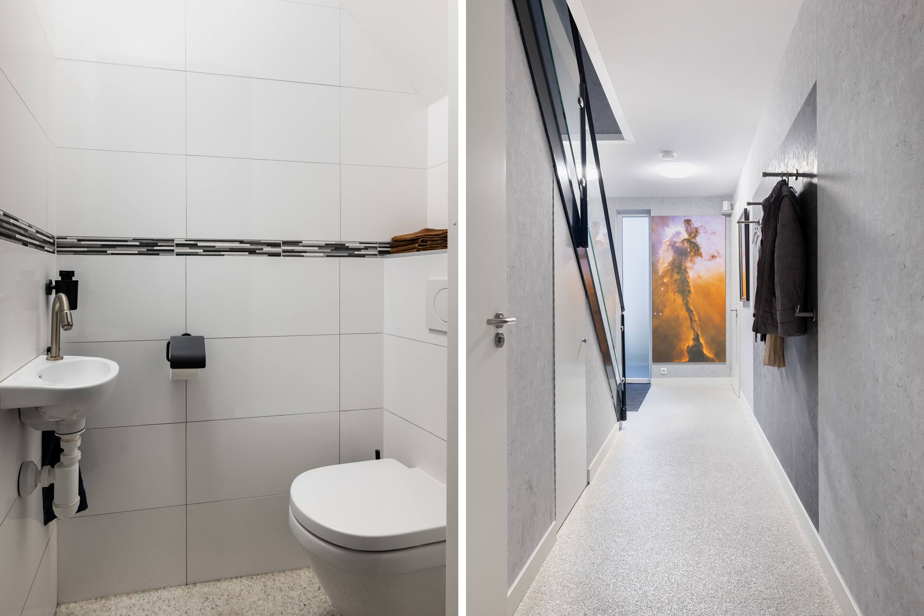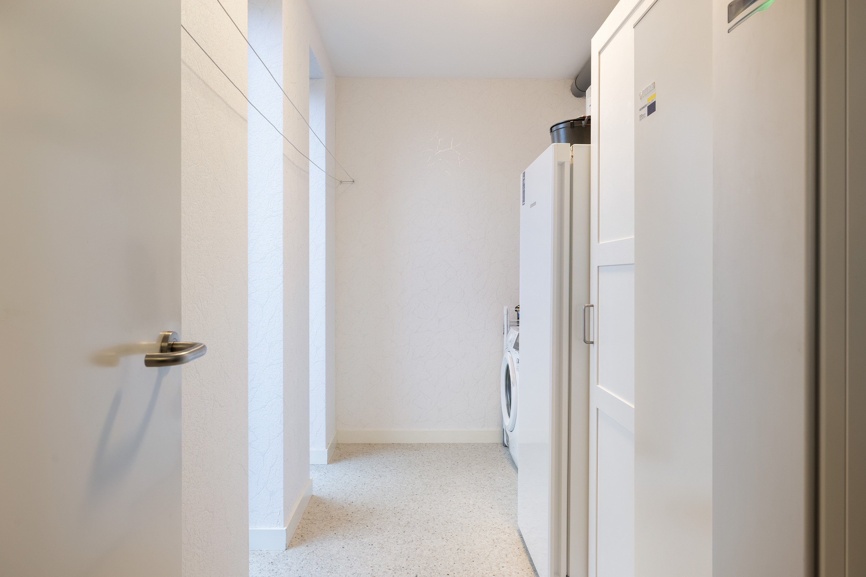 Accessible from the kitchen, this room houses the ground-source heat pump, underfloor heating distributor, mechanical ventilation for the ground floor, and washing machine connections.