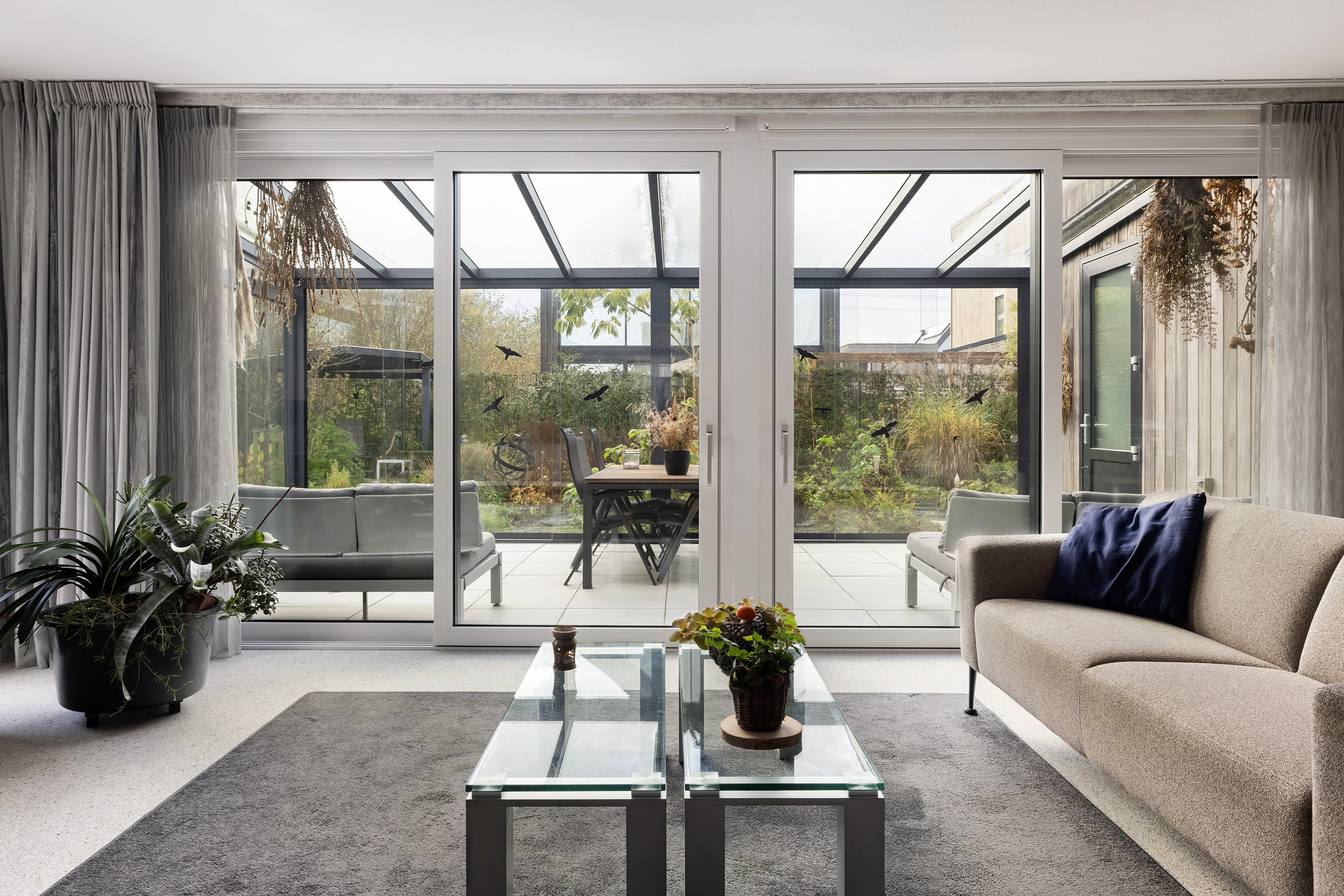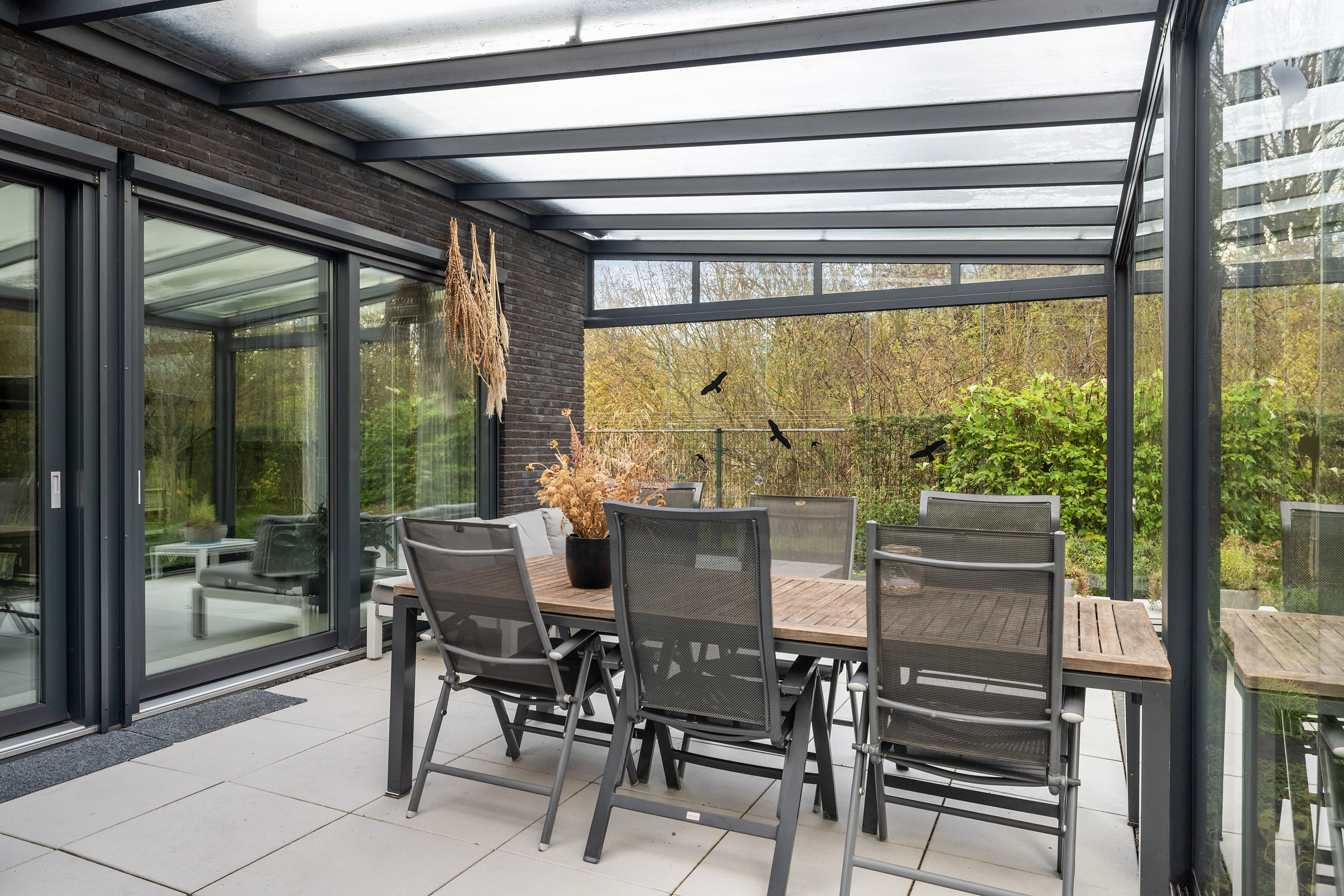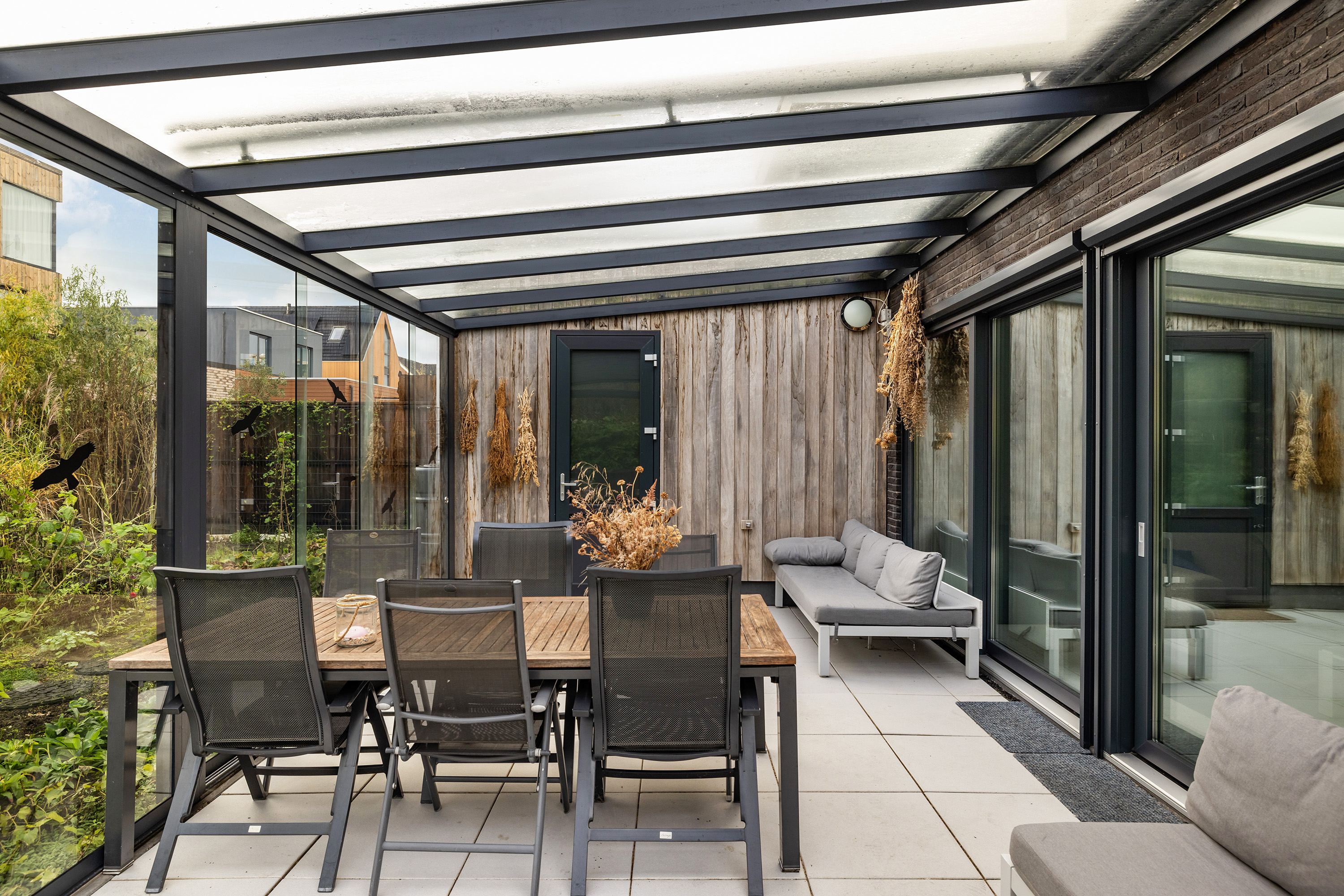 Accessible via two sliding doors from the living room and a single door from the garage. Fully enclosed with glass sliding panels, equipped with electric sunscreens above and electrical outlets.