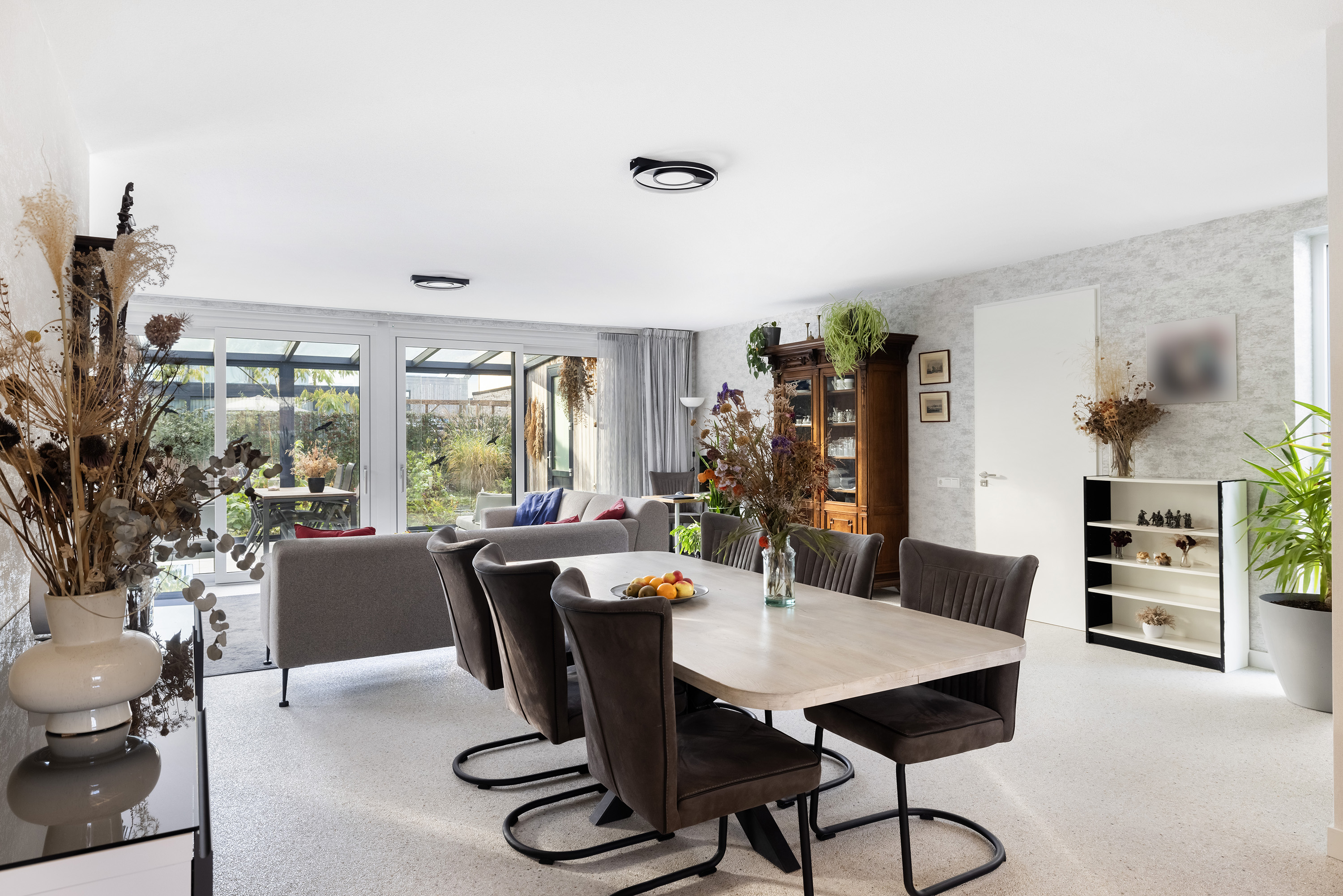 A wonderfully spacious and light-filled living room thanks to the large windows, with green views. The rear of the living room opens to a large conservatory via two sliding doors. The garage is also accessible from the living room. The space features a Carrara Italian marble-gravel floor and wallpapered walls.
