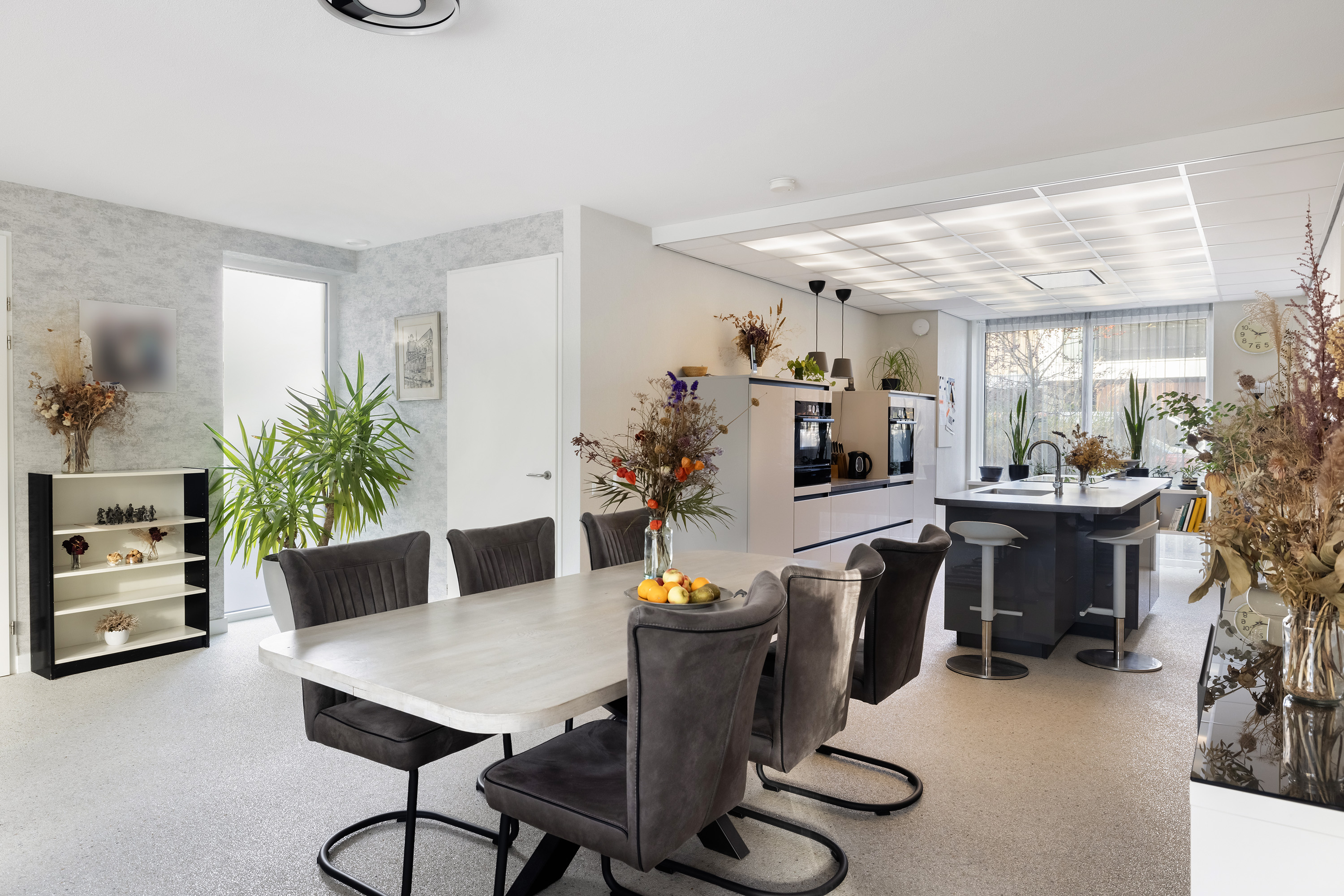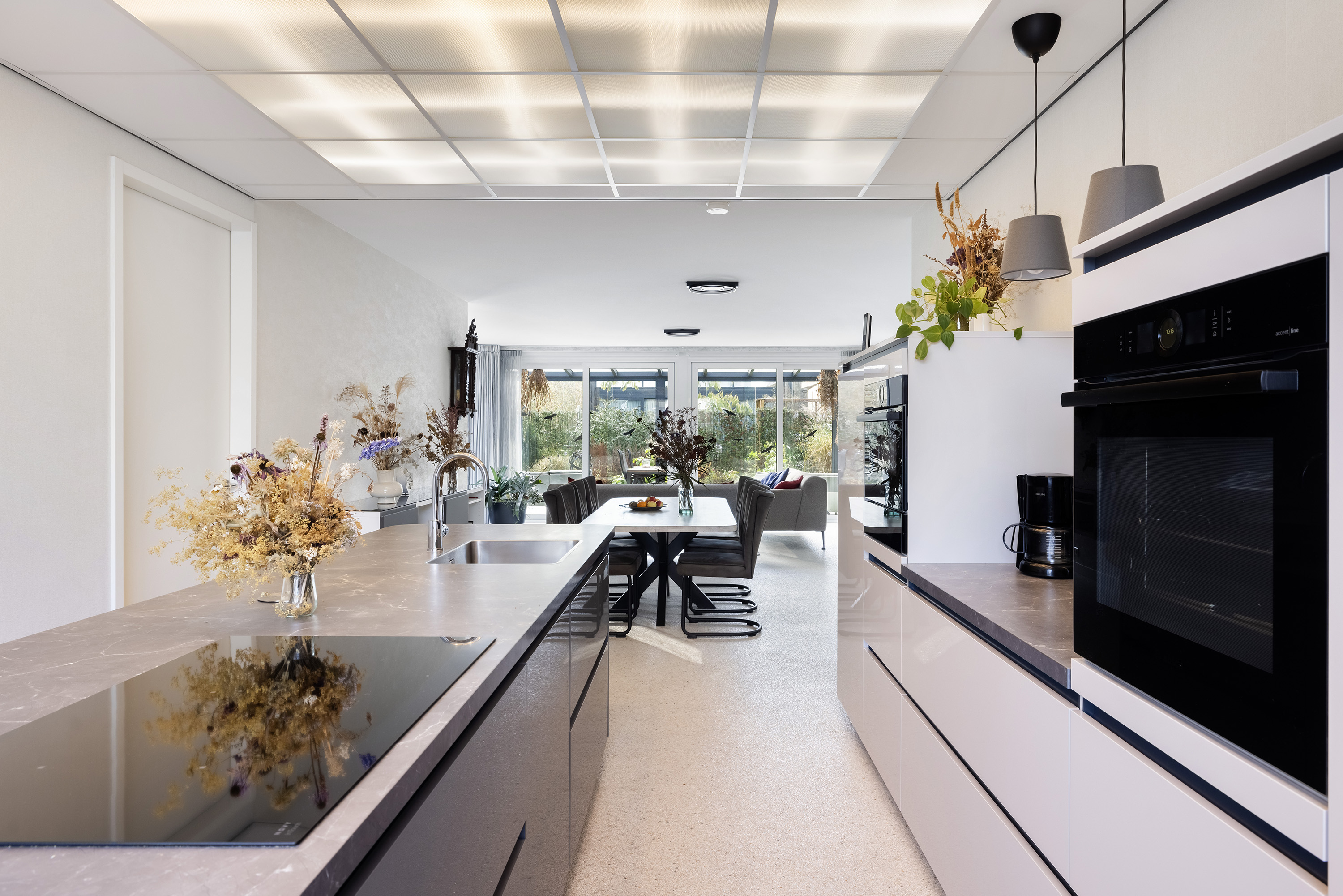 The open kitchen includes a straight-line setup and a central island with breakfast bar. High-end finishes include an induction hob, extraction system, sink with mixer tap, dishwasher, fridge, steam oven, combi microwave, warming drawer, and plenty of storage and drawers. The dropped ceiling features dimmable recessed lighting.