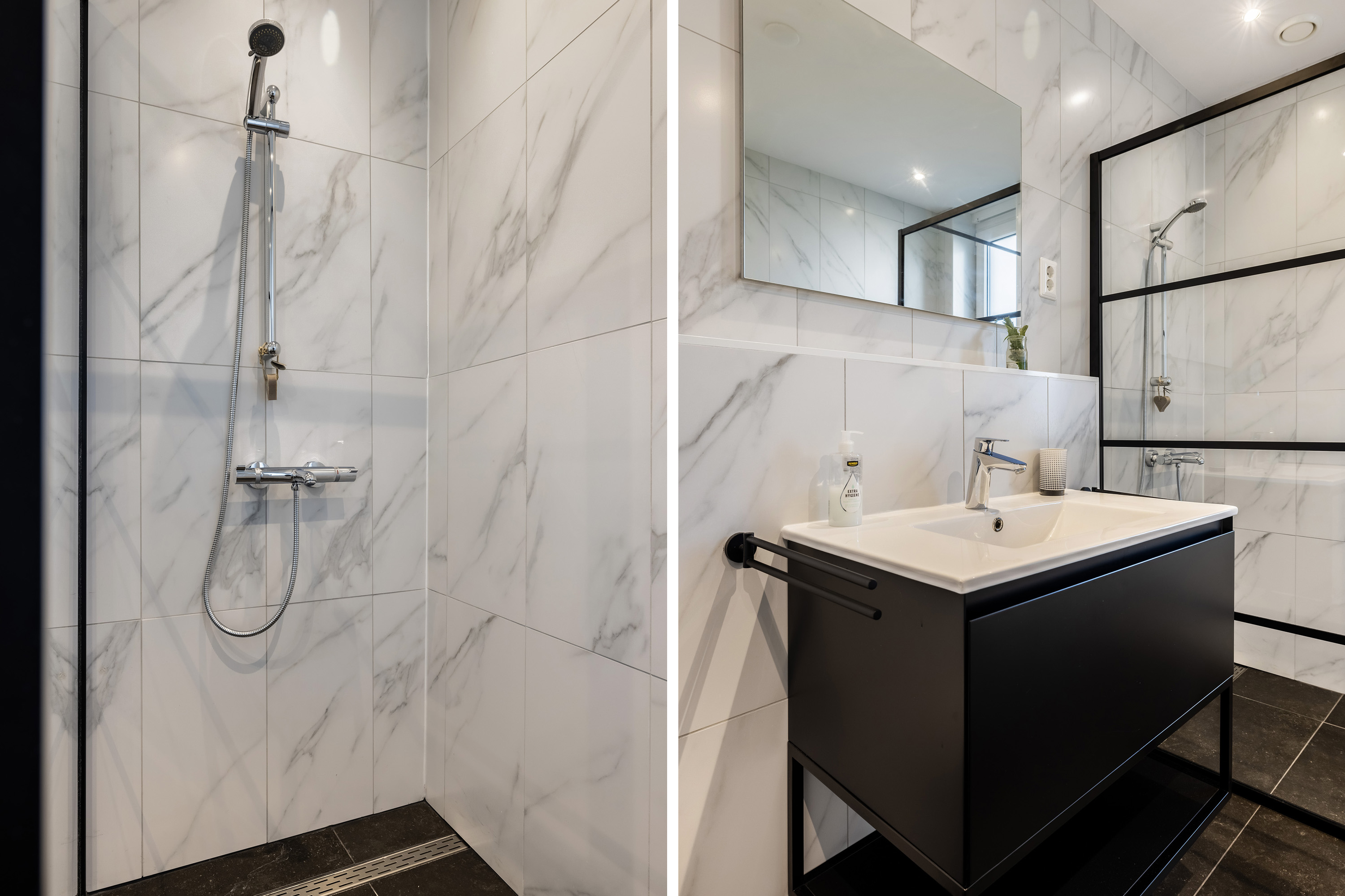 Also accessed from the kitchen, this luxurious fully tiled bathroom features a walk-in shower with thermostat tap, wall-hung toilet, and washbasin unit. It connects to the adjacent bedroom via a sliding door.