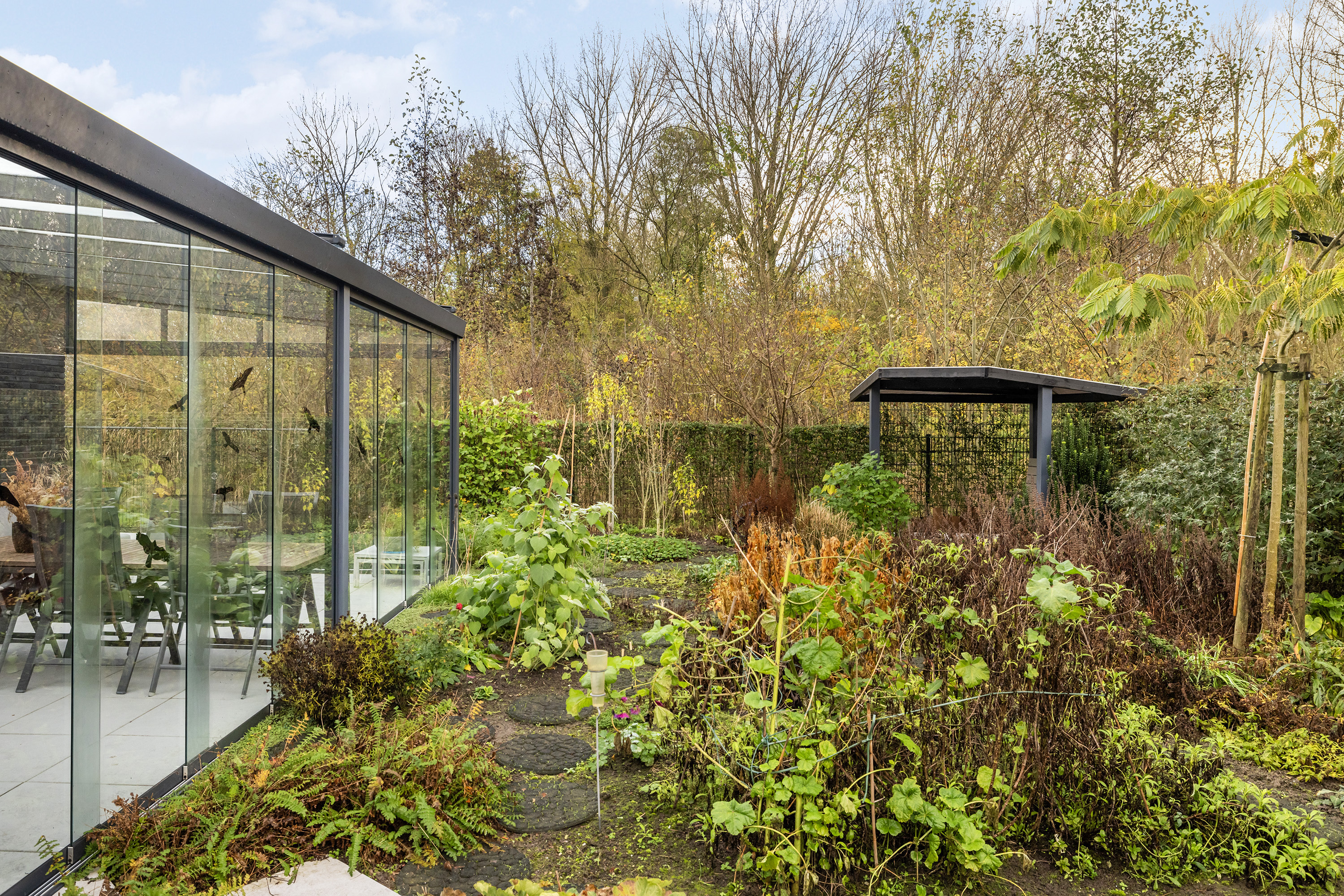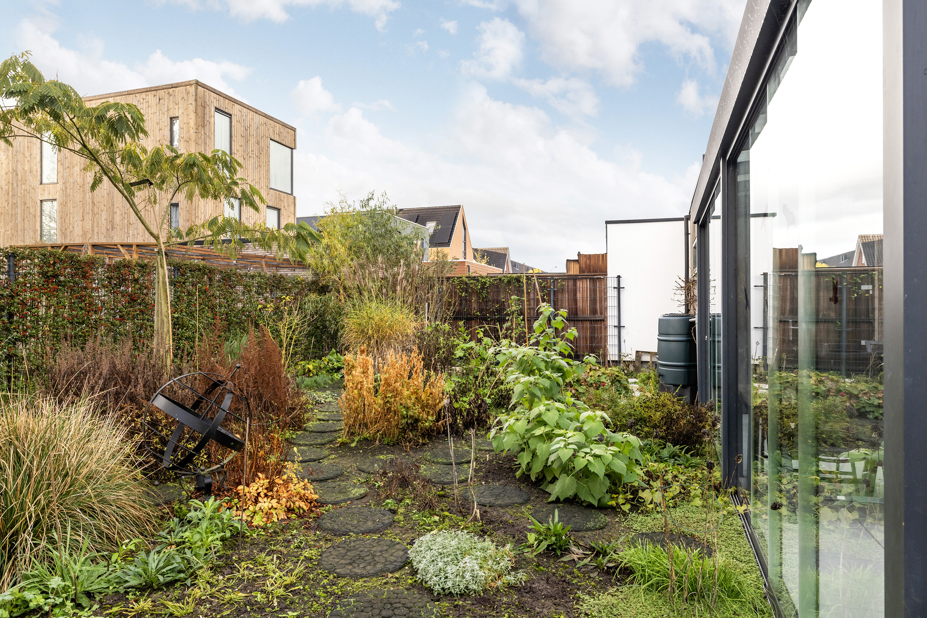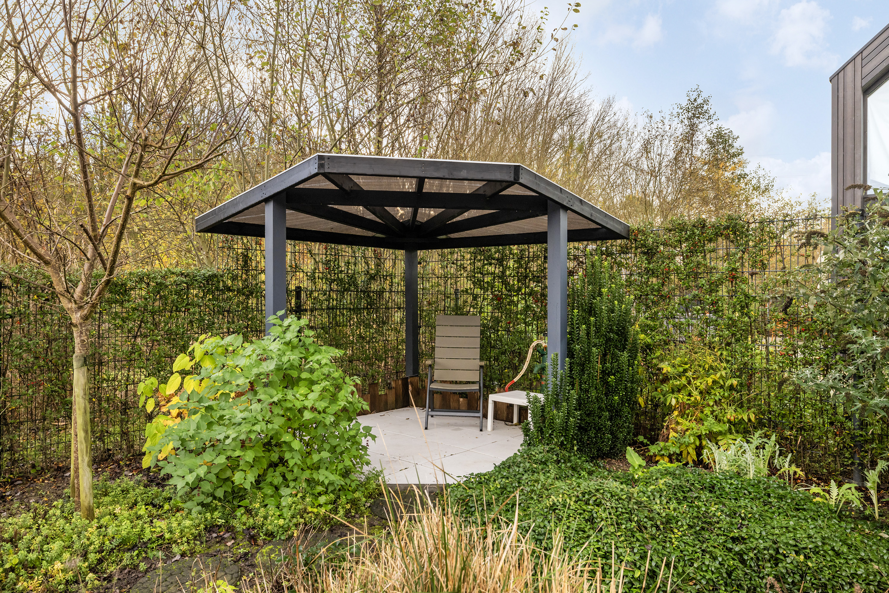 A beautifully landscaped south-facing garden, with sun and shade terraces, perfect for enjoying the outdoors and lush surroundings. Includes a garden pavilion (approx. 5.5 m²), several rain barrels, and a side entrance.