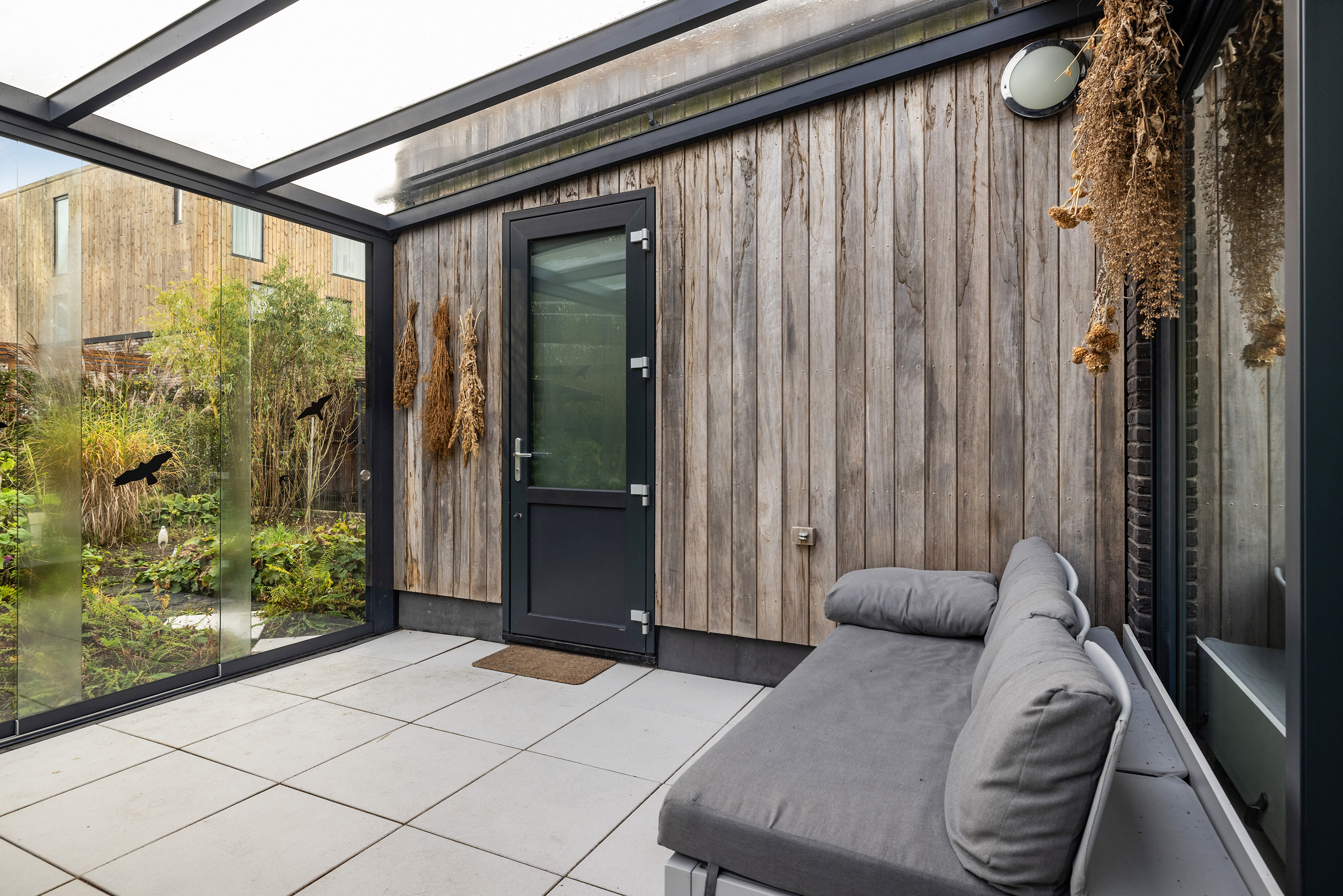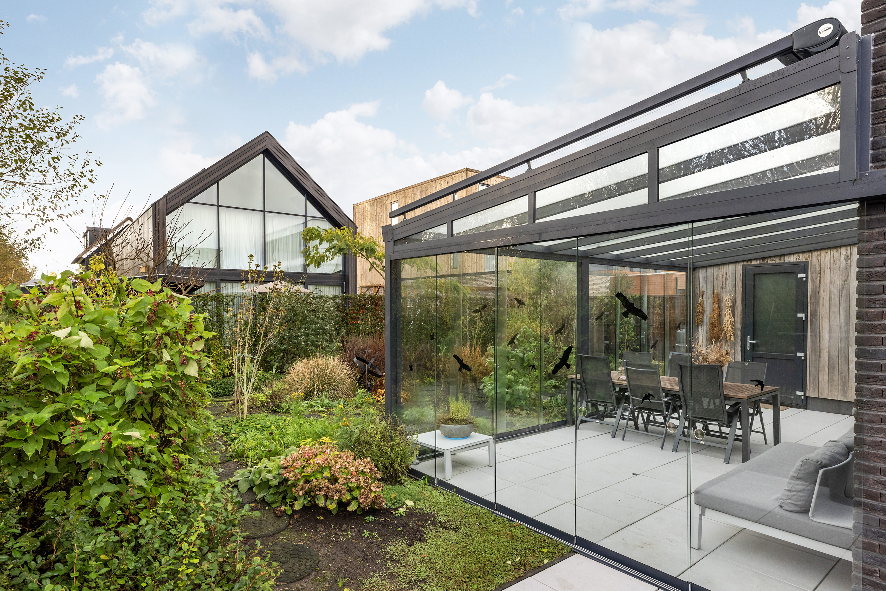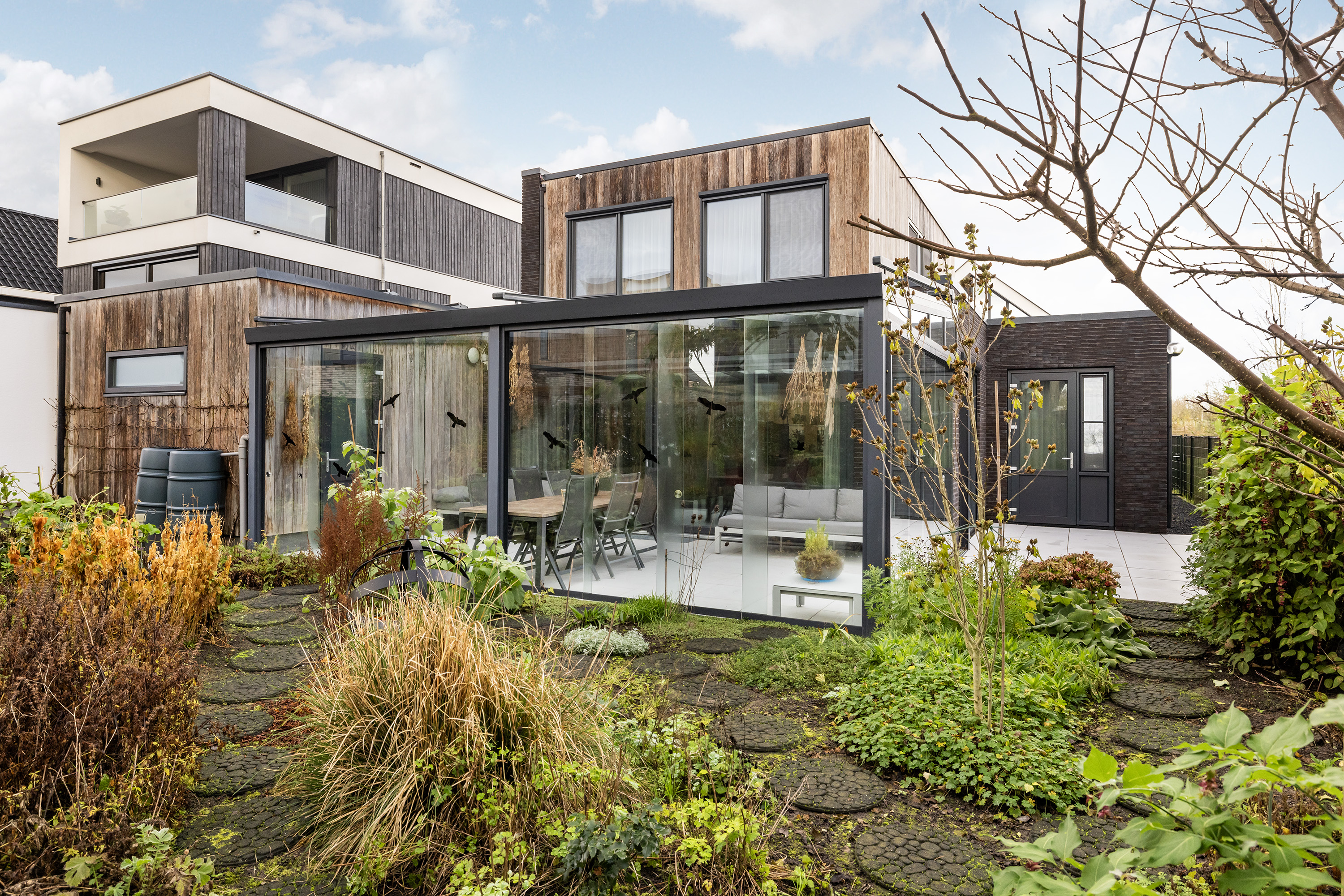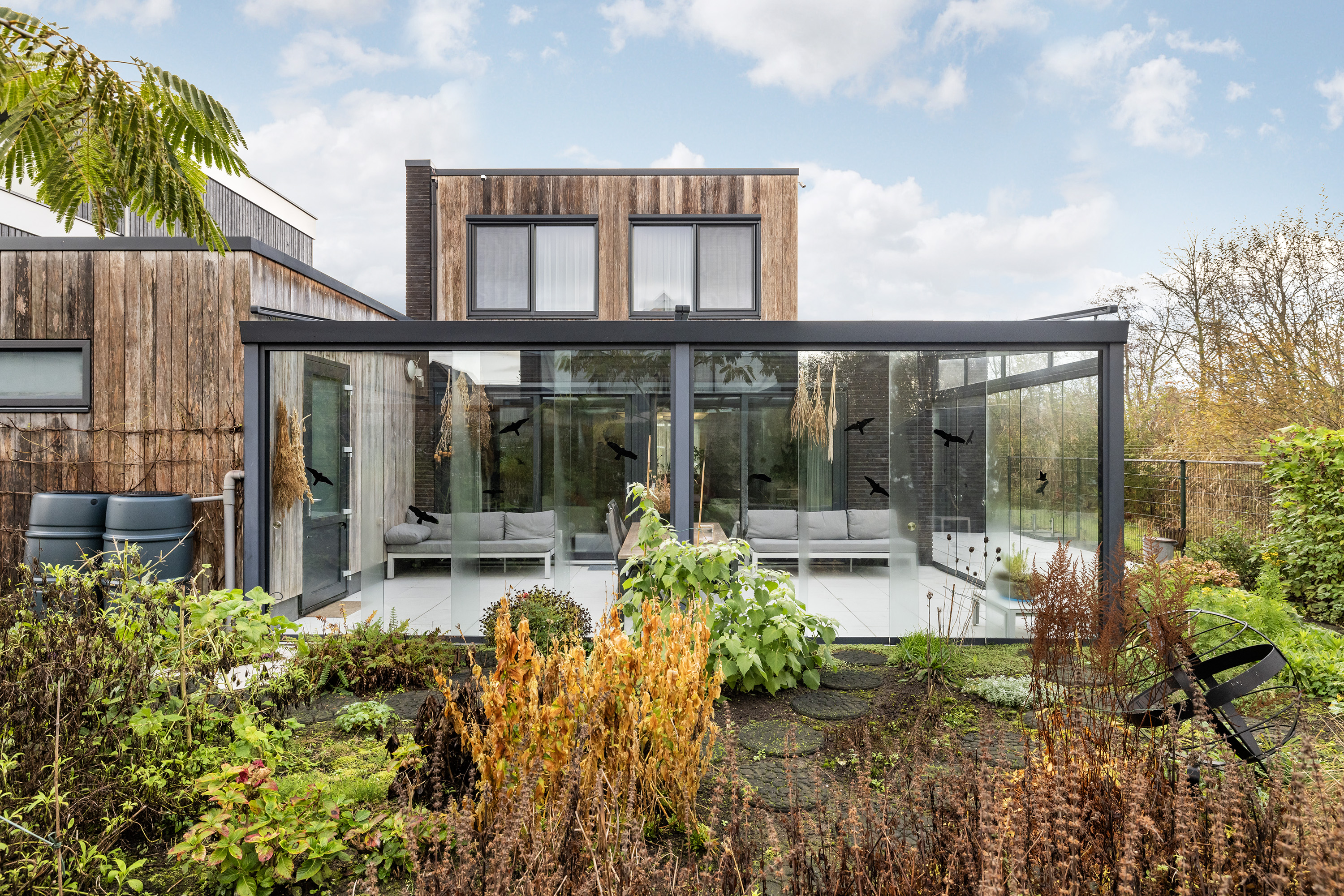 A beautifully landscaped south-facing garden, with sun and shade terraces, perfect for enjoying the outdoors and lush surroundings. Includes a garden pavilion (approx. 5.5 m²), several rain barrels, and a side entrance.