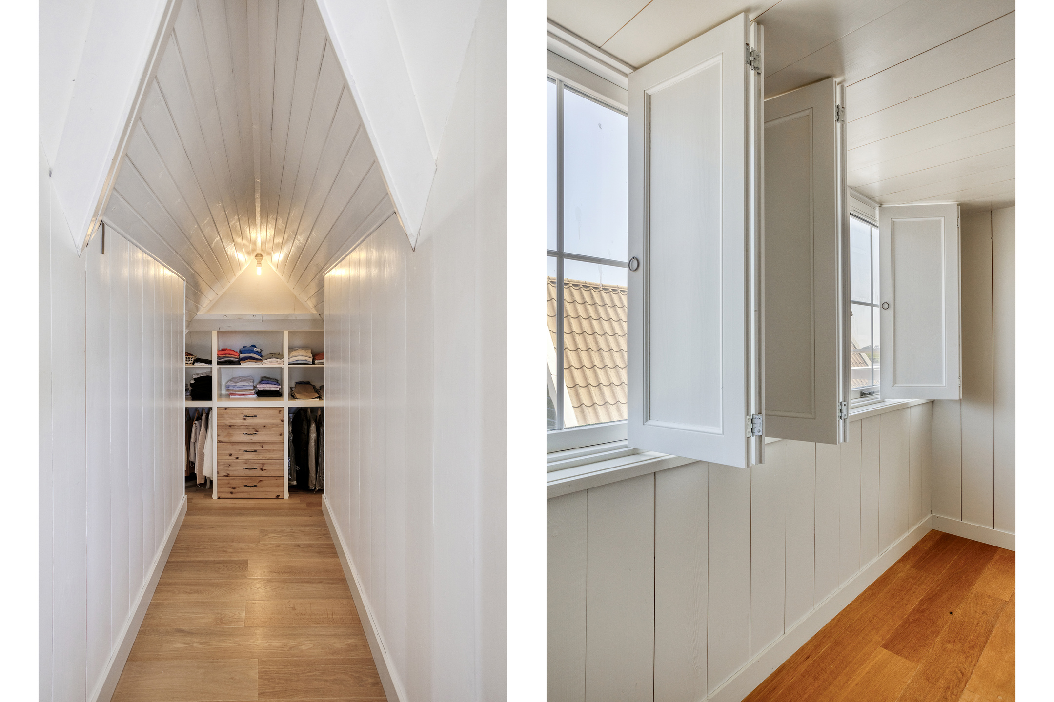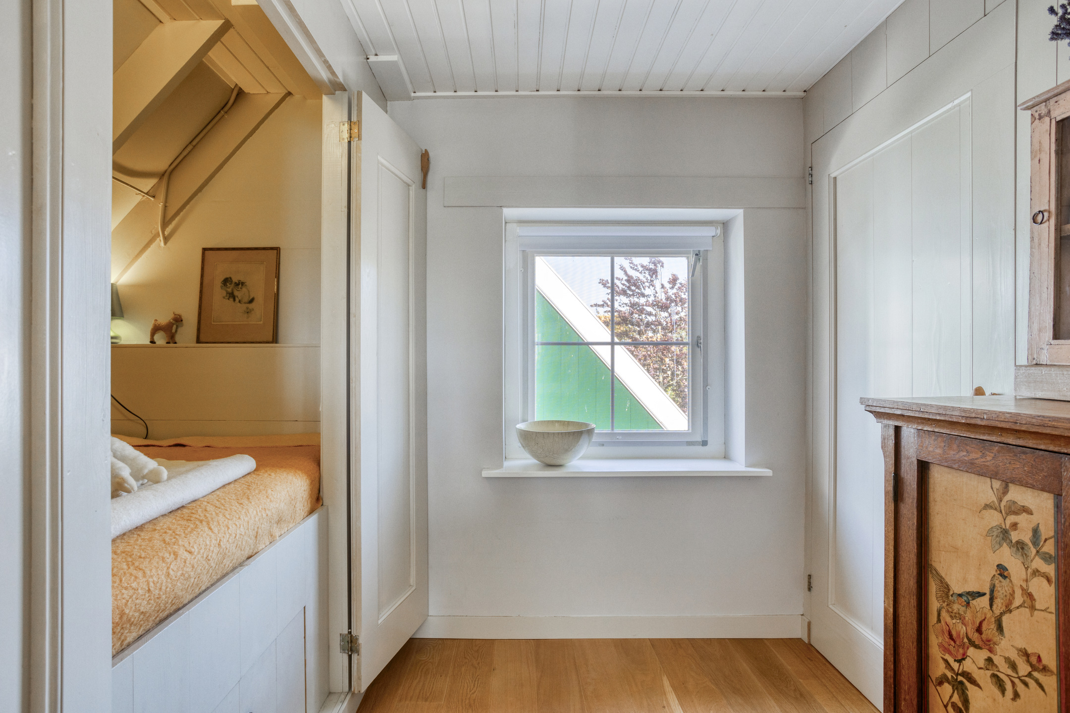 The first floor is divided between the front and rear sections of the house. In the front, you’ll find two spacious bedrooms, each with storage behind the knee walls. In the rear, a wide staircase leads to a charming landing with a built-in box bed—a unique feature sure to appeal to children. From here, you access the spacious master bedroom, which includes built-in wardrobes, a storage loft, and French doors opening onto a large rooftop terrace with panoramic views of the surrounding landscape.