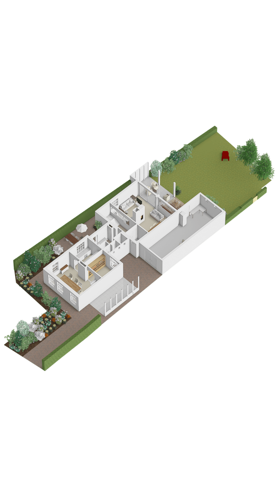 The house sits on a generous plot with a well-maintained, south-facing garden, where various seating areas have been created to enjoy both the morning and evening sun. The property also features a driveway with a carport and a spacious garage, perfect for parking or DIY projects.