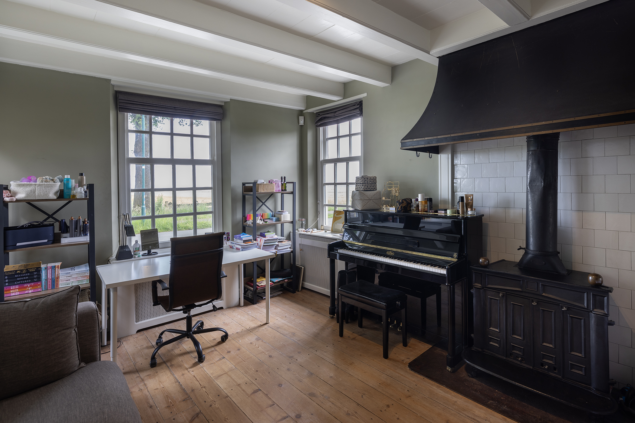 De opkamer met uitzicht op de polder is een geweldige werkkamer, voorzien van een grote schouw en een eigen entree. Onder deze kamer bevindt zich één van de twee kelders, nu in gebruik als royale wasruimte. De verdieping biedt nog meer ruimte: 4 slaapkamers, een moderne badkamer, apart toilet en zelfs een bedstee voor wie het knus wil houden.