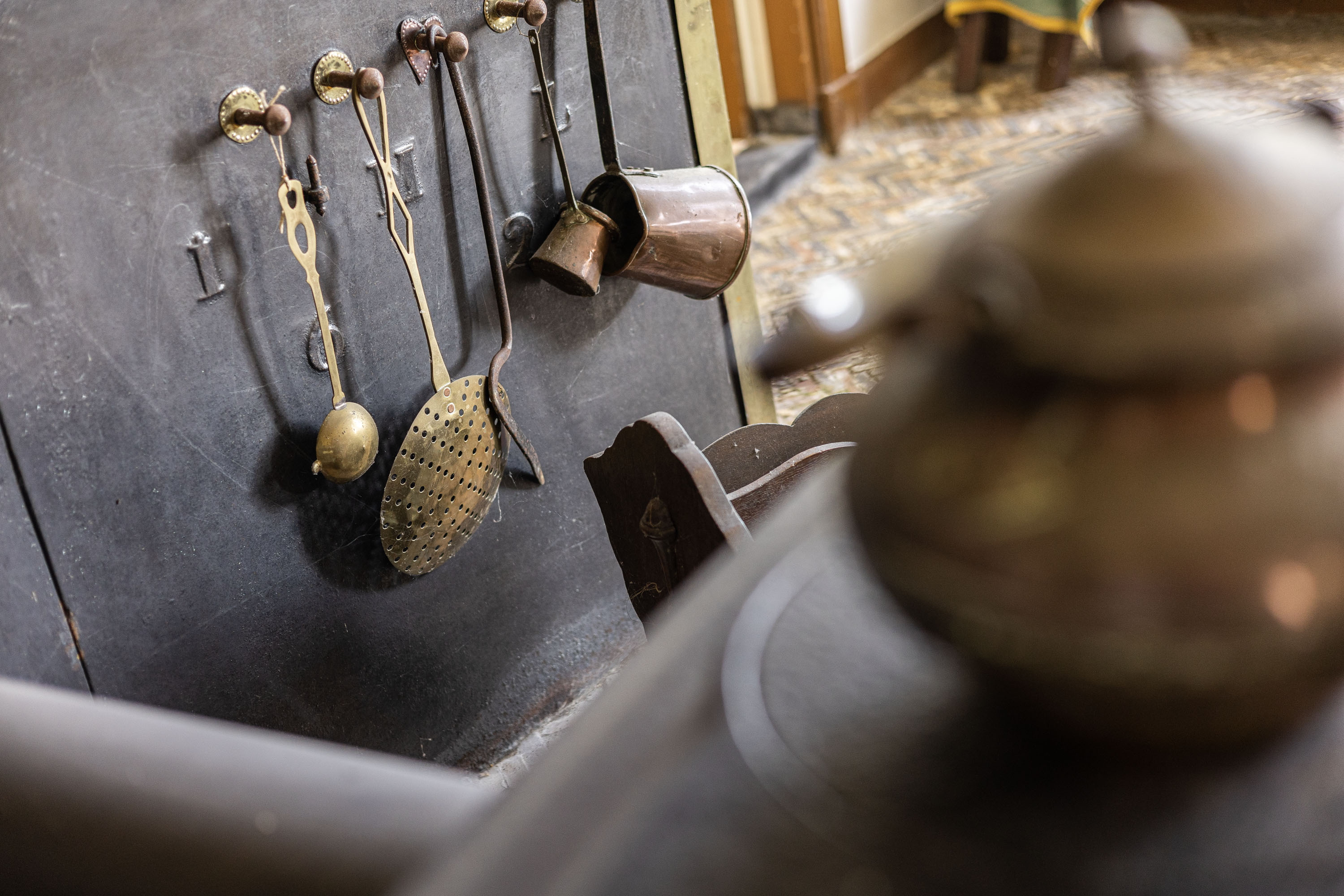 On the ground floor you will find an entry hall with stairs, a spacious kitchen with access to the cellar and a magnificent monumetal living room with an original fireplace, unique earthenware floor and high ceilings. There are also three rooms, one currently used as a temporary bathroom and one as an office. Between the two wings of the farmhouse, there is an additional shower, a storage room with washing machine and dryer connections and access to a cozy patio.