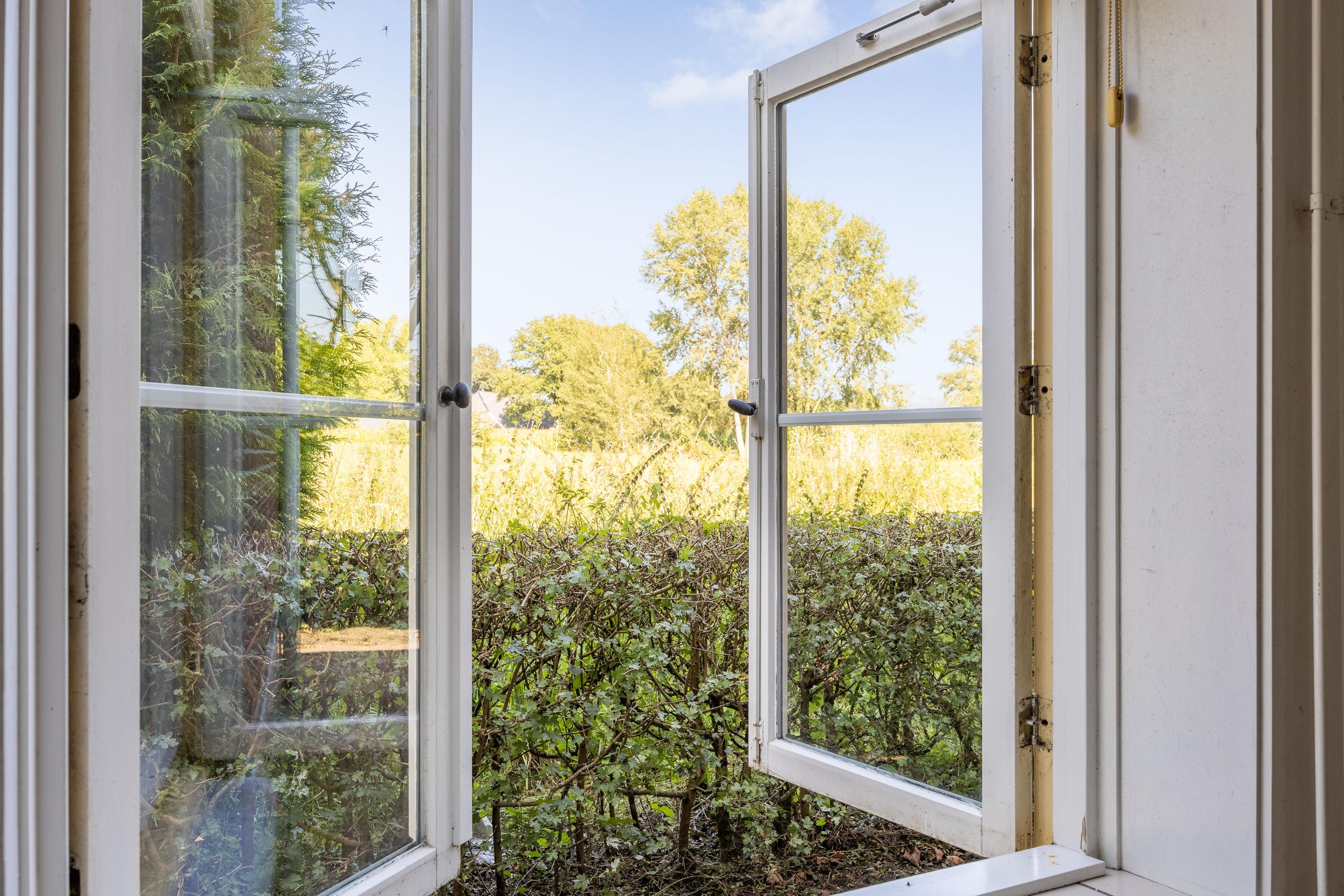 The house is accessible via a tree-lined driveway with several old, characteristic oak trees and a lawn in front of the house. On the other side a lush country garden has been laid out with a high-stem fruit orchard surrounded by a hawthorn hedge, a “round garden” with fruit trees, rhododendrons, a natural meadow and seating areas in every imaginable spot. Here you can enjoy the garden, nature and the frequent visits of wildlife throughout the grounds.