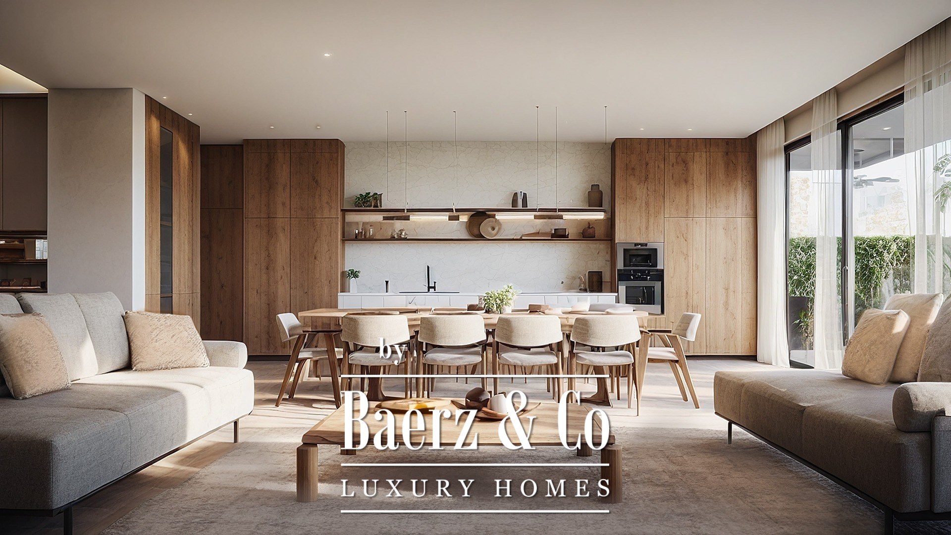 The main floor opens with expansive full-height windows to the private garden, a covered porch, and a secluded pool, placing indoor and outdoor living in quiet dialogue. The living-dining area, anchored by a fully equipped designer kitchen, fosters convivial movement between interior warmth and the Mediterranean outside. Guest accommodation includes an en-suite bedroom and discreet guest toilet at this level.