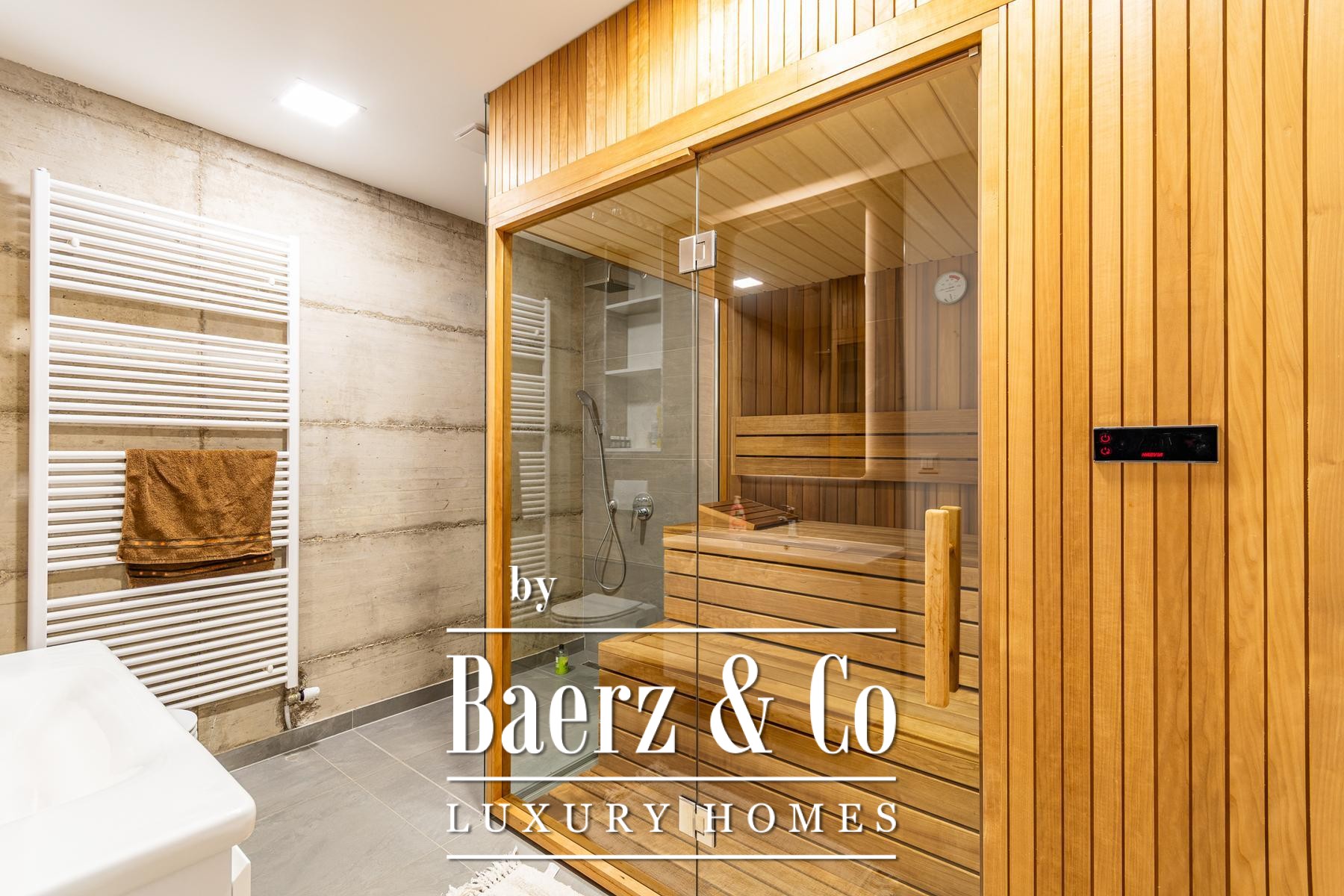 The villa’s architecture flows effortlessly between its three levels. The ground floor features an open kitchen, dining, and living zone, anchored by a fireplace and opening onto a broad terrace that welcomes natural light. A bedroom and bathroom with WC complete this floor. On the first level, a separate entrance leads to two bedrooms, a spacious bathroom, and a flexible kitchenette and living arrangement, with another terrace that frames the scenery. The finished basement provides a private sauna, wine cellar, and garage, grounding the home in quiet luxury.