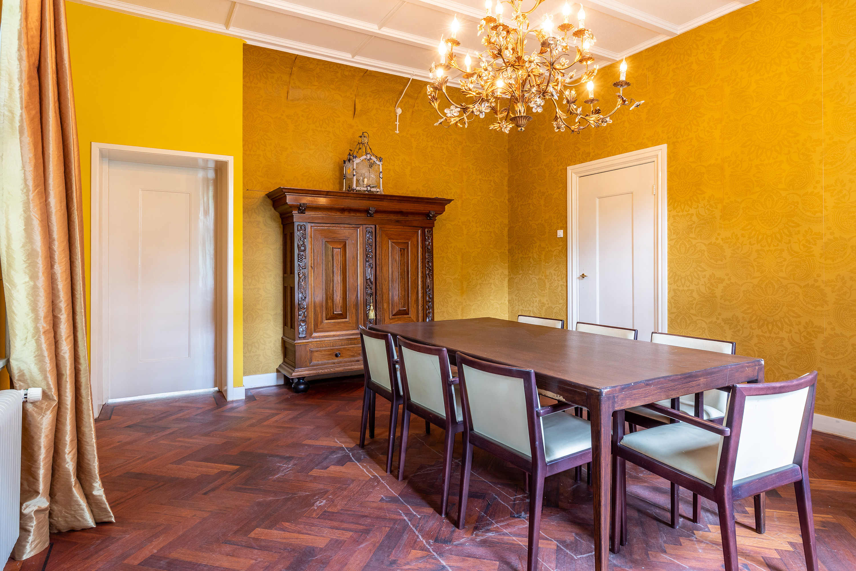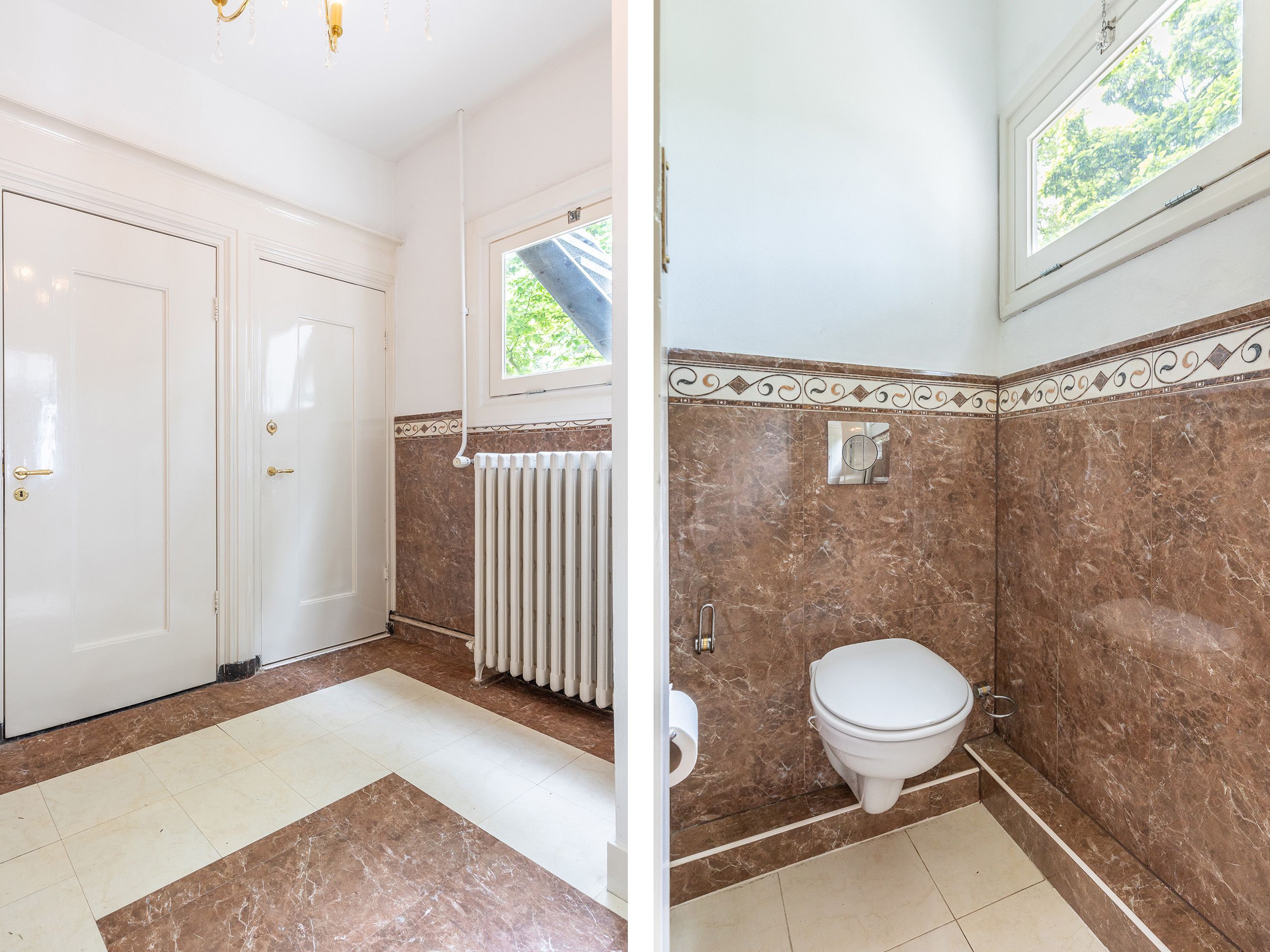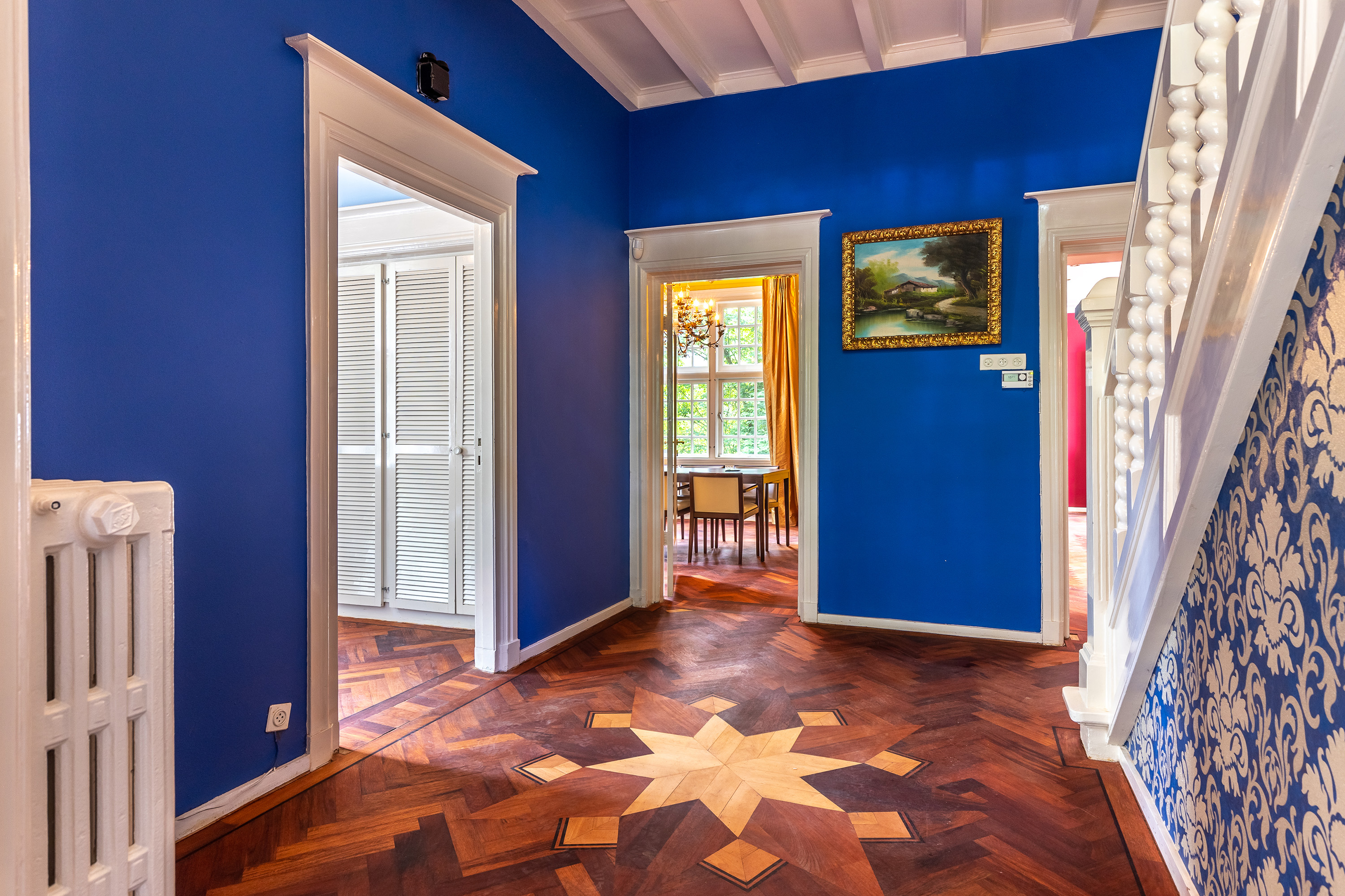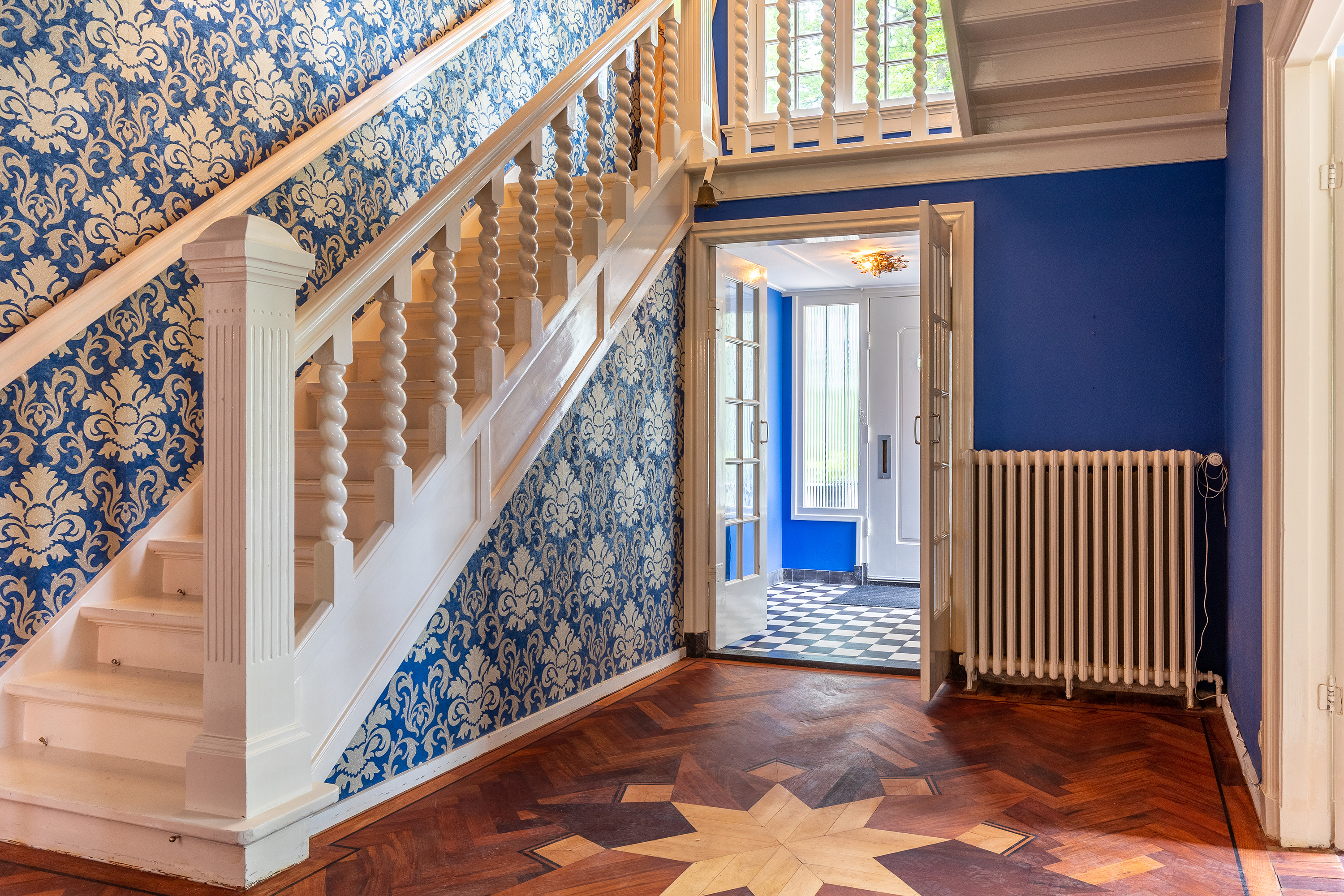 The stately front door opens into a classic vestibule, finished with black-and-white floor tiling and a modern meter cupboard equipped with extensive electrical installations. Double doors lead into the central hallway, where a herringbone parquet floor with decorative border, high ceilings and a refined staircase immediately set the tone for the home’s distinguished character.