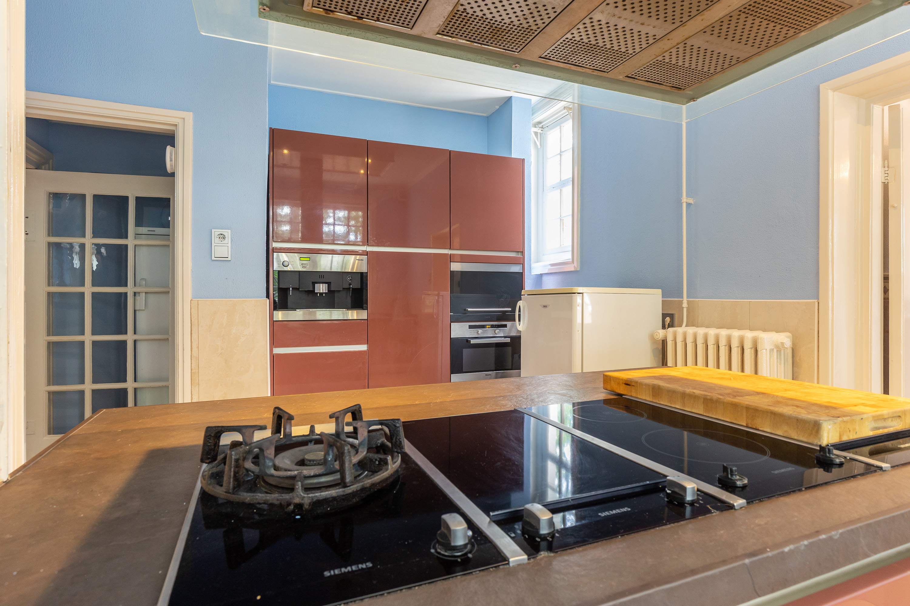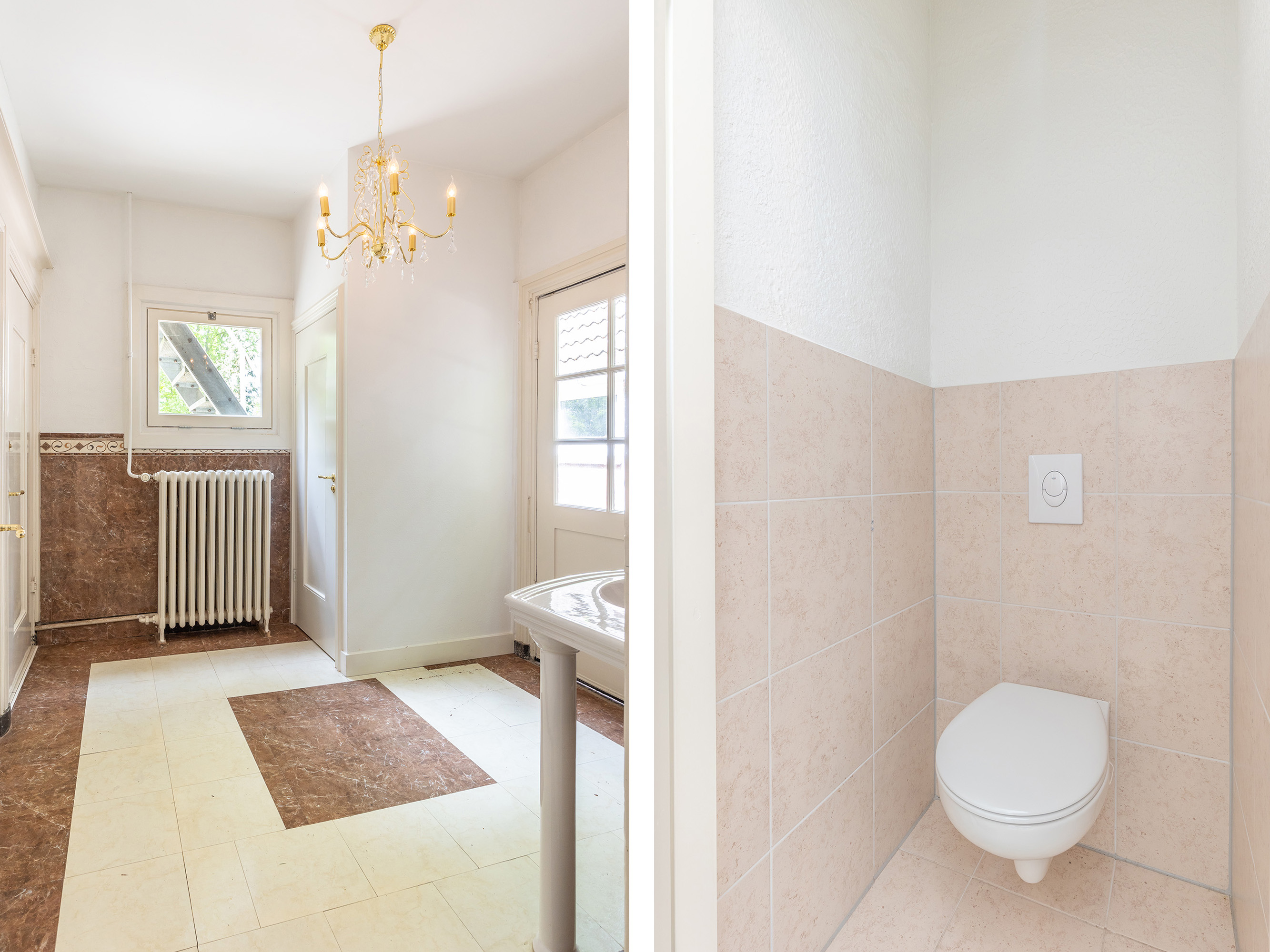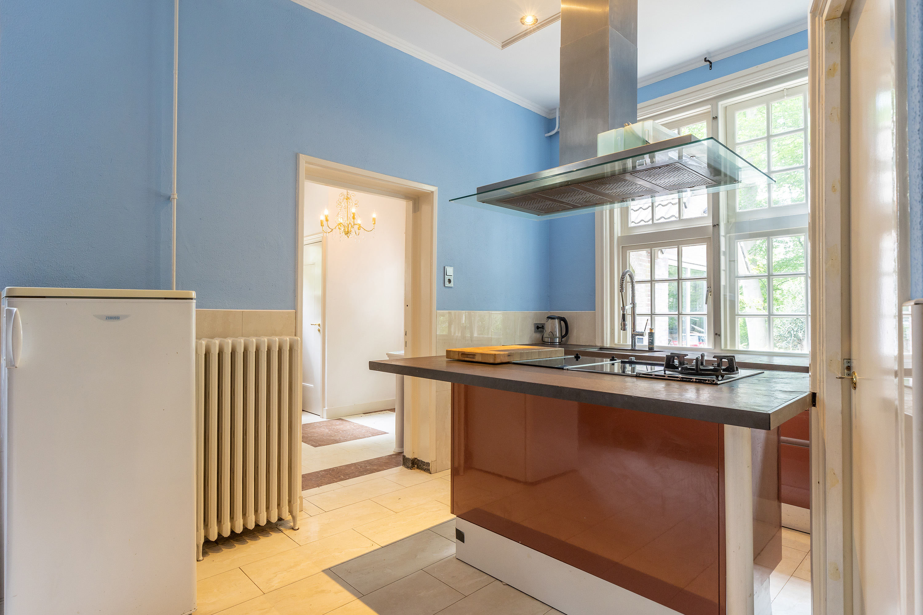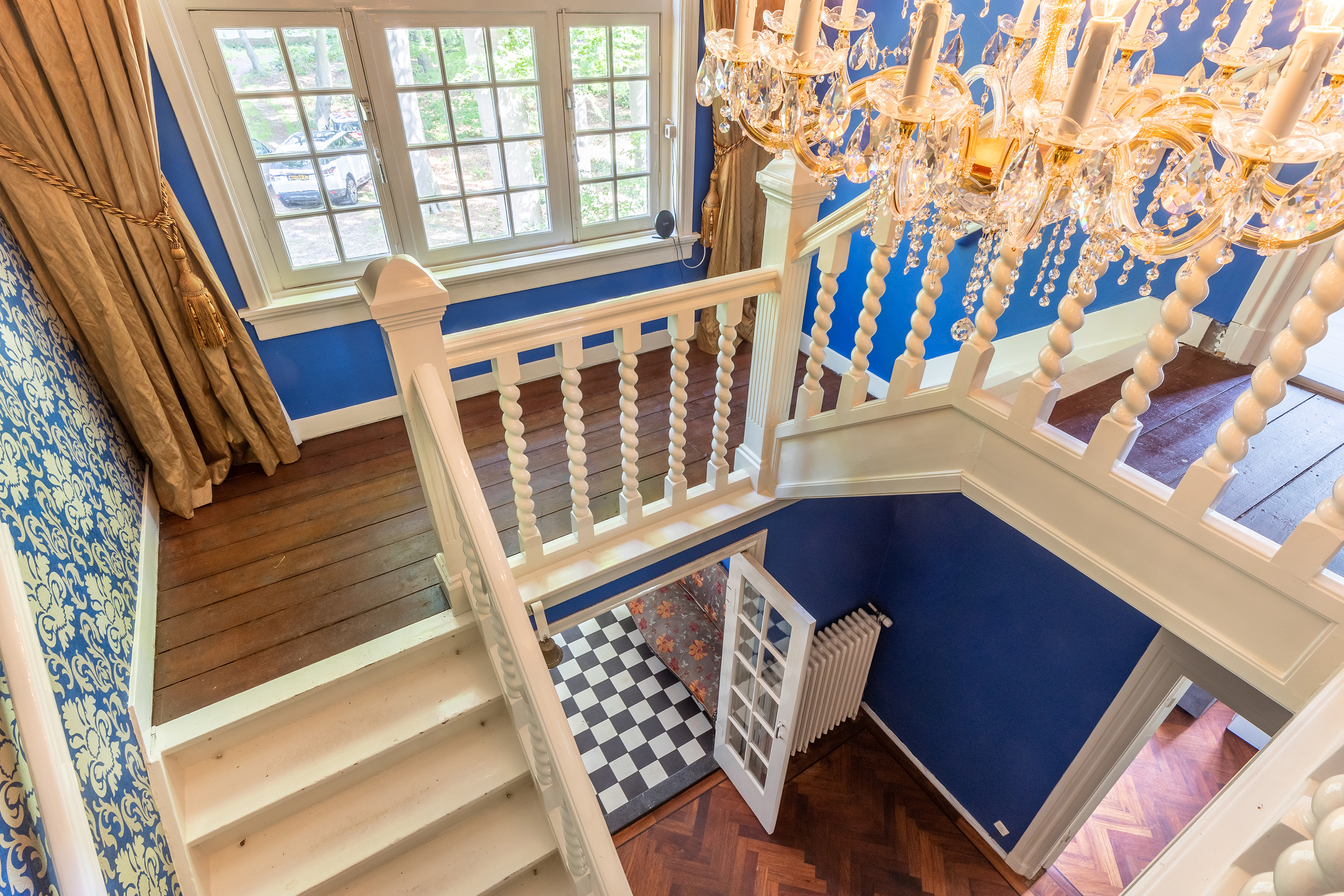The stately front door opens into a classic vestibule, finished with black-and-white floor tiling and a modern meter cupboard equipped with extensive electrical installations. Double doors lead into the central hallway, where a herringbone parquet floor with decorative border, high ceilings and a refined staircase immediately set the tone for the home’s distinguished character.
