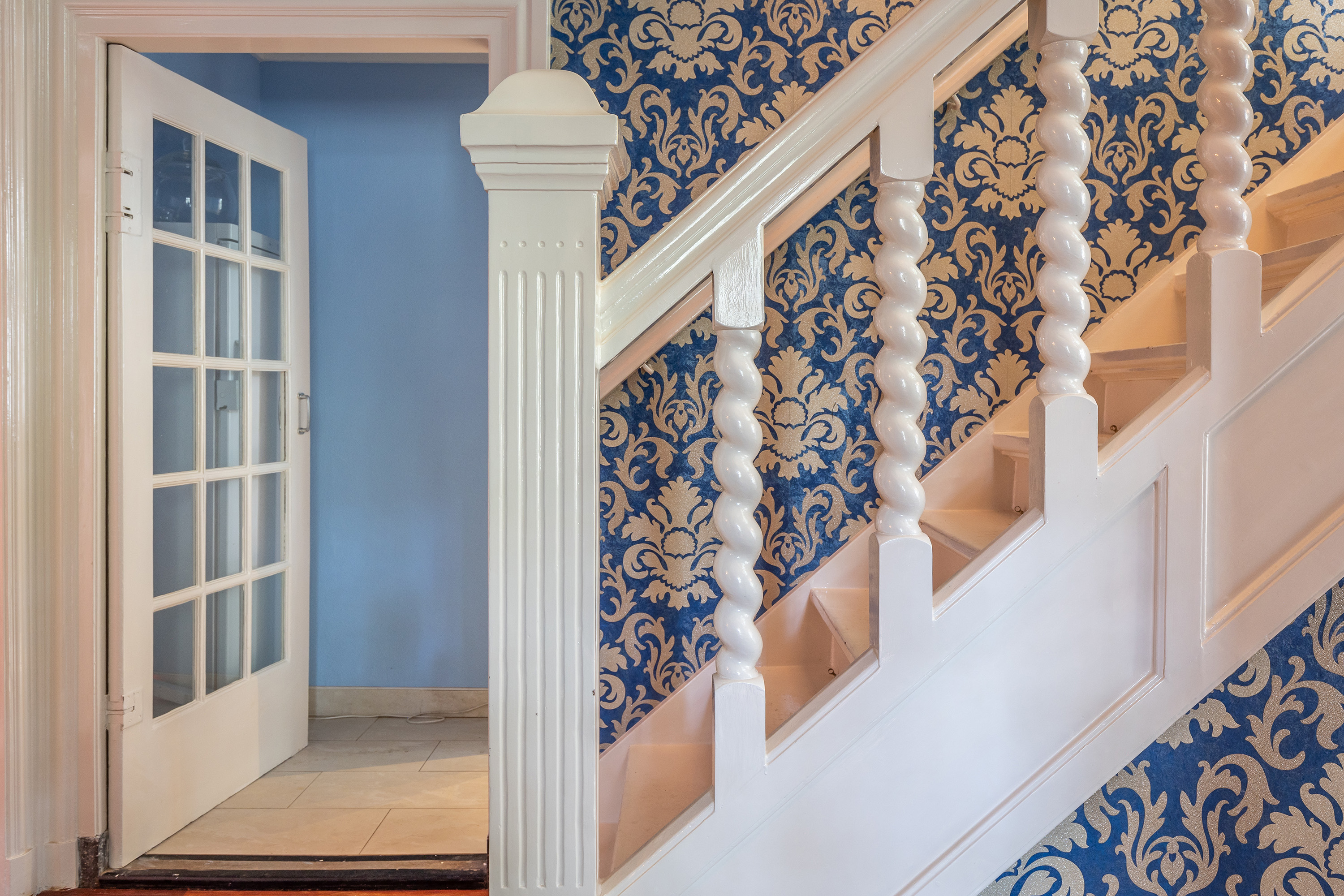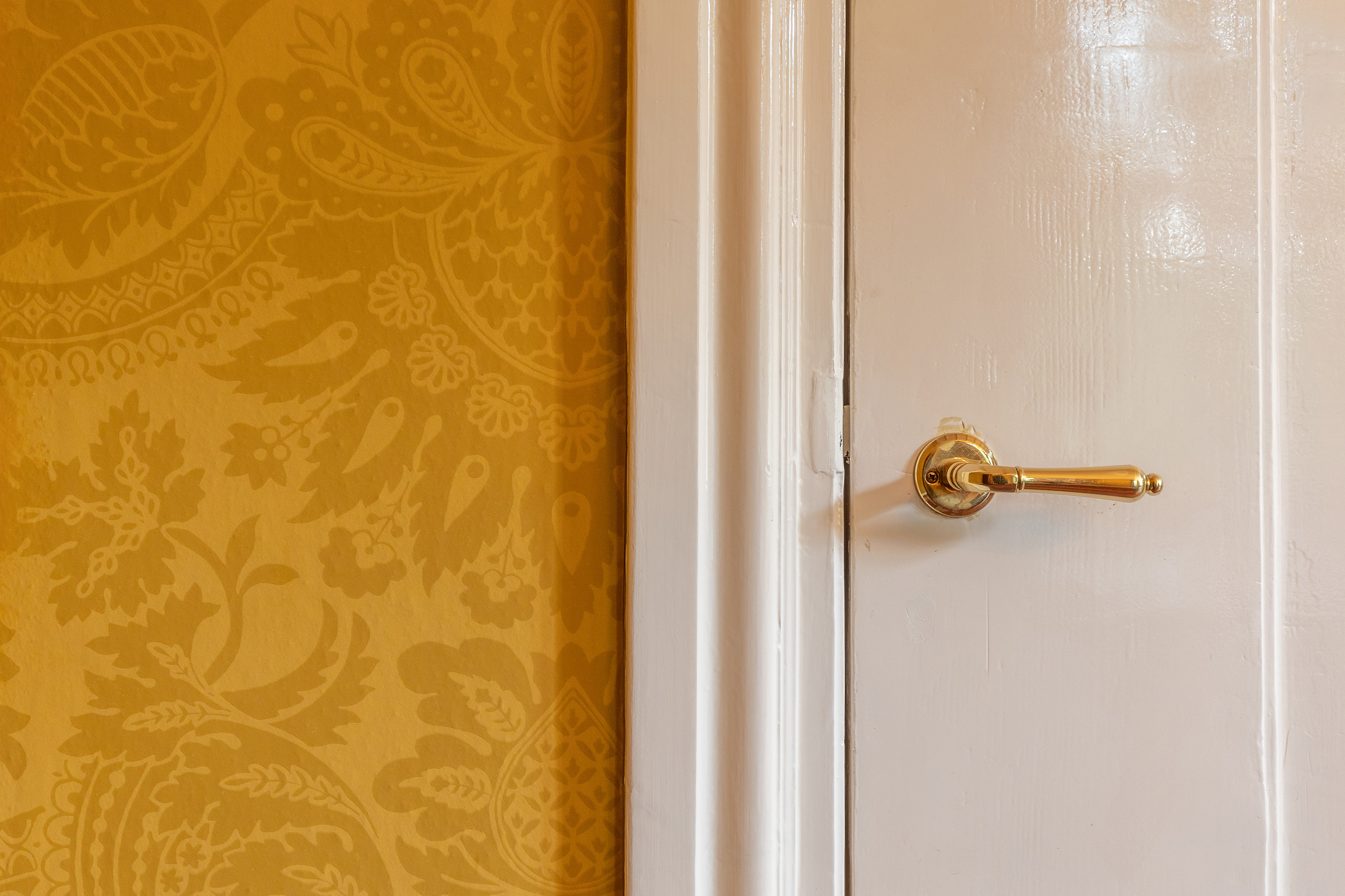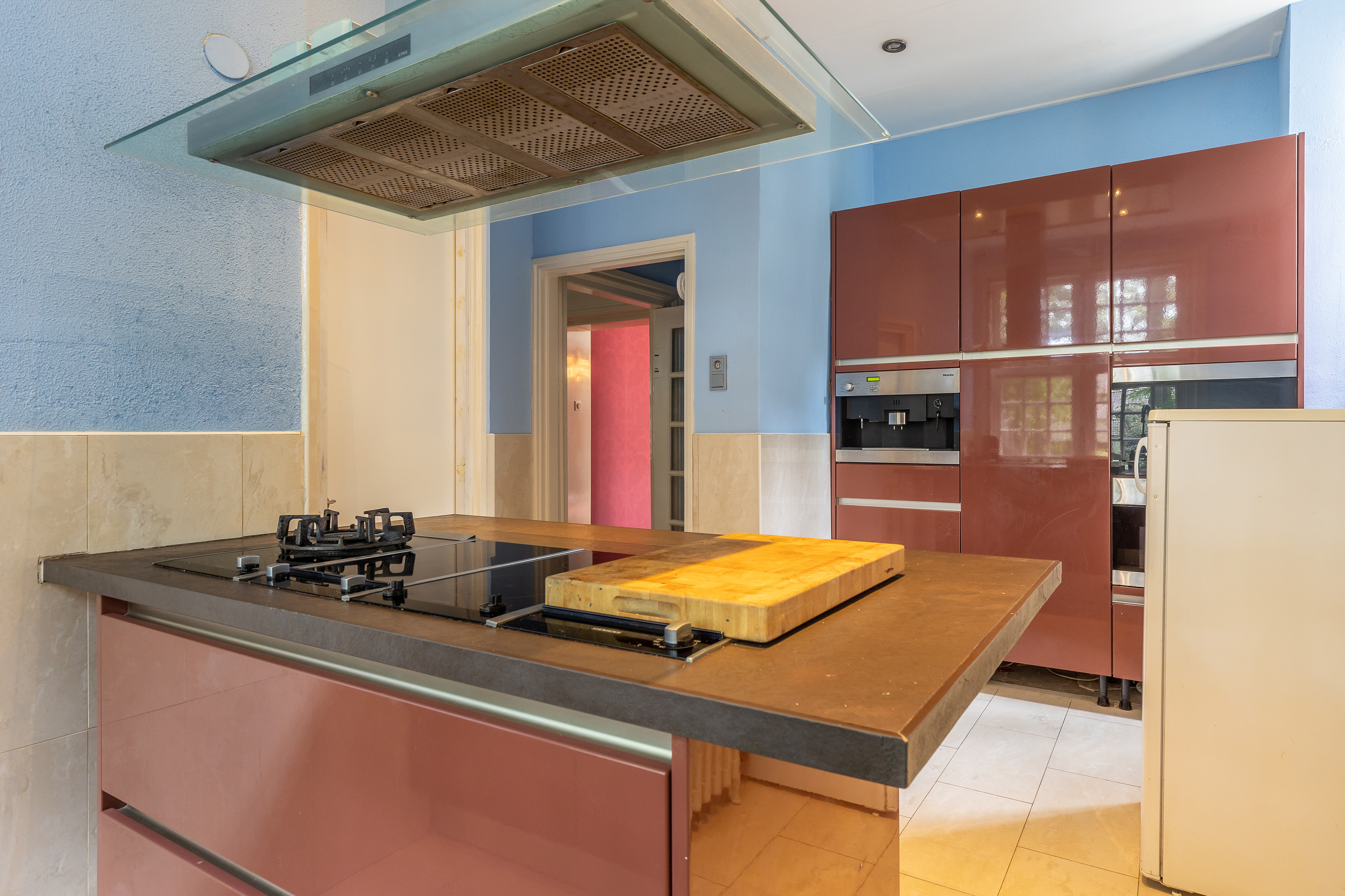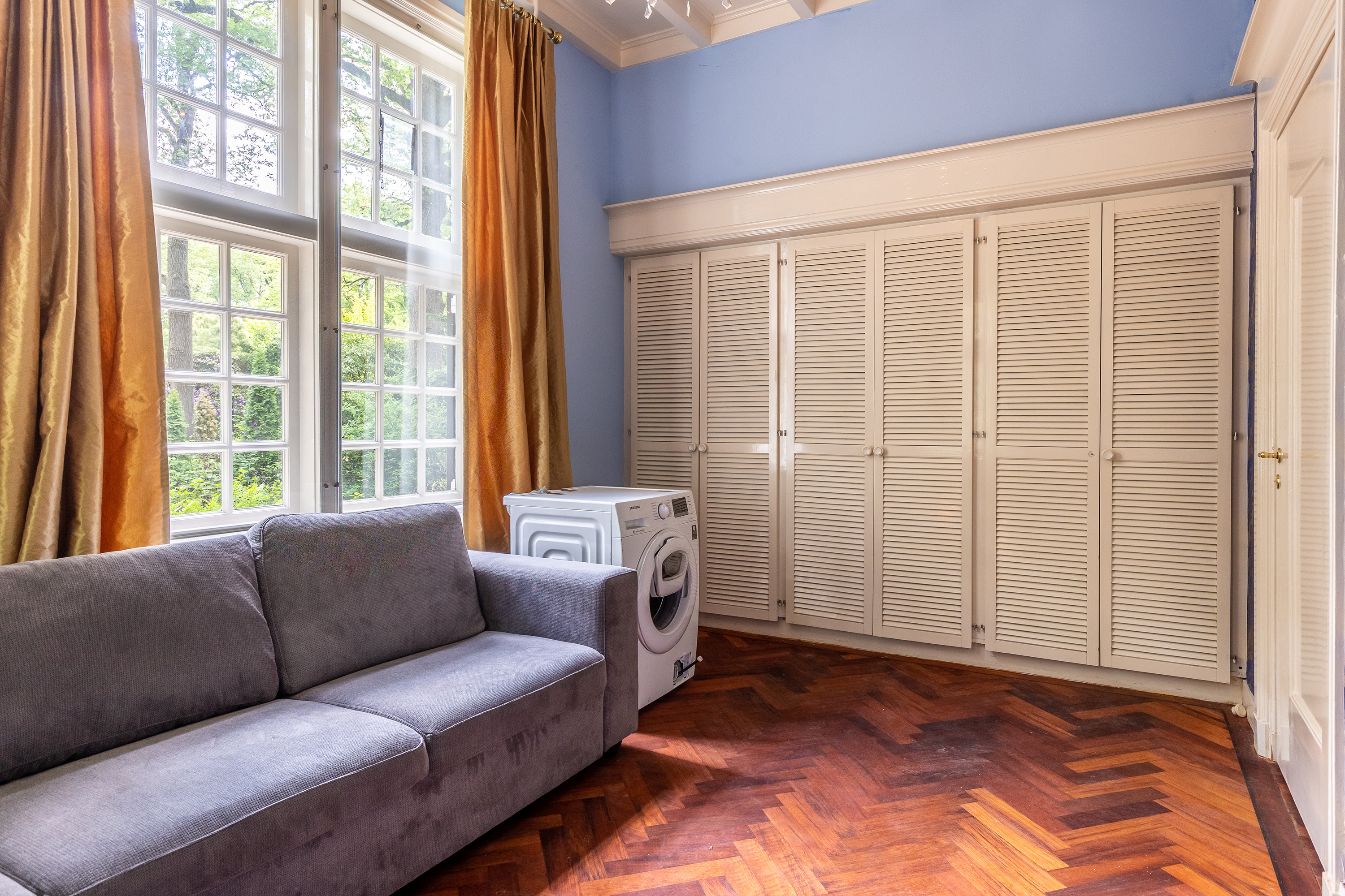 The stately front door opens into a classic vestibule, finished with black-and-white floor tiling and a modern meter cupboard equipped with extensive electrical installations. Double doors lead into the central hallway, where a herringbone parquet floor with decorative border, high ceilings and a refined staircase immediately set the tone for the home’s distinguished character.