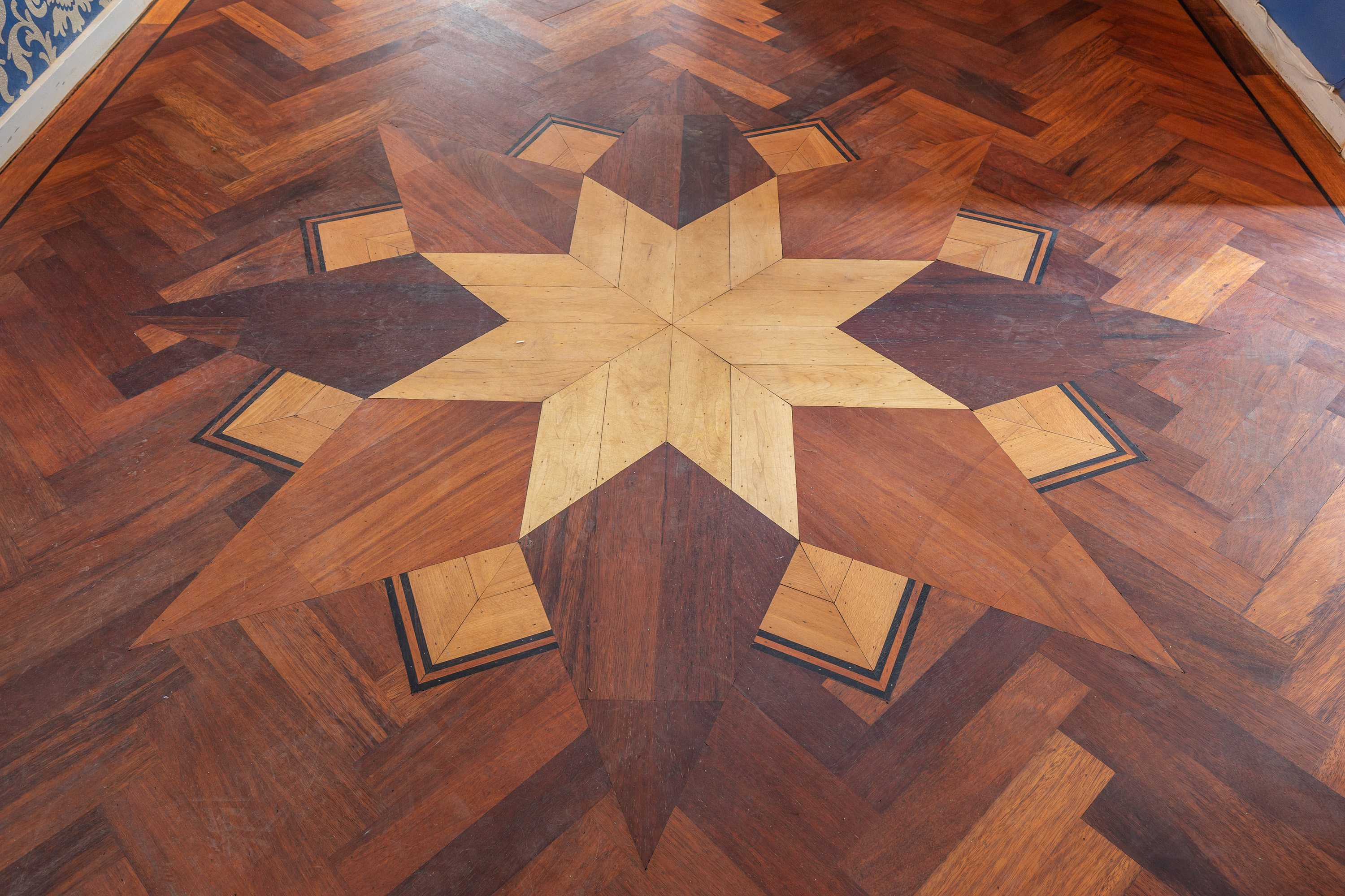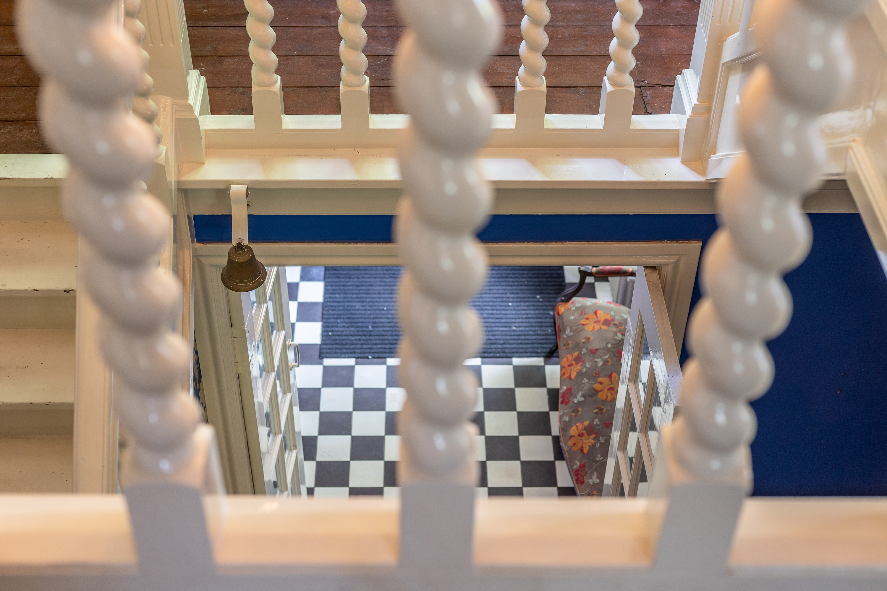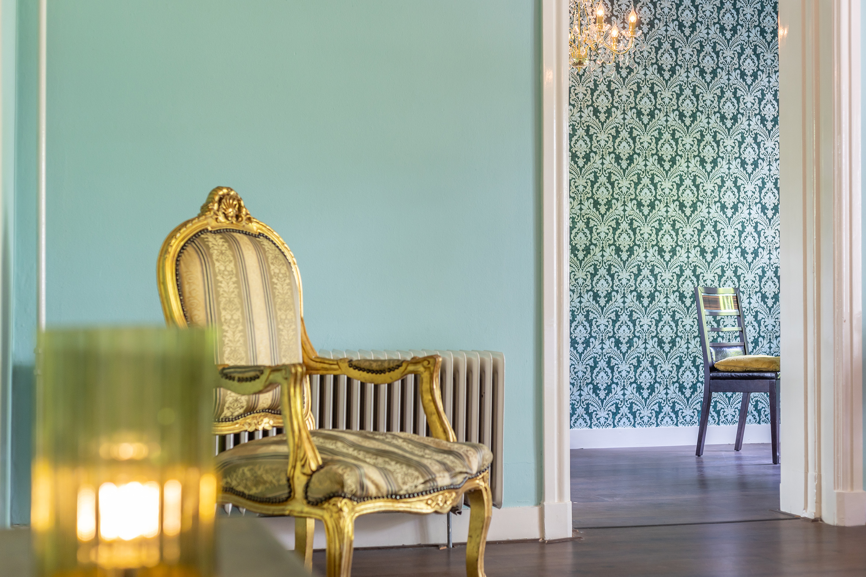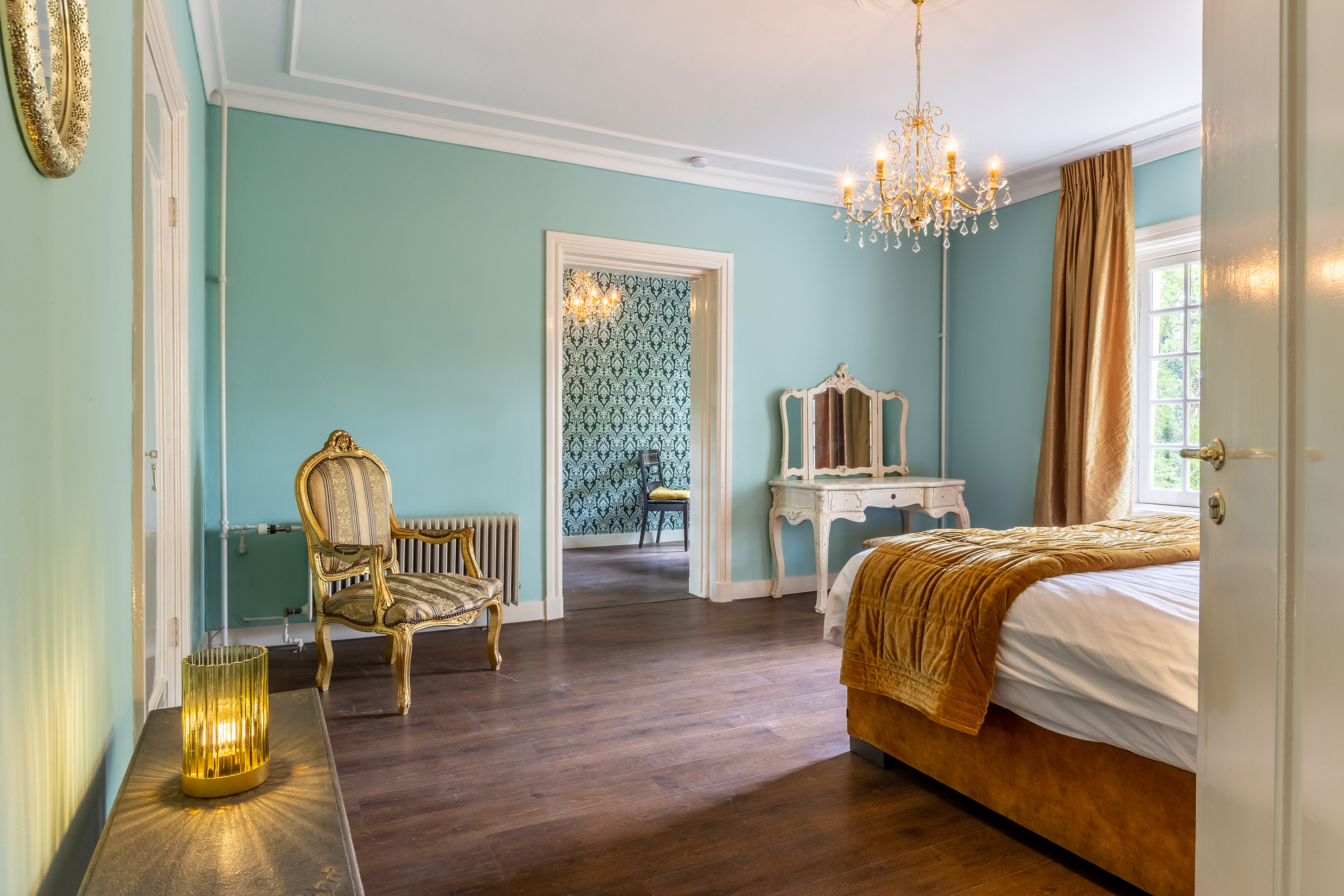 The stately front door opens into a classic vestibule, finished with black-and-white floor tiling and a modern meter cupboard equipped with extensive electrical installations. Double doors lead into the central hallway, where a herringbone parquet floor with decorative border, high ceilings and a refined staircase immediately set the tone for the home’s distinguished character.