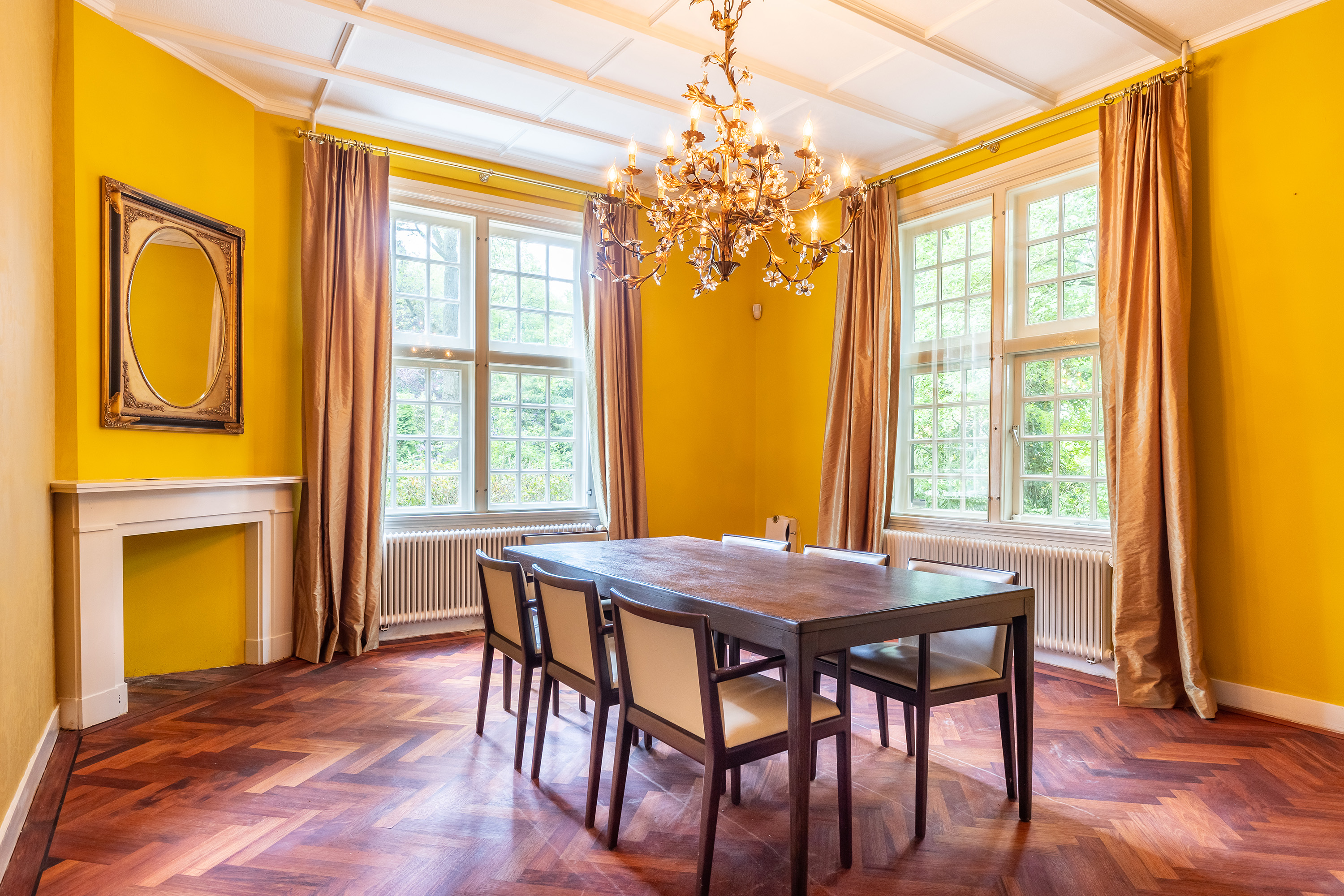 At the front of the house, a dedicated study overlooks the sweeping driveway — an ideal workspace for working from home. The en-suite living and dining rooms form the heart of the residence, featuring tall windows, a traditional marble fireplace and French doors opening onto the terrace. The ambiance is warm and inviting, with ample space for various furniture arrangements.