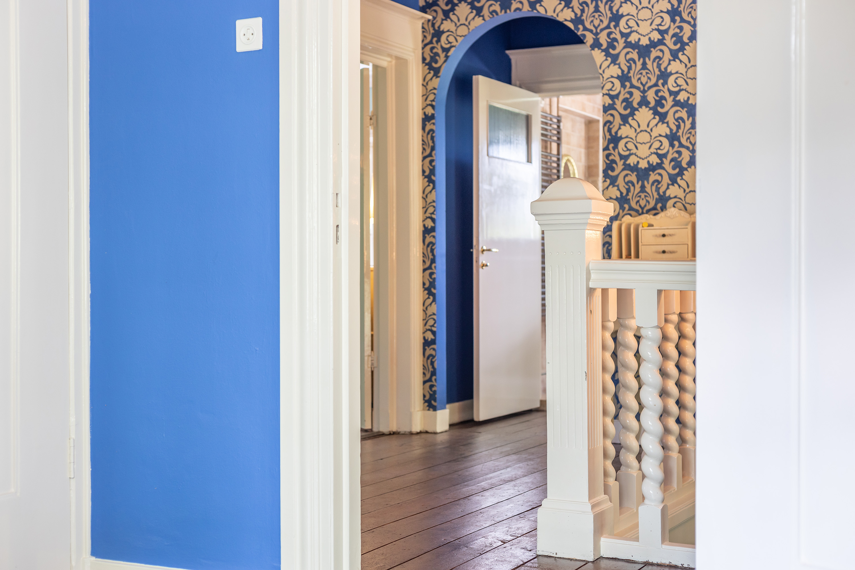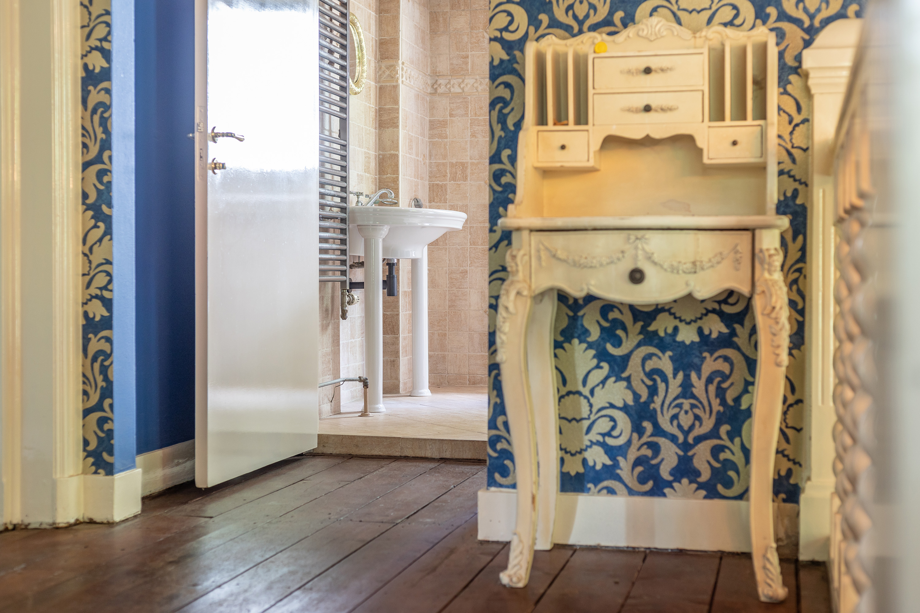 A graceful staircase with open gallery leads to the first floor, where the landing provides access to the bedrooms. The master bedroom at the rear offers both tranquillity and direct access to an adjoining room that could serve equally well as a dressing room or private office. Two further spacious double bedrooms are also located on this floor, one of which benefits from its own en-suite bathroom. All rooms are fitted with bespoke built-in wardrobes. A fourth bedroom, ideal for use as a child’s room, provides access to a generous roof terrace.