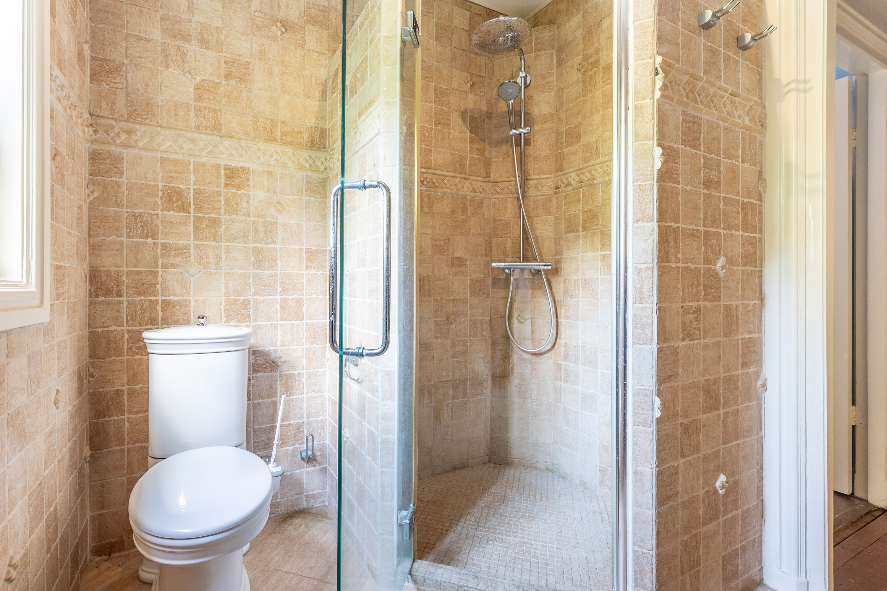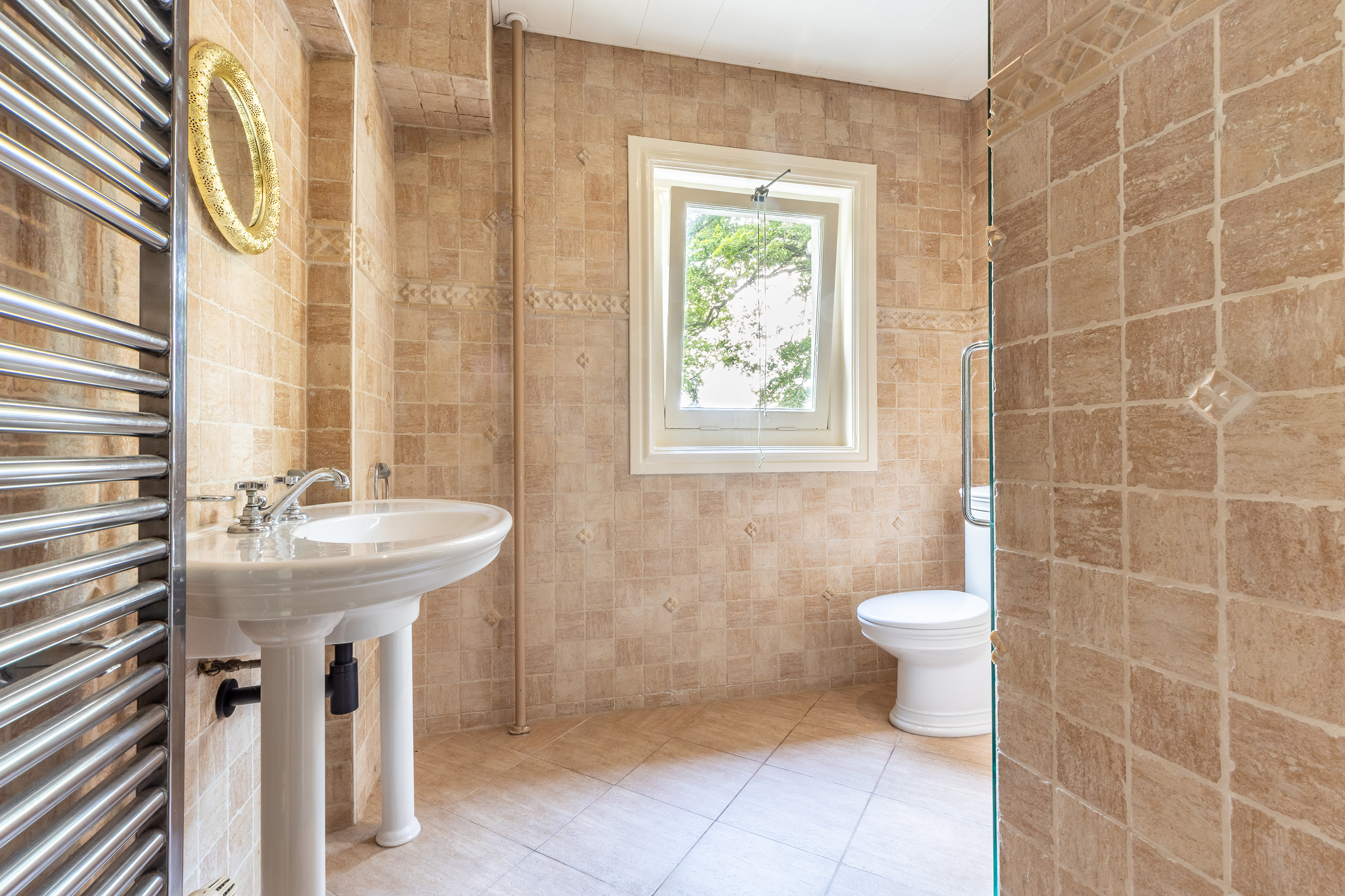 The second bathroom is beautifully finished in tumbled marble, complete with underfloor heating, a walk-in shower, washbasin and toilet.