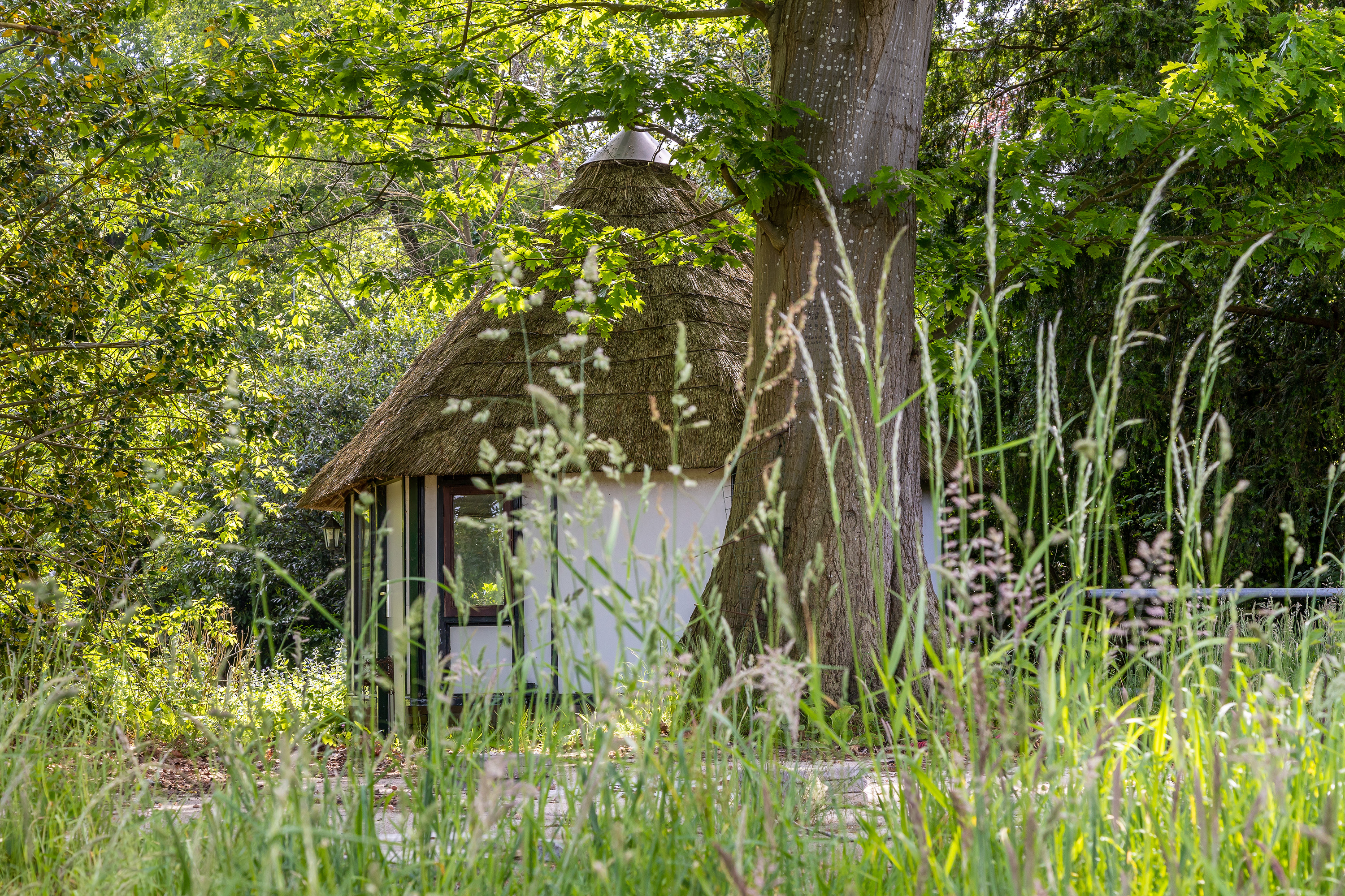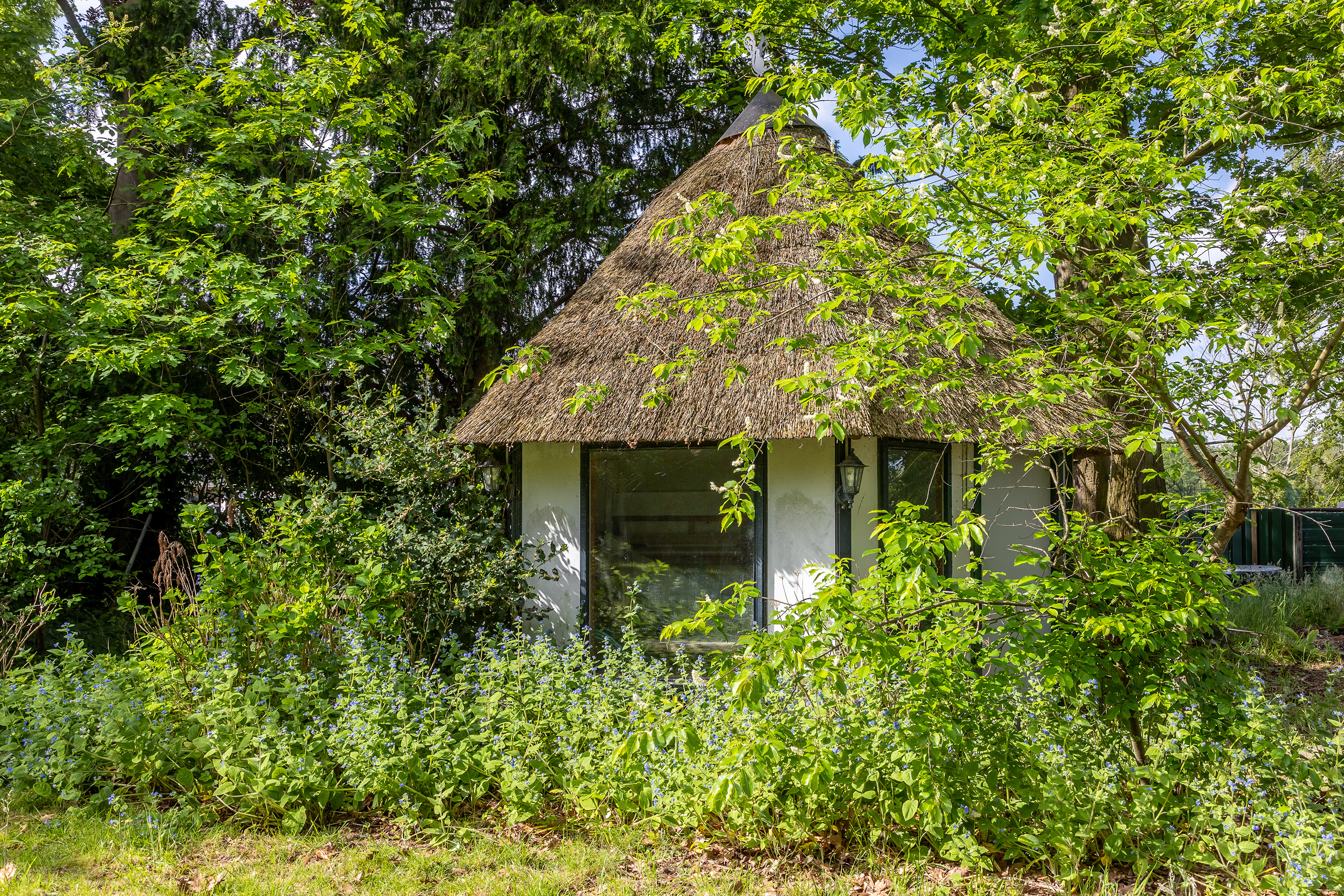 The property also includes several outbuildings: a fully insulated stone barn with heating, offering flexibility for various uses; a detached garage with pitched roof, ideal for storage; and a charming thatched garden house which enhances the rural charm of the estate.