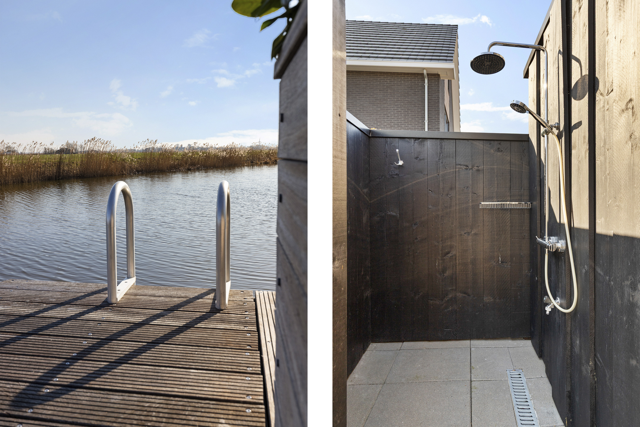 Thanks to the corner location on the water, the property enjoys a generous sun deck flanked by two luxury mooring docks, one with a swimming ladder. The enclosed stylish outdoor shower is a welcome addition for swimmers. The water in front of the property is calm, partly private, and connects directly to the Bolswardervaart.